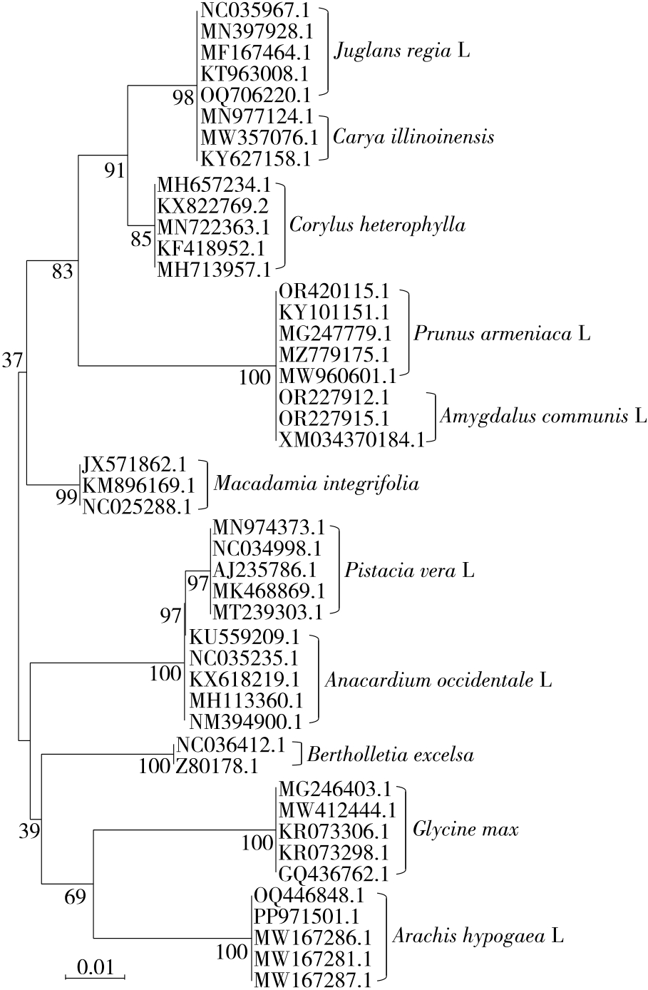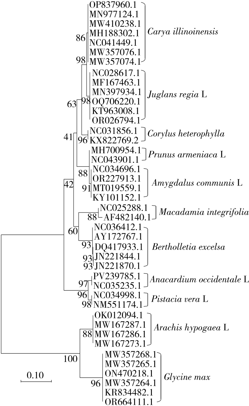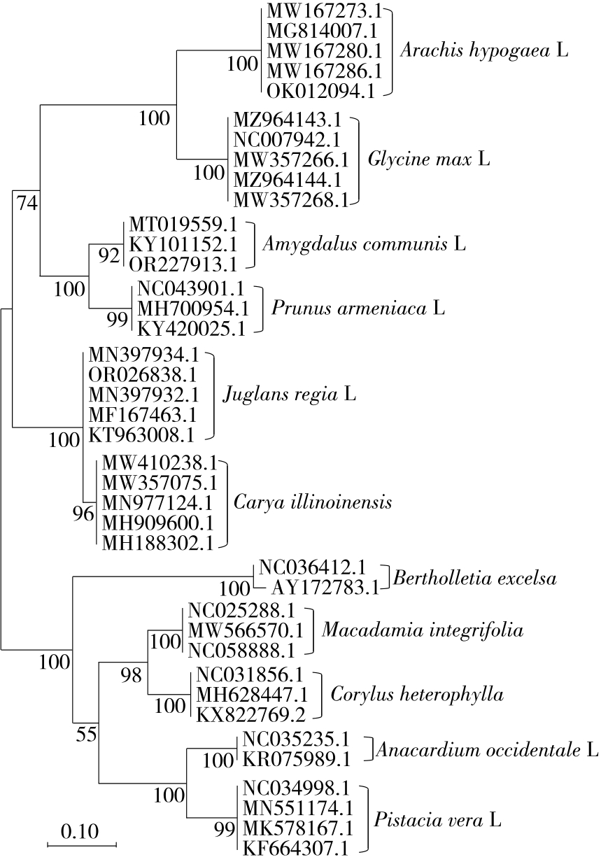 摘要:目的 建立食品中植物源性过敏原鉴定的DNA条形码检测方法。方法 采用psbA-trnH、trnl和rbcl 3种分子标记对榛果、巴西坚果、澳洲坚果、核桃、山核桃、杏仁、扁桃仁、腰果、开心果、花生和大豆共11个植物源性过敏原物种进行鉴定。从GenBank获取各物种的psbA-trnH、trnl和rbcl基因序列,使用MEGA 11软件进行序列比对、遗传距离计算、系统发育树构建。结果 在psbA-trnH、trnl和rbcl 3个基因序列中,psbA-trnH序列的种间遗传距离差异最大,平均种间遗传距离达0.527 3,高于trnl和rbcl基因序列的。从邻接法(NJ)构建的系统发育树分析结果来看,基于psbA-trnH和trnl序列构建的系统发育树具有良好的分支结构,不同物种能够准确聚类。相比之下,rbcl序列构建的系统发育树无法实现核桃和山核桃、杏仁和扁桃仁的有效区分。综合分析,psbA-trnH序列是区分坚果、花生和大豆等11个物种的最优DNA条形码。将psbA-trnH条形码检测与高通量测序技术相结合用于15个实际样品检测,可以同时检测出多种过敏原成分。结论 psbA-trnH序列作为DNA条形码,能够精准识别常见植物源性过敏原成分。