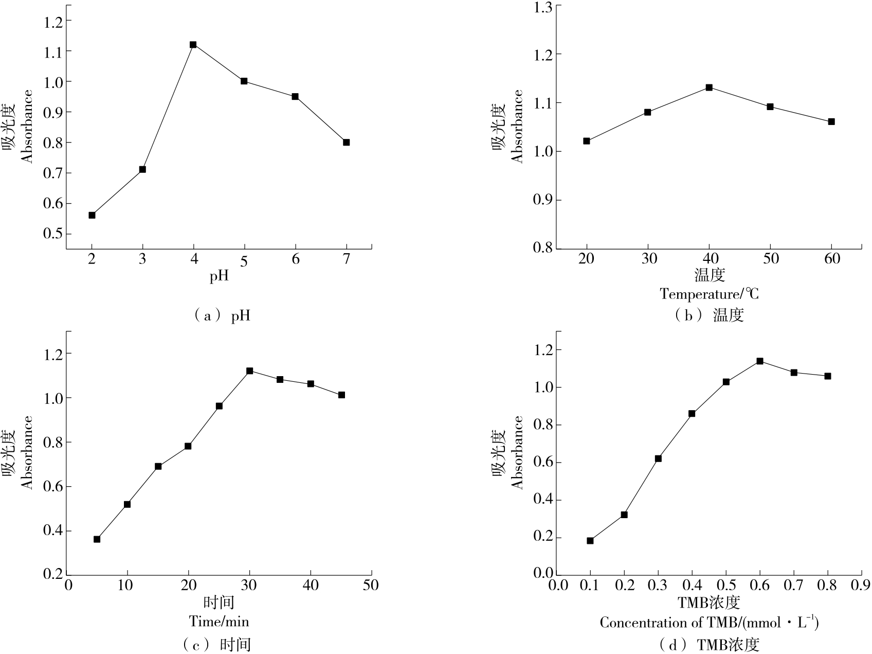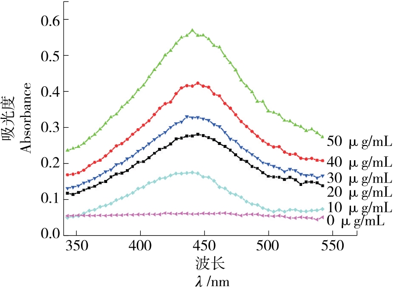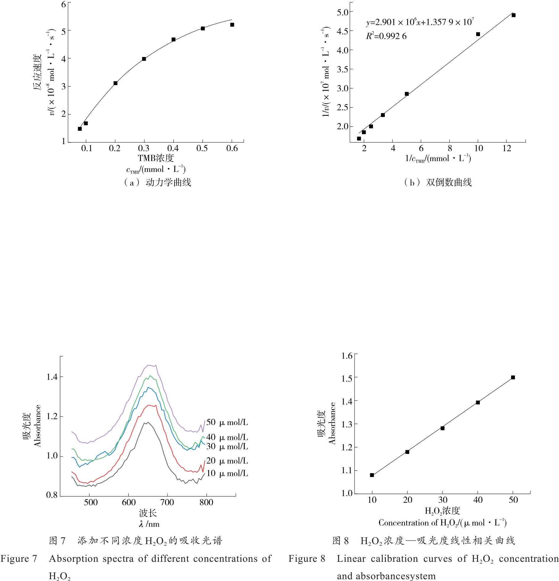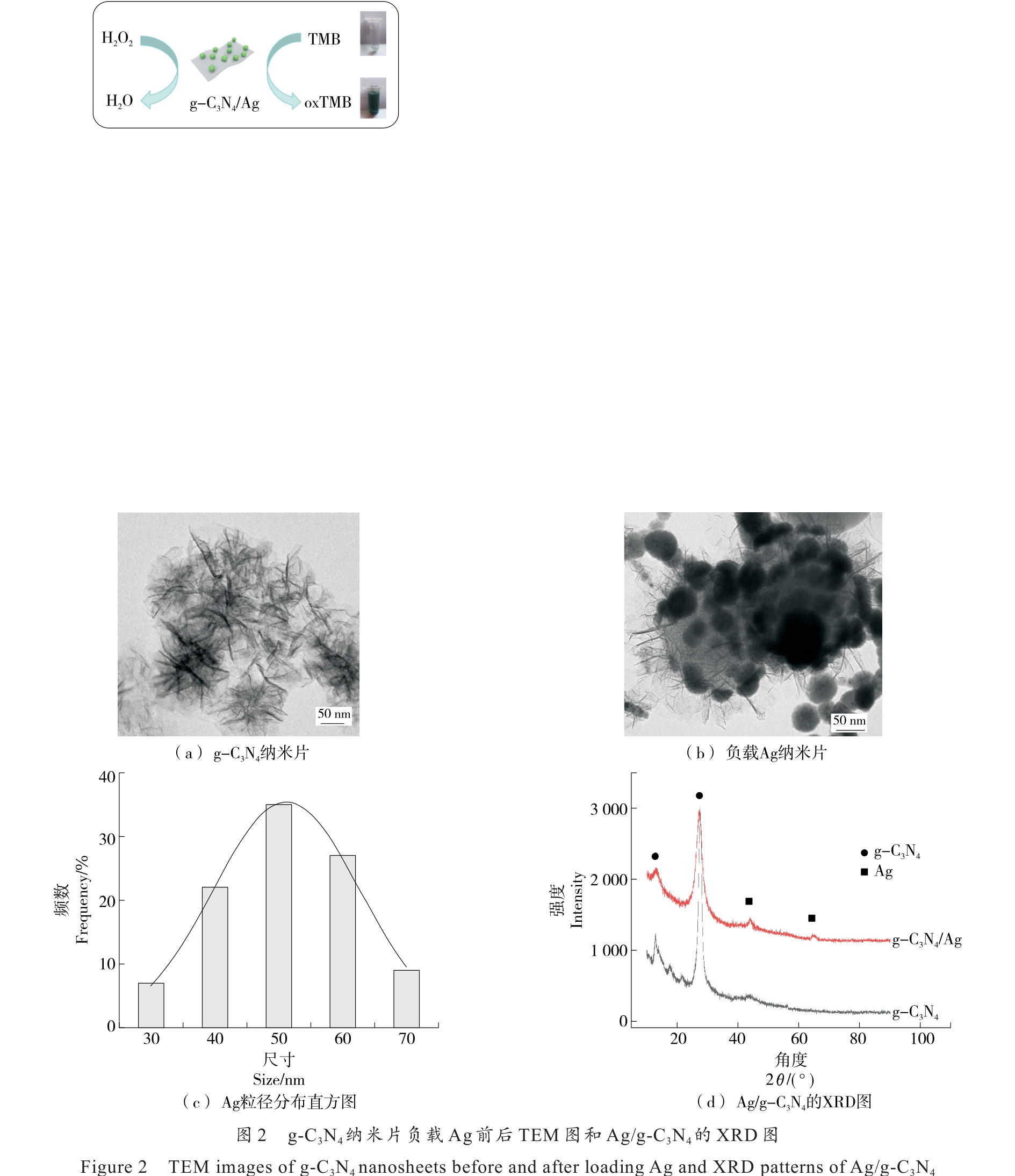 摘要:目的 构建一种快速检测H2O2的比色分析方法,用于检测牛奶中H2O2。方法 通过还原法将纳米Ag负载在g-C3N4纳米片材料表面,制备出一种新型复合纳米酶材料Ag/g-C3N4。采用X-射线衍射、透射电子显微镜对其结构和形貌进行表征。优化了Ag/g-C3N4催化TMB-H2O2显色反应条件,进行了催化机理和稳态动力学分析。结果 Ag/g-C3N4材料具有良好的类过氧化物酶活性,酶催化反应遵循Michaelis-Menten动力学模型。比色检测体系最佳检测H2O2范围为10~50 μmol/L,检出限为0.05 μmol/L。将该方法用于实际牛奶中H2O2检测时,回收率为99.47%~102.83%。结论 试验构建的比色分析方法制备简单,成本低,灵敏度高,有良好的操作性和实用性。
