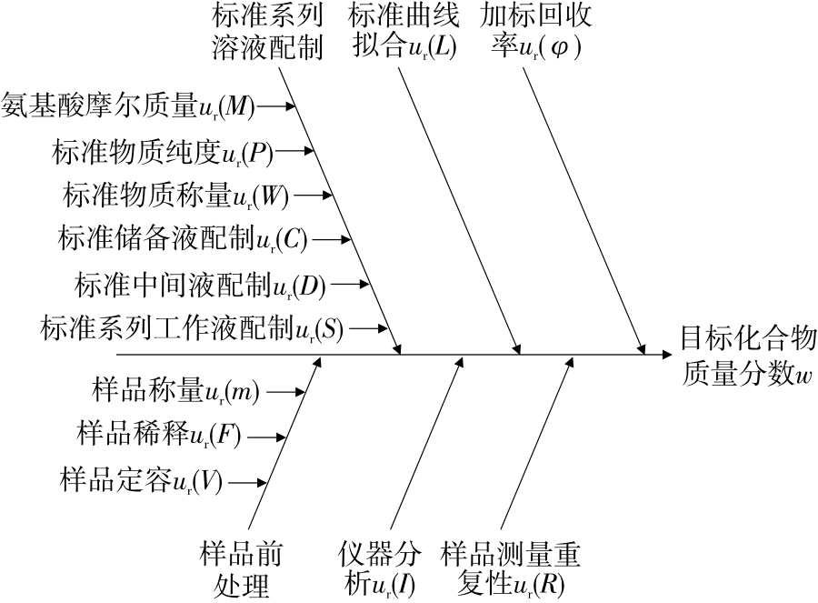 摘要:目的 评定氨基酸分析仪测定羊奶粉中含硫氨基酸的不确定度。方法 通过建立数学模型和不确定度来源鱼骨图,分析和量化引入的不确定度分量,计算合成不确定度和扩展不确定度。结果 当胱氨酸和半胱氨酸质量分数为0.305 g/100 g、蛋氨酸质量分数为0.338 g/100 g时,其扩展不确定度分别为0.022,0.023 g/100 g(k=2)。结论 该方法不确定度主要来源于标准物质称量、样品称量和标准系列工作液配制,在样品检测过程中应严格控制。