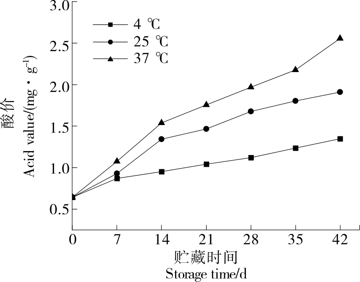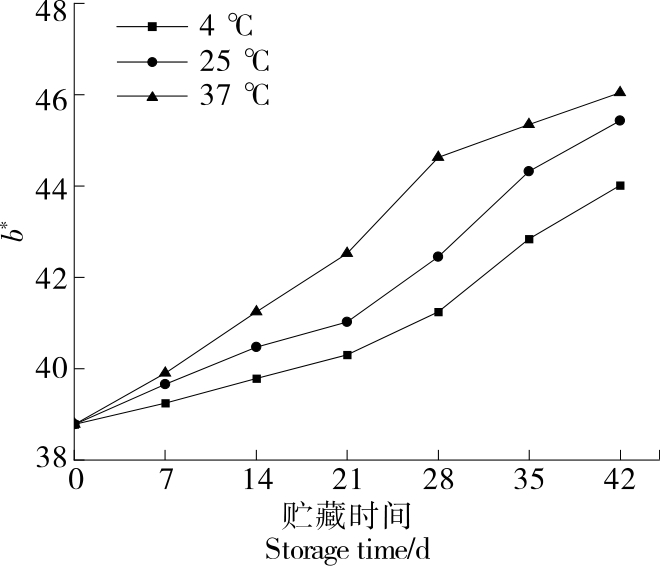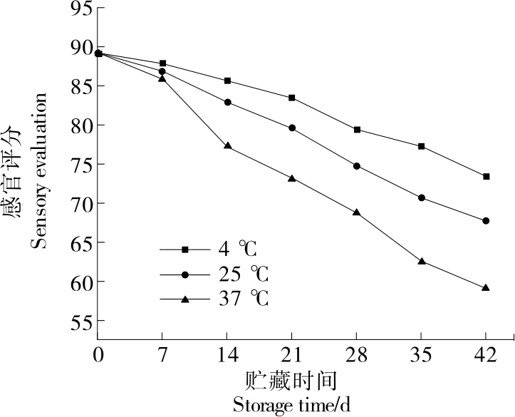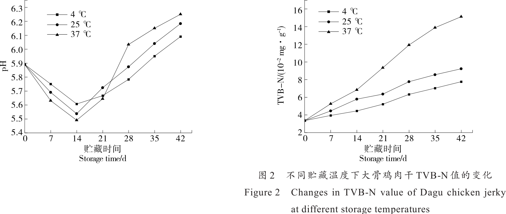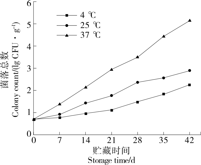 摘要:目的 探究贮藏温度对大骨鸡肉干品质的变化规律,并建立基于TBARS值和菌落总数的大骨鸡肉干货架期预测模型。方法 将大骨鸡肉干分别于4,25,37 ℃下贮藏,测定其pH值、挥发性盐基氮(TVB-N)、硫代巴比妥酸值(TBARS)、酸价(AV)、色泽、质构、感官特性及菌落总数变化,并运用Arrhenius方程建立以菌落总数、TBARS值和TVB-N值为品质指标的大骨鸡肉干货架期动力学模型。结果 在3种不同温度下贮藏42 d,大骨鸡肉干的pH值呈先下降后上升趋势,感官评分及L*值呈下降趋势,菌落总数、AV、TBARS值、a*值和b*值均呈上升趋势,硬度和弹性逐渐降低。大骨鸡肉干菌落总数、TBARS值和TVB-N值的活化能分别为24 719.859 0,18 027.872 2,21 092.791 0 kJ/mol,指前因子k0分别为1 375.950 4,30.244 1,898.026 9。经验证,以TBARS值为品质指标的预测模型的相对误差均>10%,以菌落总数和TVB-N值为品质指标的预测模型相对误差在±10%以内,预测效果好。结论 以菌落总数和TVB-N值为品质因子的预测模型可以有效预测4~37 ℃贮藏条件下大骨鸡肉干的货架期。