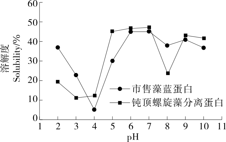 摘要:目的 探究反复冻融法制备钝顶螺旋藻分离蛋白(Spirulina platensis protein isolate,spPI)条件,对比分离蛋白和市售藻蓝蛋白(commercially processed phycocyanin,cpPC)的理化特性。方法 考察浸泡时间、料液比、冻结时间和冻融次数对分离蛋白提取率的影响;测定分离蛋白和市售藻蓝蛋白的理化特性。结果 浸泡16 h,料液比1∶20 (g/mL),冻结时间9 h,冻融次数10次,蛋白质提取率最佳,为(29.74±0.16)%。分离蛋白和市售藻蓝蛋白在pH 3,4时分别呈现最低溶解度,在pH 5~7,6~7范围内呈现最高溶解度。分离蛋白具有更好的起泡性和泡沫稳定性。分离蛋白和市售藻蓝蛋白在pH 6~7,7时乳化活性最强。结论 相较于分离蛋白,市售藻蓝蛋白拥有更高的总巯基、游离巯基和二硫键含量。钝顶螺旋藻分离蛋白拥有更好的溶解性和起泡性。