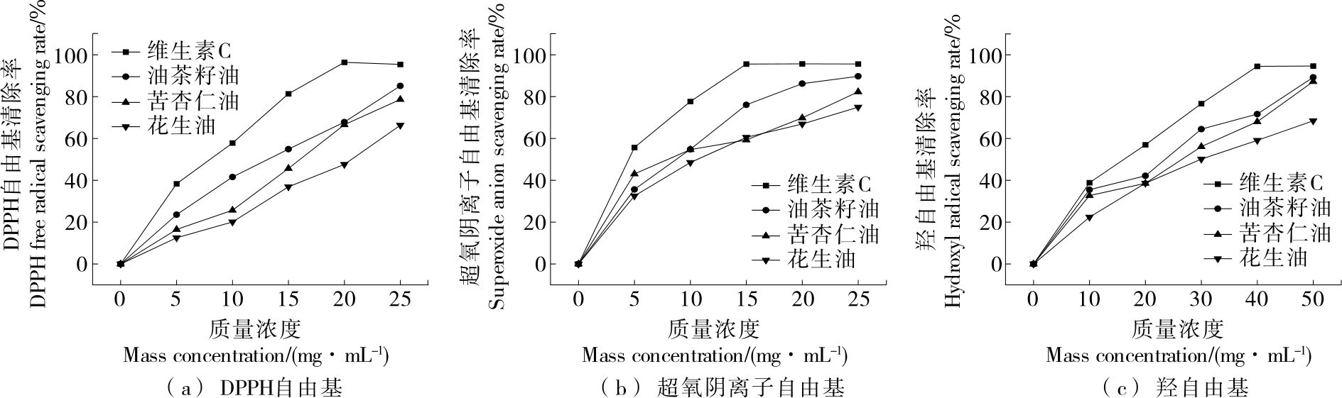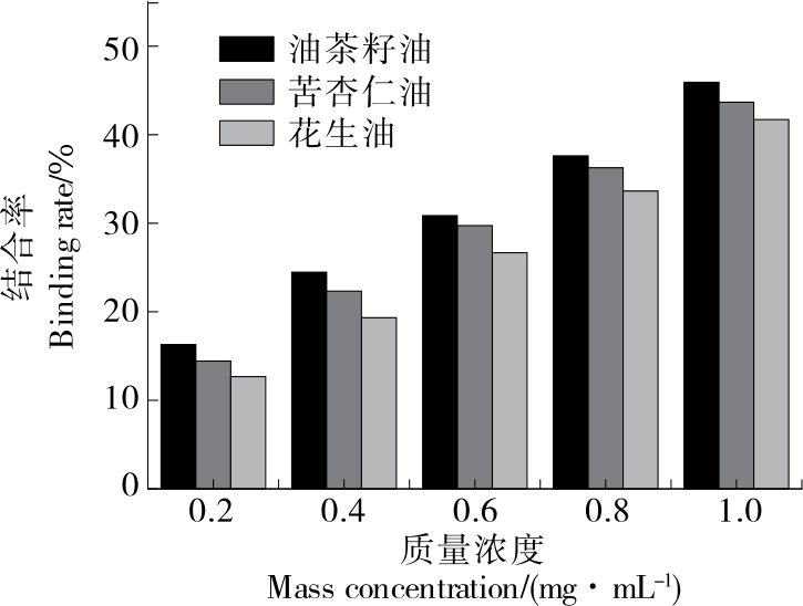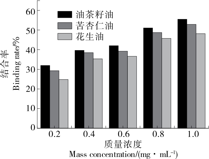 摘要:目的 探究油茶籽油、苦杏仁油、花生油的抗氧化活性及降血脂功能。方法 通过体外抗氧化试验、体外降血脂试验对3种油脂的抗氧化和降血脂活性进行了评价。结果 DPPH自由基清除能力排序为油茶籽油>苦杏仁油>花生油,超氧阴离子自由基清除能力排序为油茶籽油>苦杏仁油>花生油,羟自由基清除能力排序为油茶籽油>苦杏仁油>花生油。在1 mg/mL的质量浓度下,油茶籽油对牛磺胆酸盐和甘氨胆酸盐的结合率分别为46.72%,56.14%;苦杏仁油对牛磺胆酸盐和甘氨胆酸盐的结合率分别为45.73%,52.87%;花生油对牛磺胆酸盐和甘氨胆酸盐的结合率分别为43.67%,55.23%。结论 油茶籽油体外抗氧化能力和降血脂作用皆最佳,可进一步开发和利用。