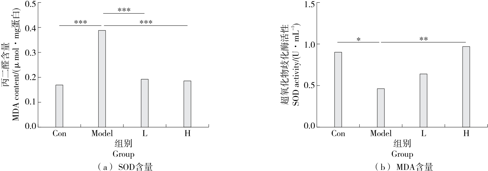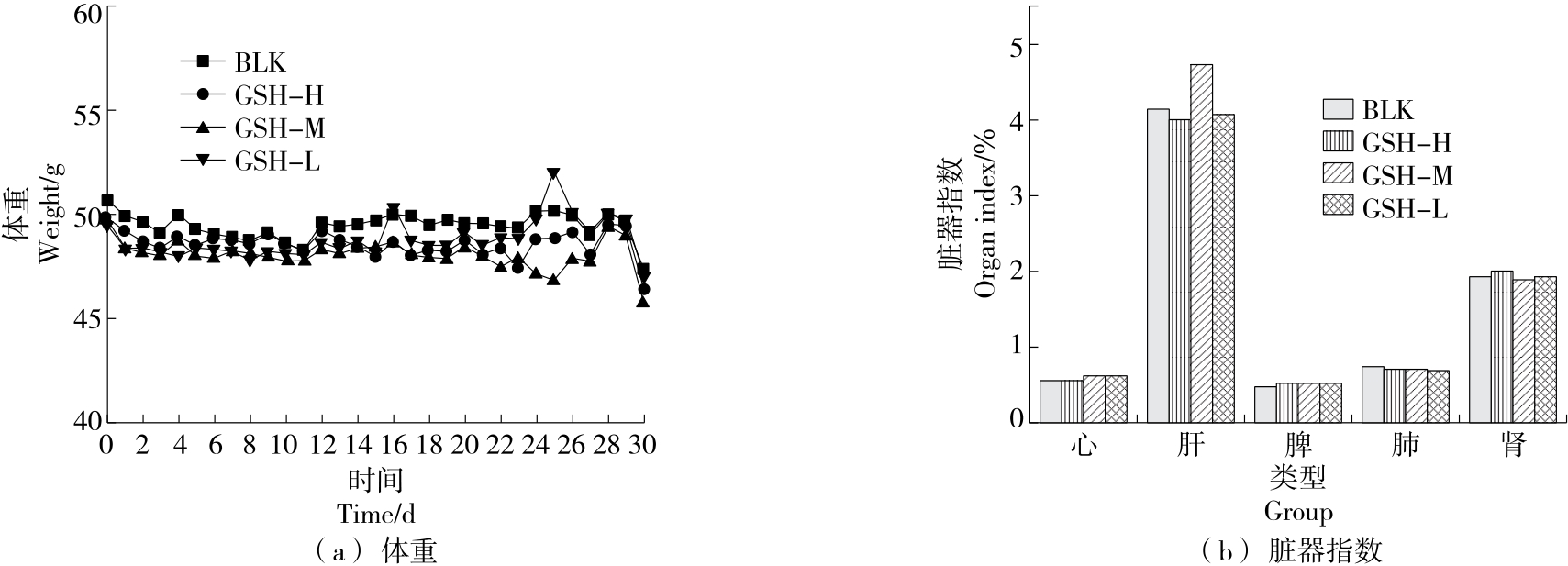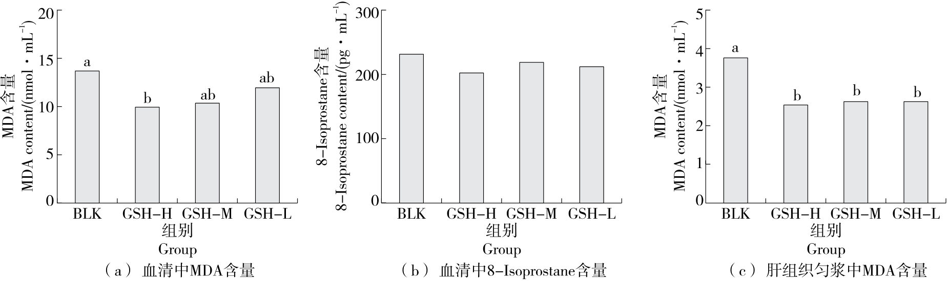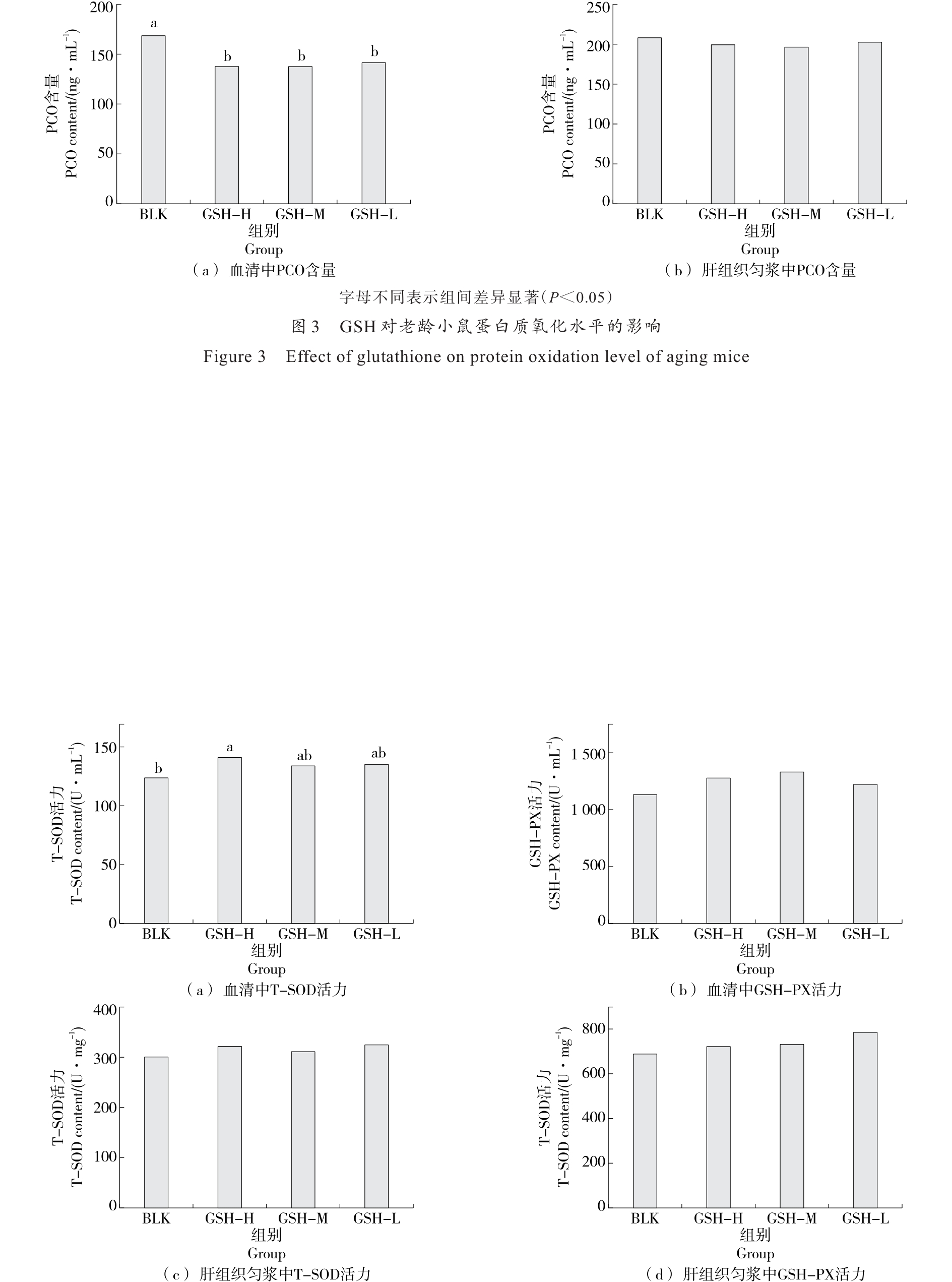 摘要:目的 探究外源性谷胱甘肽对老龄小鼠体内抗氧化能力的改善作用。方法 选取老龄小鼠作为研究对象,连续30 d灌胃不同剂量的谷胱甘肽(166.7,83.3,41.7 mg/kg),测定小鼠血清和肝组织匀浆中丙二醛(MDA)、8-异构前列腺素、蛋白质羰基(PCO)和还原型谷胱甘肽含量,以及总超氧化物歧化酶(T-SOD)和谷胱甘肽过氧化酶(GSH-PX)活力。结果 与空白对照组相比,外源性谷胱甘肽高剂量组能够显著降低老龄小鼠体内MDA和PCO含量,提高小鼠血清中T-SOD活力,提高老龄小鼠体内还原型谷胱甘肽含量(P<0.05),且受试物对老龄小鼠体重增长及脏器指数无不良影响。结论 谷胱甘肽对机体衰老过程中的氧化应激状态具有良好的改善作用。
