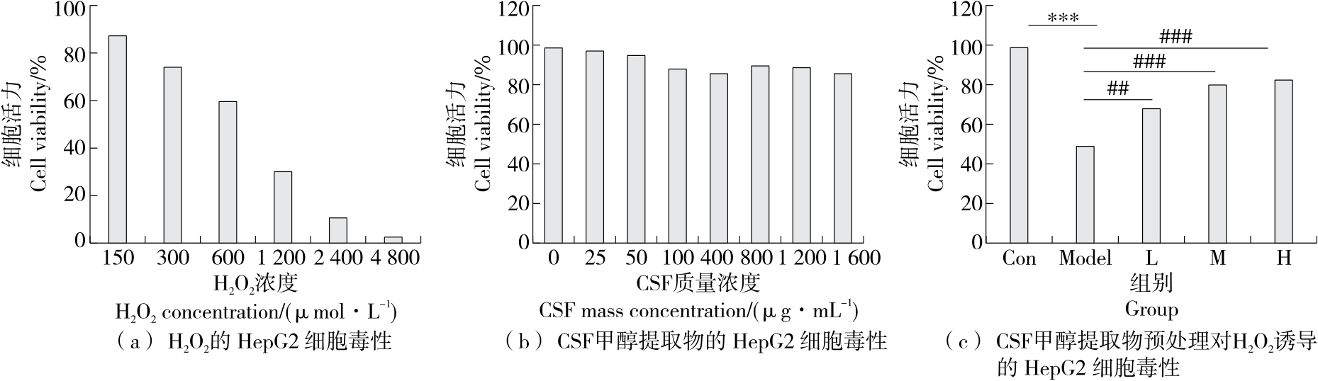 摘要:目的 探究一种复合主食(compound staple food,CSF)对H2O2诱导人体肝癌细胞(HepG2)的氧化损伤的保护作用及机制。方法 通过DPPH自由基和ABTS自由基清除试验评估CSF的体外抗氧化能力。采用H2O2诱导HepG2细胞建立氧化应激模型,利用CCK-8法测定其对细胞存活率的影响;通过检测活性氧(ROS)、线粒体膜电位(JC-1)、丙二醛(MDA)和超氧化物歧化酶(SOD)含量,评估CSF对细胞氧化应激的影响,采用细胞流式检测CSF对细胞凋亡的影响,通过Western Blot分析氧化损伤相关蛋白(Nrf2、HO-1、NQO-1、Bax、Bcl2)的表达变化。结果 CSF能够有效清除DPPH自由基和ABTS自由基。与模型组相比,治疗组提高了H2O2诱导的HepG2细胞存活率,降低了ROS水平,减缓了线粒体膜电位下降,增加了SOD活性,降低了MDA含量,并减轻了Nrf2核易位。CSF处理可减少细胞凋亡率,与模型组相比细胞凋亡率减少了8%。Western Blot结果表明,CSF可上调Nrf2、HO-1和NQO-1的表达,增加Bcl2水平,并下调Bax表达。结论 CSF通过激活Nrf2/HO-1通路、调节Bcl2/Bax通路改善H2O2导致的HepG2细胞氧化损伤。