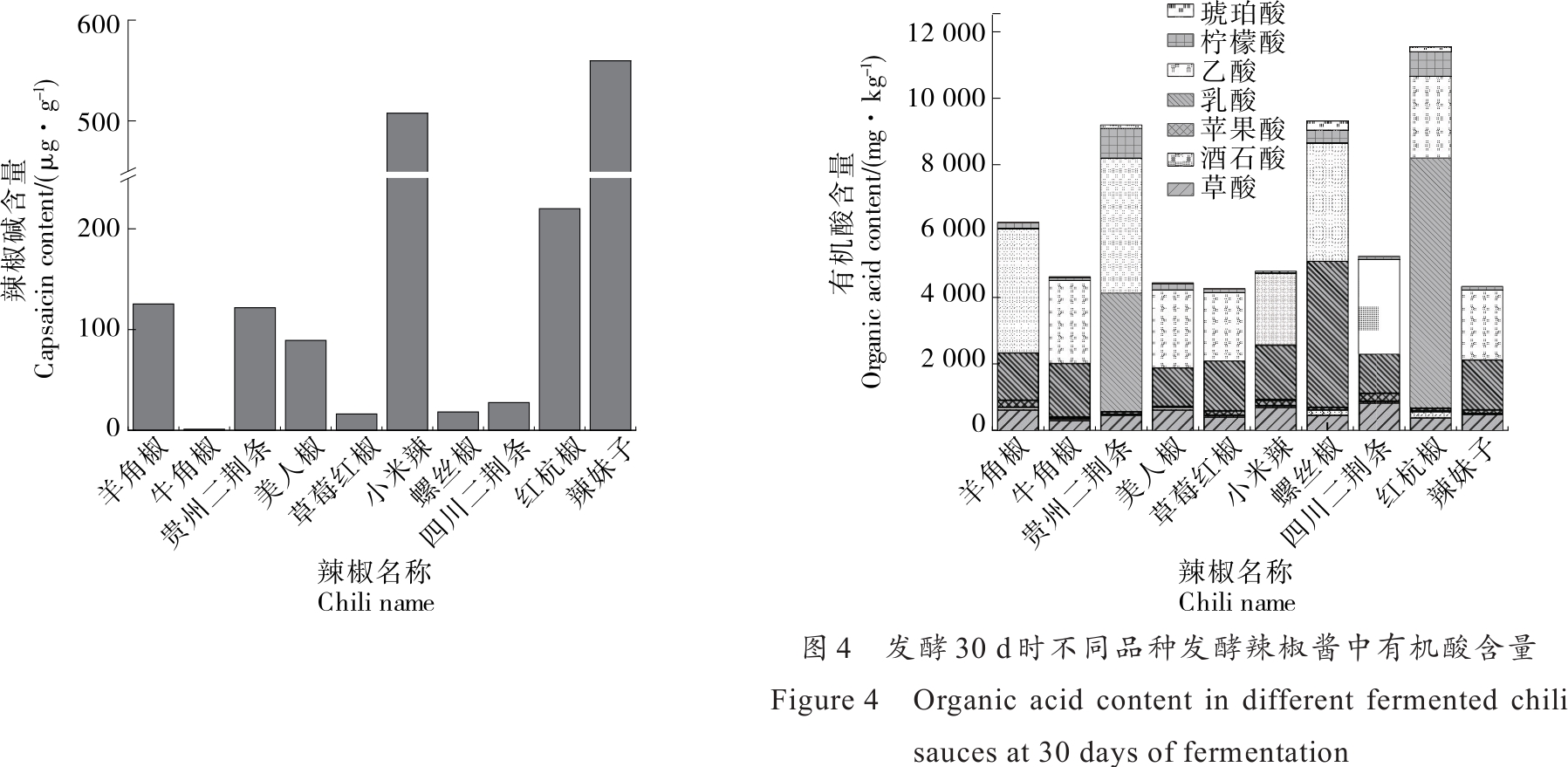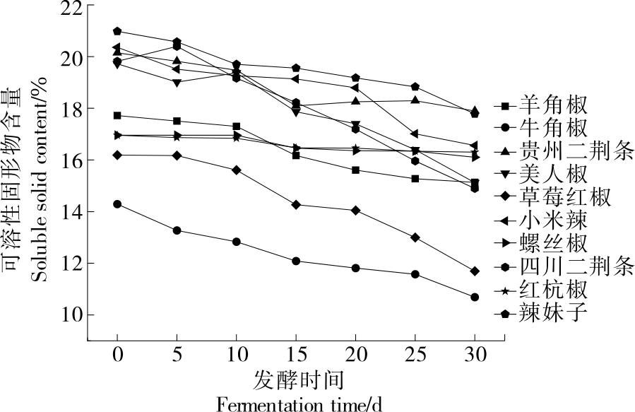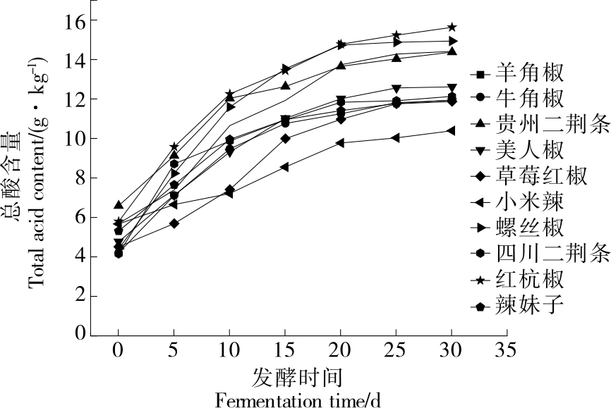 摘要:目的 筛选适宜制备红酸汤半成品辣椒酱的原料辣椒品种。方法 以贵州10种优质辣椒为研究对象,研究不同品种成熟的新鲜辣椒在发酵过程中色泽、总酸、亚硝酸盐、氨基酸态氮、可溶性固形物等品质指标的变化特点以及发酵结束时的辣椒碱和有机酸含量,并对辣椒酱半成品进行感官评价。结果 贵州二荆条、羊角椒、红杭椒、螺丝椒在发酵过程中具有较好的产酸能力、较低的亚硝酸盐含量、较高的氨基酸态氮含量和有机酸含量,且色泽保持较好,整体品质较为优良。小米辣、辣妹子在发酵过程中能保持明亮鲜艳的色泽,但产酸能力、亚硝酸盐含量等指标相对较弱,辣椒碱含量较高,风味协调性不足,感官接受度较低。采用牛角椒制备的辣椒酱半成品辣椒碱含量最低,仅为1.12 μg/g,但在发酵过程中产酸能力较弱,亚硝酸盐含量较高,峰值可达16.49 mg/kg。美人椒、草莓红椒色泽鲜艳,辣度适中,但亚硝酸盐含量较高。对发酵辣椒酱半成品进行主成分分析发现辣椒酱半成品中的发酵品质指标之间存在关联性,进一步构建适用于原料辣椒品种影响红酸汤半成品辣椒酱发酵品质的综合评价模型为Y=0.525Y1+0.286Y2+0.113Y3。结论 红杭椒、贵州二荆条、羊角椒、螺丝椒辣椒酱半成品色泽鲜红明亮,具有典型乳酸发酵香味且品质综合得分较高,适宜用作红酸汤半成品辣椒酱发酵的原料。