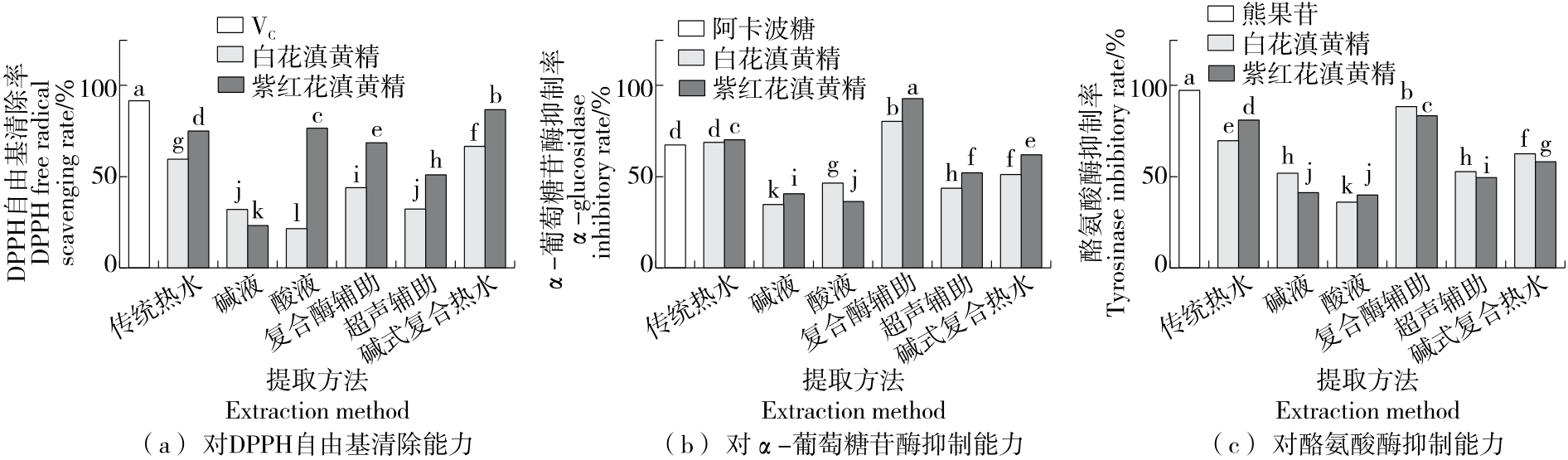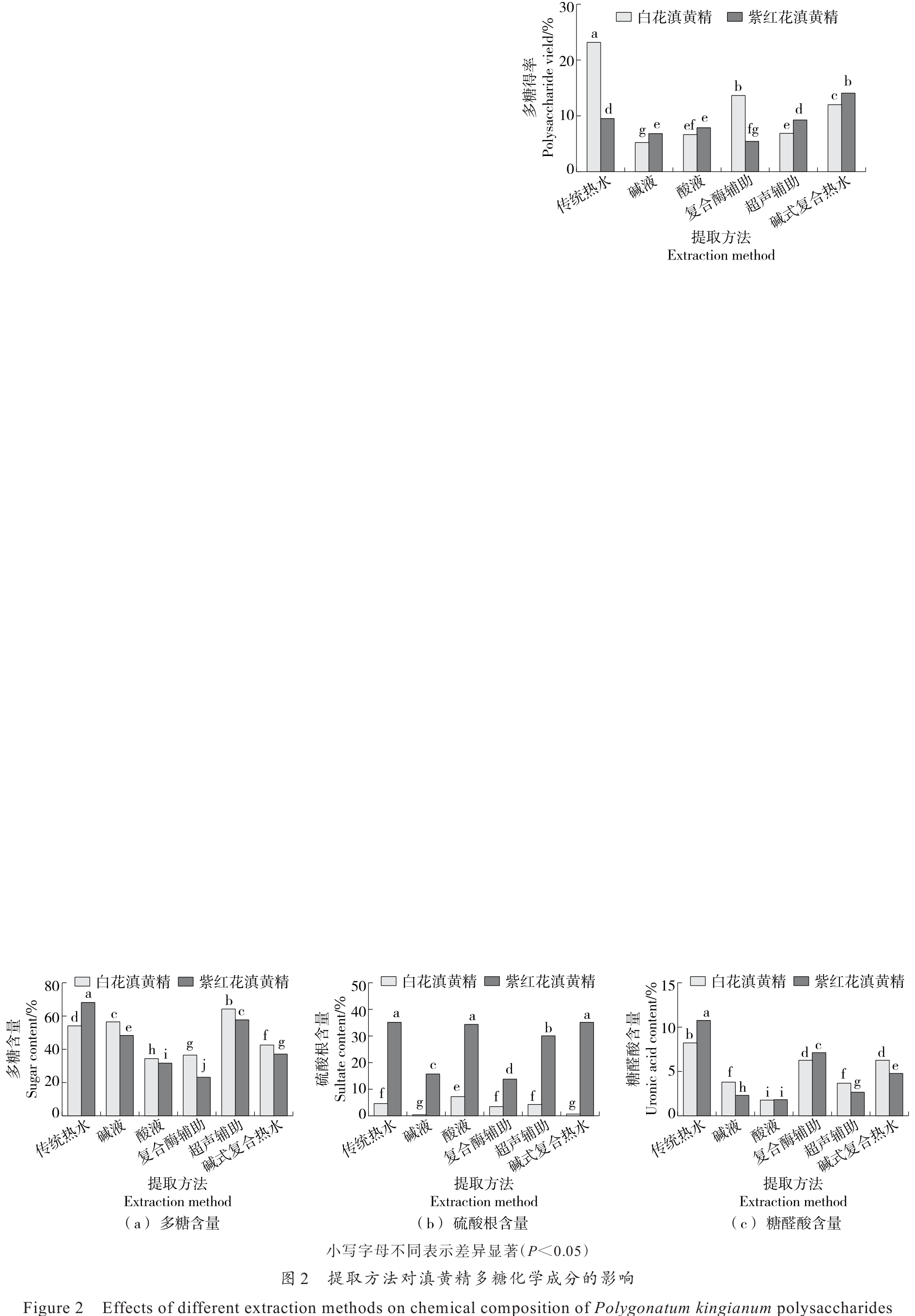 摘要:目的 探讨提取方法对白花和紫红花滇黄精多糖的化学组成及其功能特性的影响。方法 采用传统热水法、碱液法、酸液法、复合酶辅助法、超声辅助法和碱式复合热水法提取多糖,并测定所得多糖的得率、总糖、硫酸根、糖醛酸、DPPH自由基清除能力、α-葡萄糖苷酶抑制能力及酪氨酸酶抑制活性的变化情况。结果 滇黄精多糖的得率及其化学组成成分受提取方法和品种的影响显著。其中,采用传统热水法提取的白花和紫红花滇黄精多糖的得率分别为23.27%和9.58%,总糖含量分别为54.53%和68.59%,硫酸根含量分别为7.28%和35.41%,糖醛酸含量分别为8.26%和10.84%,均表现出较高的水平。此外,滇黄精多糖的DPPH自由基清除能力、α-葡萄糖苷酶抑制能力及酪氨酸酶抑制活性也受到提取方法和品种的影响。通过综合量化评价得出,紫红花滇黄精在这3项功能特性上表现更为优越,复合酶辅助法和传统热水法可作为生产优质滇黄精多糖的有效提取方法。结论 复合酶辅助法和传统热水法是提取滇黄精多糖的最佳方法。