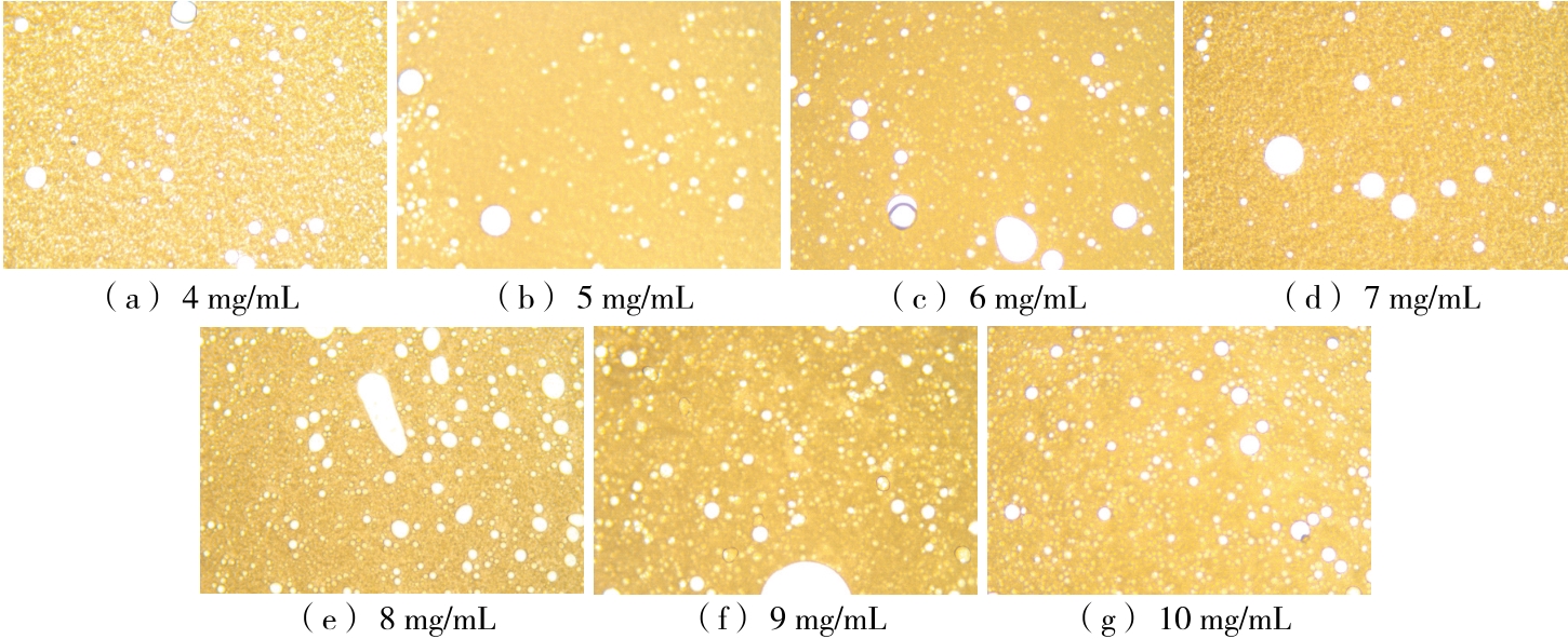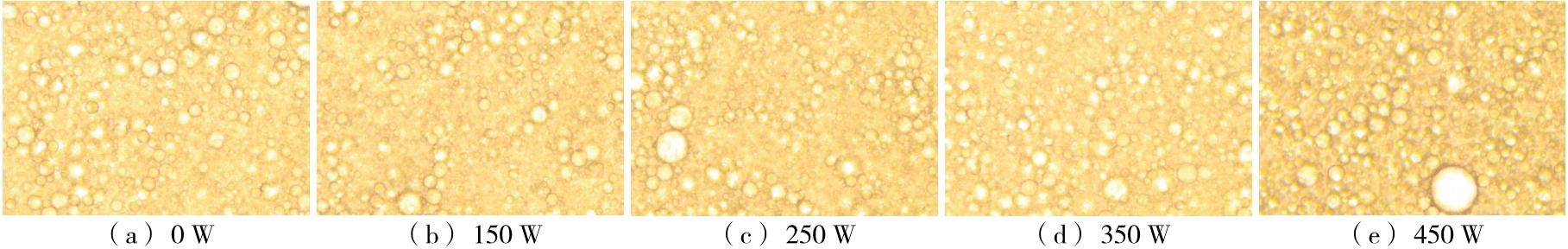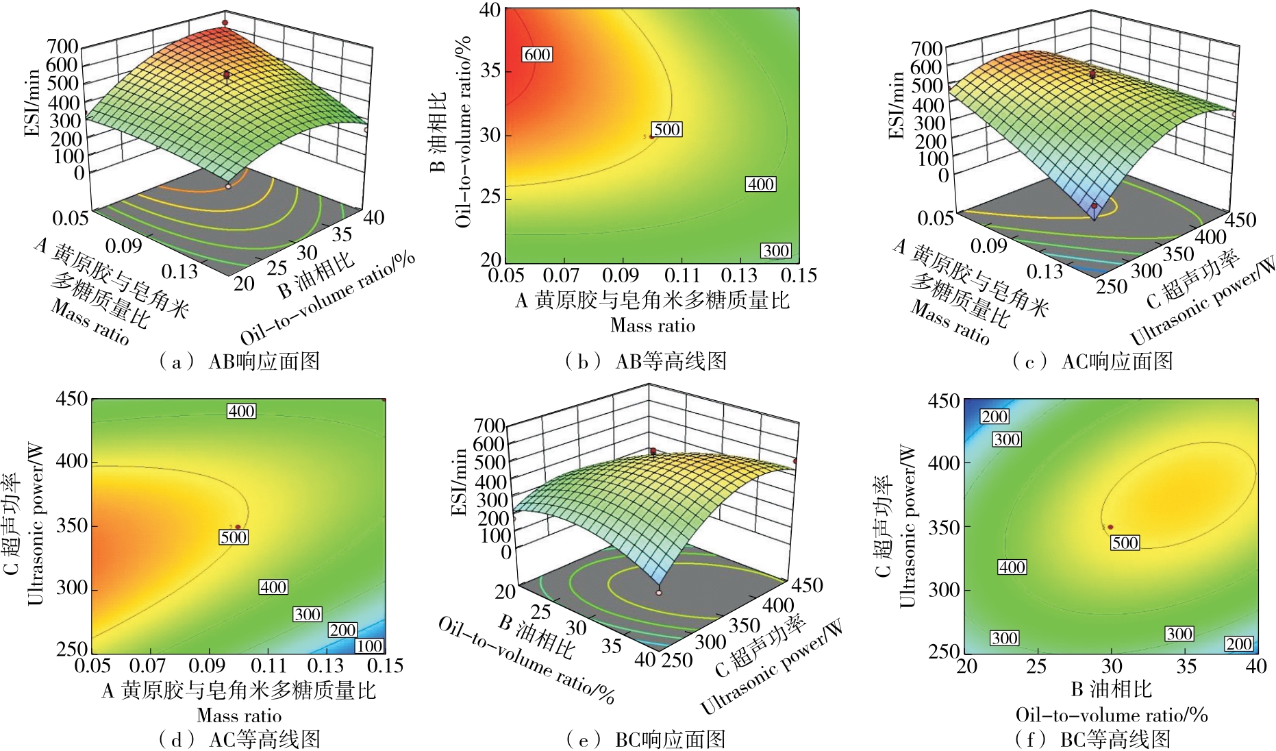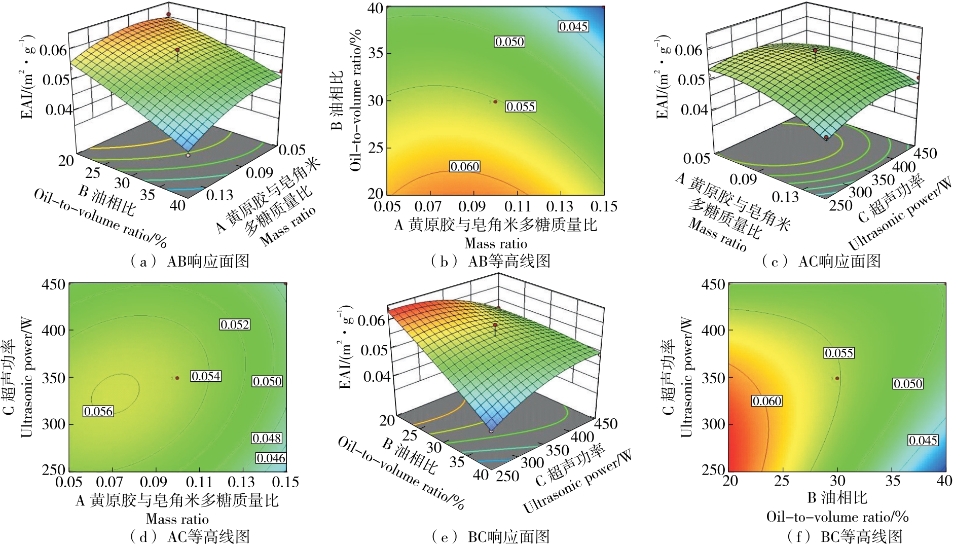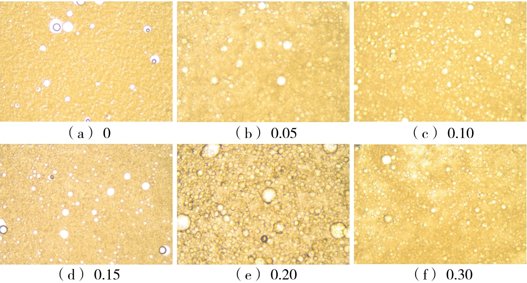 摘要:目的 探究黄原胶—皂角米多糖Pickering乳液超声辅助制备的最佳工艺及稳定性。方法 以皂角米多糖、黄原胶为复合胶体颗粒,玉米油为油相,在黄原胶与皂角米多糖质量比、油相比及超声功率等单因素试验基础上,以乳化活性(EAI)和乳化稳定性(ESI)为指标,通过响应面法优化黄原胶—皂角米多糖Pickering乳液的制备工艺,考察Pickering乳液热稳定性以及盐稳定性。结果 黄原胶—皂角米多糖Pickering乳液的最佳制备工艺:皂角米多糖质量浓度10 mg/mL,黄原胶与皂角米多糖质量比0.05,油相比30%,超声功率350 W,该条件下乳液的乳化活性为(0.056 0±0.000 8) m2/g,乳化稳定性为(575.98±5.45) min;乳液在25~50 ℃及NaCl浓度为0~100 mmol/L的条件下具有良好的乳化稳定性。结论 将黄原胶与皂角米多糖复配,通过超声辅助制备Pickering乳液,改善了乳液的乳化特性,提高了稳定性。