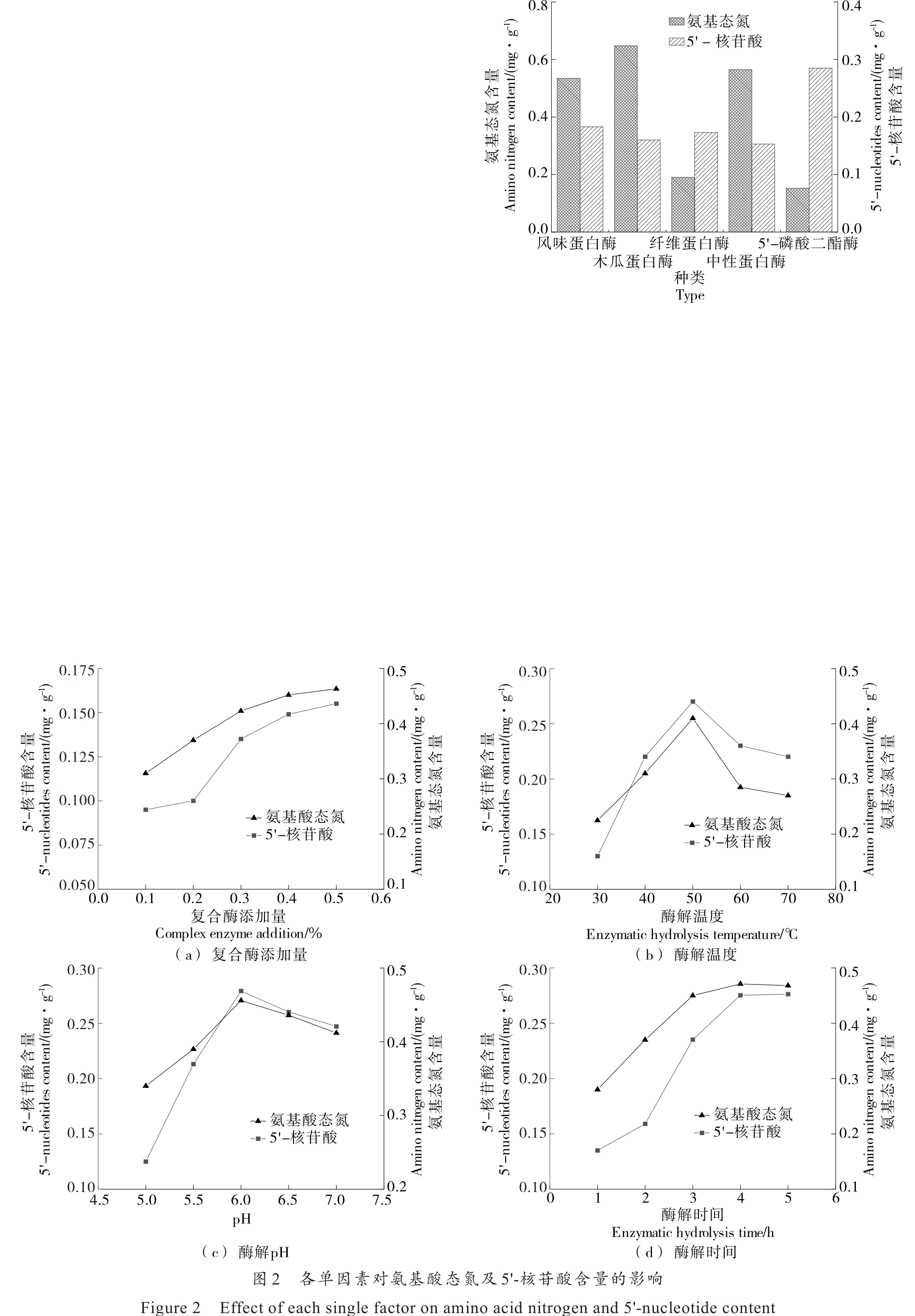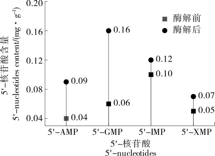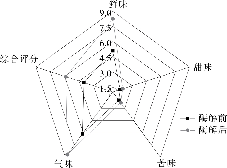 摘要:目的 研究酶解工艺对香菇风味物质的影响。方法 采用优化后的酶解工艺,以游离氨基酸、5'-核苷酸、等效鲜味浓度(EUC)、挥发性风味物质及感官评价为指标,多角度探讨酶解工艺对香菇风味物质的影响。结果 酶解后,香菇中游离氨基酸含量为19.85 mg/g,为酶解前的1.45倍,其中谷氨酸和天冬氨酸含量分别提升了83.80%,27.13%;5'-核苷酸含量为0.44 mg/g,为酶解前的1.76倍,其中5'-GMP含量提升了166.67%,5'-AMP提升了125.00%;EUC为63.35 g/100 g,为酶解前的2.03倍。酶解前后挥发性成分种类及数量也有较大差异,酶解后综合感官评分显著提高。结论 酶解工艺对香菇中非挥发性风味成分提升有明显效果,并显著改变了香菇的挥发性成分。