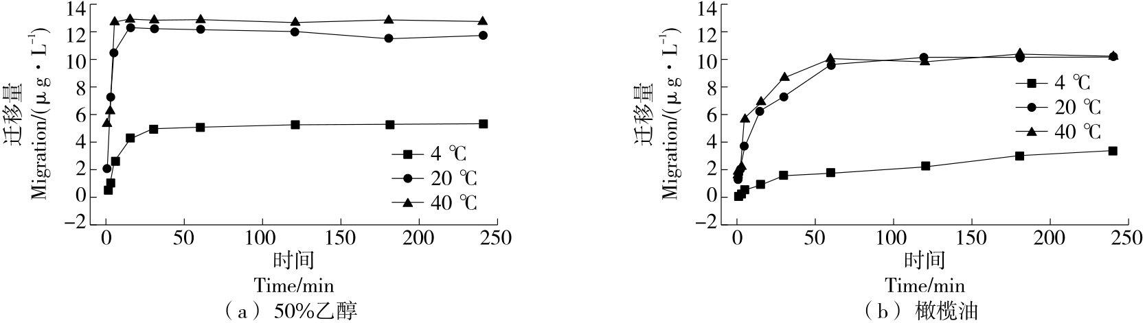 摘要:目的 探索可降解食品接触材料中22种有机磷阻燃剂(OPFRs)迁移量的测定方法和迁移规律。方法 样品分别经4种食品模拟液浸泡,10%乙醇和3%乙酸模拟物经乙腈提取、NaCl盐析处理,橄榄油经甲醇—乙腈(体积比2∶3)提取,50%乙醇食品模拟物过滤后直接测定;OPFRs提取物经C18色谱柱分离,三重四级杆质谱正离子(ESI+)、多反应监测模式测定,基质外标法定量;分析磷酸三苯酯(TPhP)在模拟物中的迁移规律,并应用于可降解食品包装袋和一次性手套中OPFRs迁移量的测定。结果 22种OPFRs加标回收率为76.7%~119.9%,相对标准偏差为0.23%~11.30%,检出限为0.06~1.14 μg/L,定量限为0.20~3.75 μg/L。可降解食品接触材料中TPhP向50%乙醇和橄榄油迁移时,随着浸泡时间和温度的增加,迁移量呈增长趋势。26个样品中OPFRs迁移量样品检出率为76.9%,检出物质为TPhP,仅在50%乙醇和橄榄油中有迁移。结论 可降解食品包装袋和一次性手套长时间接触含油脂食品或乳制品等存在OPFRs迁移至食品中的安全风险。