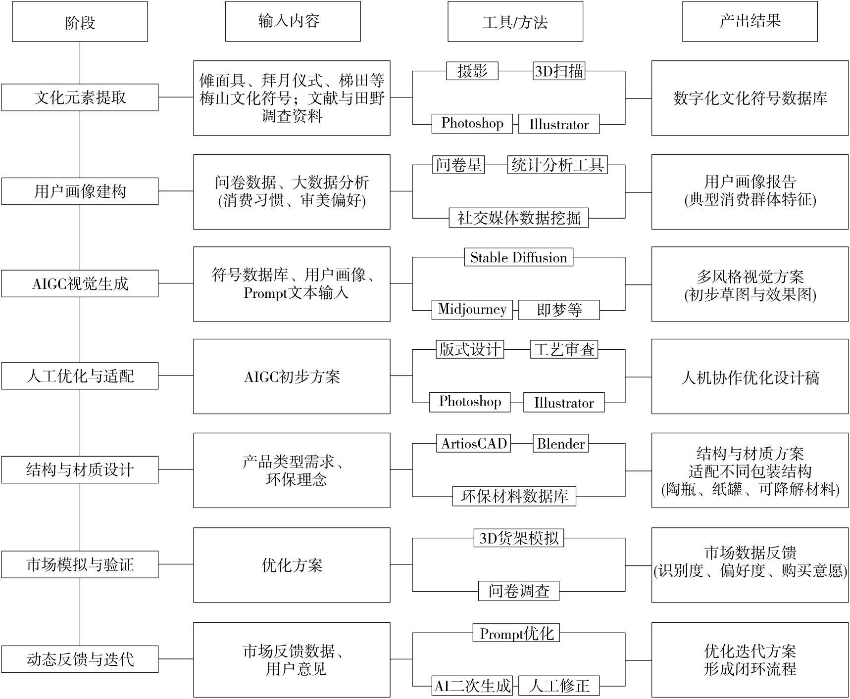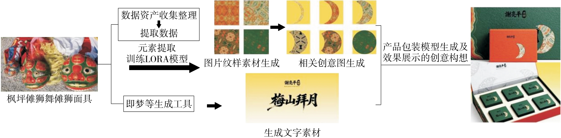 摘要:研究探讨了梅山非遗食品包装的文化内涵、现存问题与创新设计路径。发现,当前梅山非遗食品包装在运用傩面具等文化元素传达地方特色方面表达方式单一、流程效率低、市场验证不足等问题依然突出,导致了产品市场吸引力弱化。为此,基于系统性思维引入人工智能生成内容(AIGC),构建了涵盖文化元素数字化提取、本地化用户画像构建、AIGC驱动的视觉创意生成、结构优化设计、结构与材质设计、市场效果模拟以及动态反馈迭代7个阶段的设计流程模型。以“谢亮平”月饼系列食品为案例进行验证,结果表明,该模型不仅提升了设计效率、降低了试错成本,还增强了文化识别与审美共鸣。