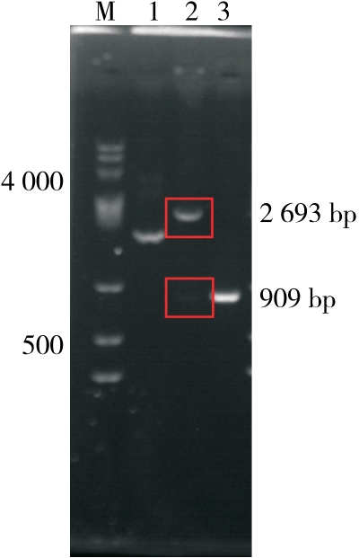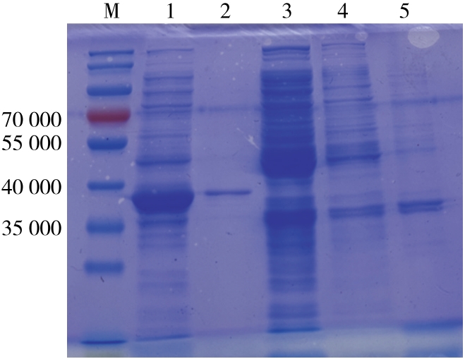 摘要:目的 获得重组原肌球蛋白(tropomyosin,TM)。方法 先从National Center of Biotechnology Information(NCBI)数据库获得TM同源蛋白的基因序列,并据此设计特异性引物,再以凡纳滨对虾虾肉cDNA为模板,PCR扩增并测序分析了凡纳滨对虾TM编码基因序列,最后利用大肠杆菌异源重组表达载体pET29a,构建了凡纳滨对虾TM的原核重组表达体系。结果 RNA样品经琼脂糖凝胶电泳后,条带清晰明亮、泳道无弥散区,cDNA样品在300 bp左右有清晰条带,说明该研究成功提取了结构完整的凡纳滨对虾虾肉总RNA样品并反转录合成了cDNA。PCR结果表明,凡纳滨对虾TM编码基因在900 bp处有单一条带,基因序列Blast比对结果显示克隆的TM编码基因与已知凡纳滨对虾TM编码基因高度同源(99.77%)。该研究进一步构建了TM重组表达载体pET29a-TM,SDS-PAGE结果显示其在表达宿主菌中高效表达了目标蛋白,获得了相对分子质量约为3.7×104的可溶性重组TM蛋白条带。结论 该研究克隆了凡纳滨对虾TM编码基因并构建其原核表达体系,高效地获得了可溶性重组TM蛋白。