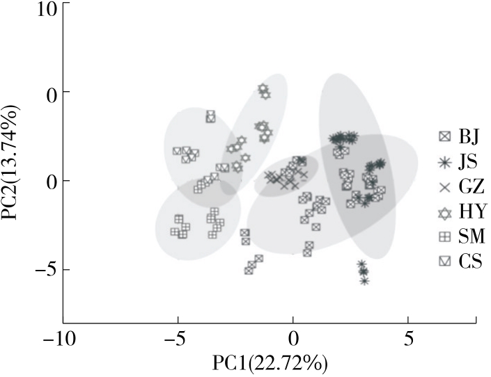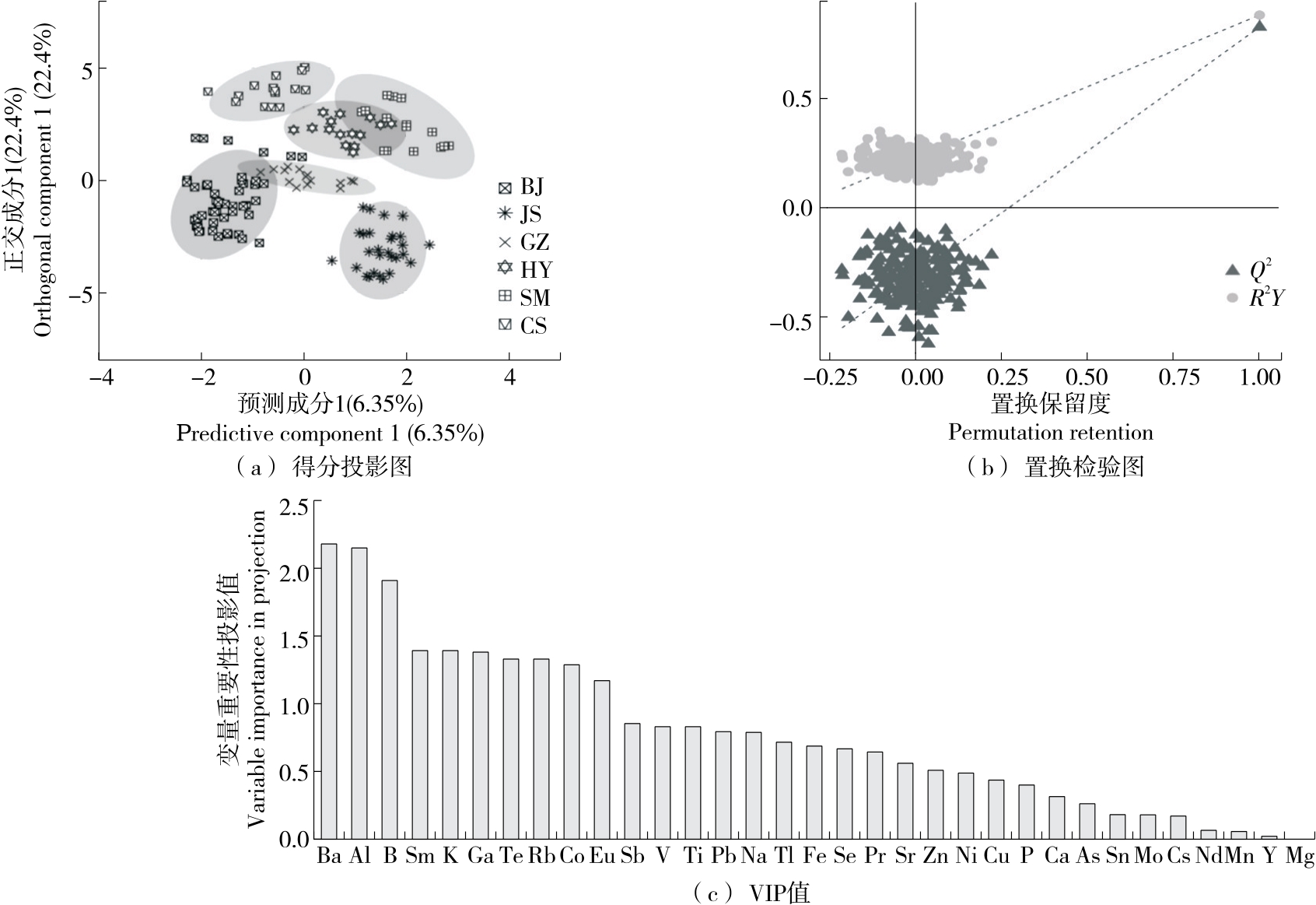 摘要:目的 基于矿物元素指纹分析实现湖南主产区黄金茶早春绿茶的产地判别。方法 采用电感耦合等离子体质谱(ICP-MS)对138份湖南不同产地黄金茶早春绿茶样品中的48种矿物元素进行定量检测,结合主成分分析(PCA)、正交偏最小二乘判别分析(OPLS-DA)以及Fisher线性判别分析,建立不同产地黄金茶的分类识别模型。结果 PCA得分投影图与OPLS-DA模型能够有效区分湖南各产区黄金茶早春绿茶;通过Fisher线性判别分析将筛选出的Ba、Al、B、Sm、K、Ga、Te、Rb、Co、Eu 10种关键元素构建产地判别模型,所构建的模型整体预测准确率>90%。结论 矿物元素指纹可有效应用于湖南主产区黄金茶的产地溯源。