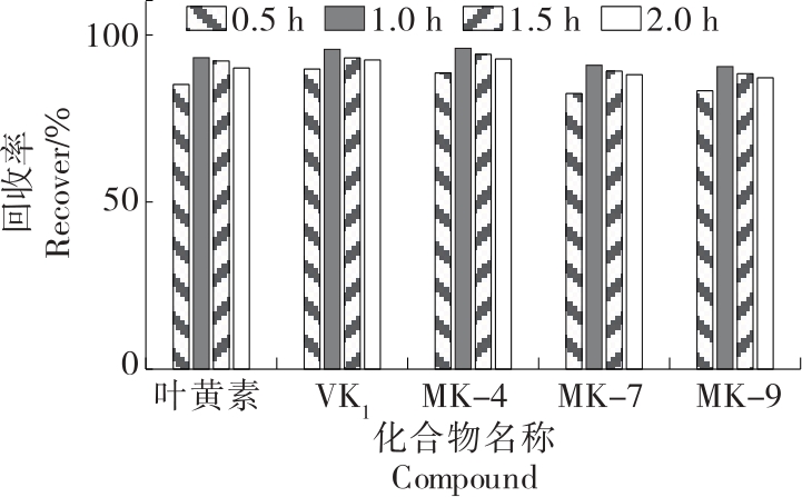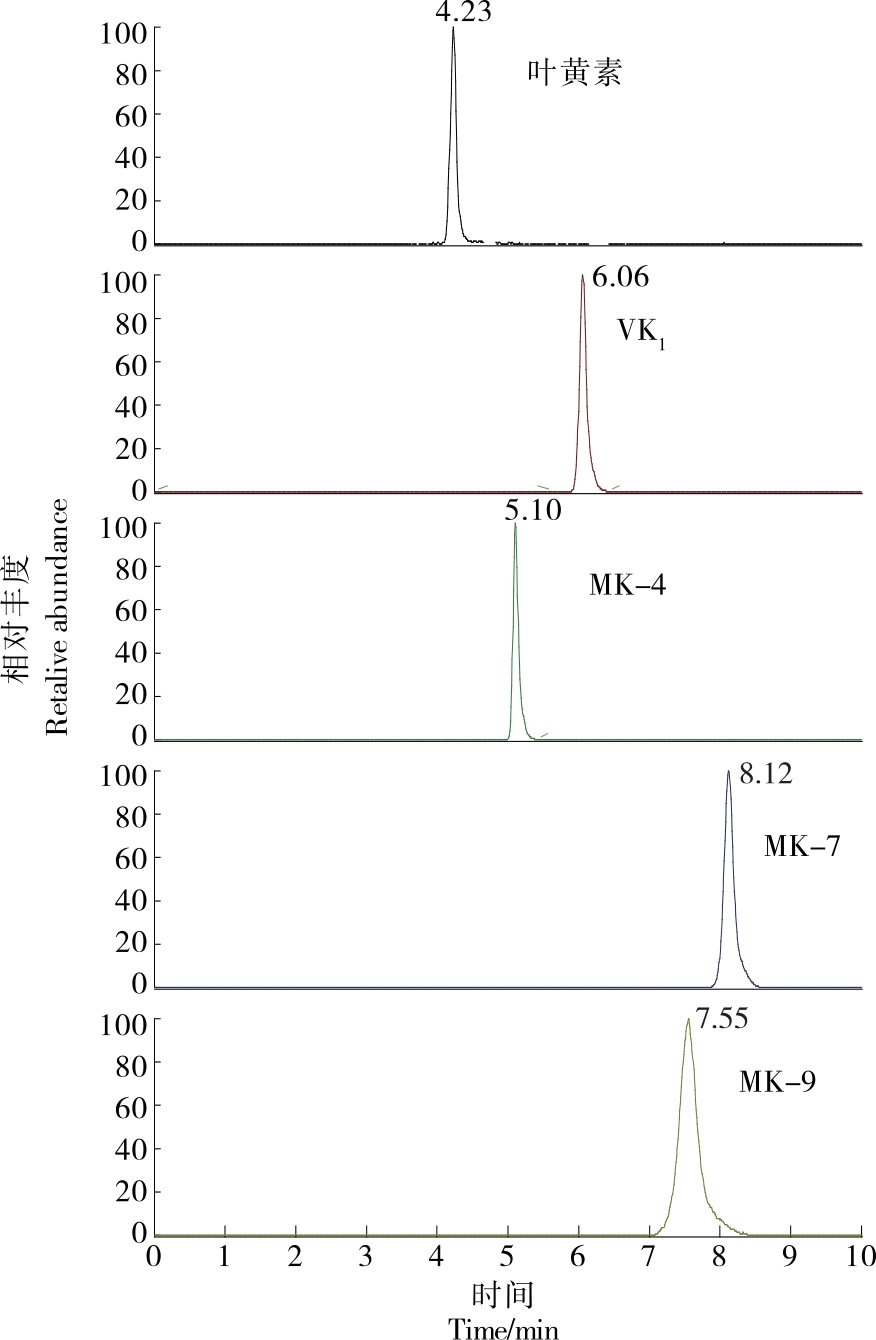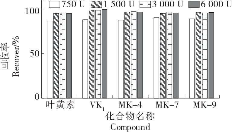 摘要:目的 通过优化超声辅助酶解方法,建立超高效液相色谱—串联质谱法(UPLC-MS/MS)同时检测禽蛋中叶黄素、天然VK同系物叶绿醌(VK1)、四烯甲萘醌(MK-4)、七烯甲萘醌(MK-7)和九烯甲萘醌(MK-9)的检测方法。方法 禽蛋样品经超声辅助酶解后萃取出目标化合物,经C18色谱柱( 100 mm×2.1 mm,3.0 μm)分离,0.1%甲酸水溶液—0.1%甲酸甲醇溶液为流动相,梯度洗脱,APCI源检测分析,外标法定量。结果 超声辅助酶解加酶量为1 500 U,酶解时间为1 h,叶黄素和天然VK同系物在1.0~5 000.0 ng/mL范围内线性关系良好,相关系数R2>0.996。检出限为0.8~1.5 μg/100 g,定量限为2.0~5.0 μg/100 g。在加标质量浓度为10,20,100 μg/100 g时,平均加标回收率为80.1%~94.9%,相对标准偏差为1.3%~5.5%。结论 该法检测效率高,灵敏度高,选择性强,可作为禽蛋中叶黄素和天然VK同系物检测方法。