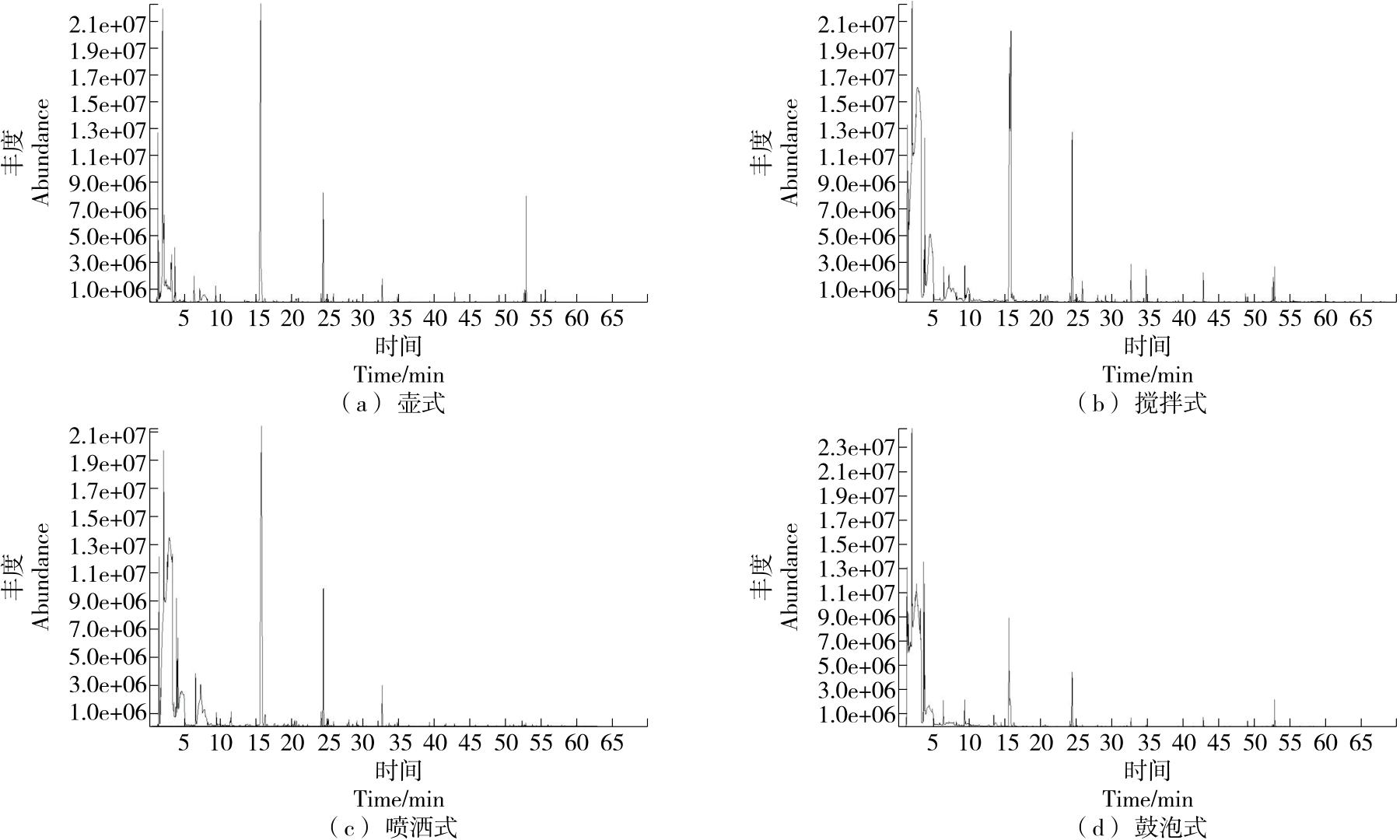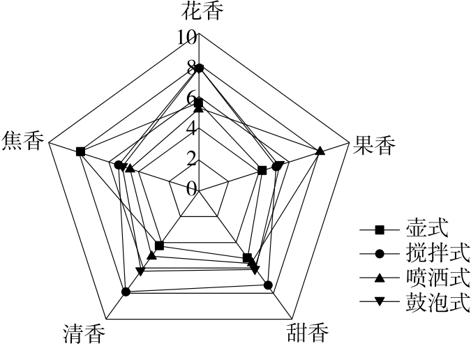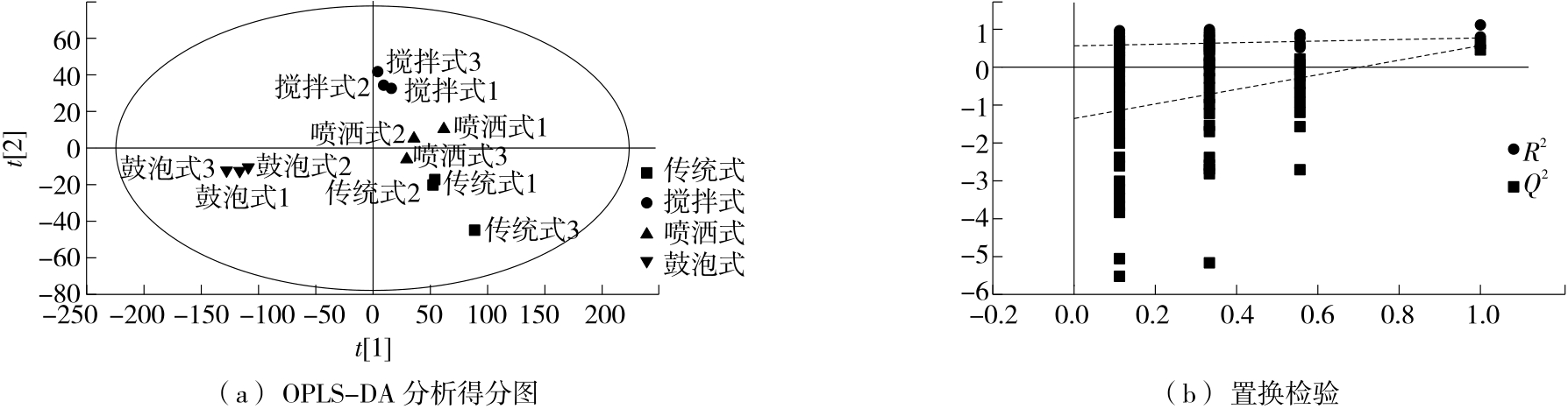 摘要:目的 探索新的蒸馏设备,改良传统的蒸馏设备蒸馏温度过高使酒液产生焦糊味的不良影响。方法 以实验室自制的3种低温蒸馏与壶式蒸馏设备对红枣酒进行蒸馏,利用气相色谱—质谱联用技术(GC-MS)分析粗馏红枣酒中挥发性成分。结果 粗馏红枣酒中共鉴定出74种化合物,其中酯类44种、醇类8种、酸类5种、醛类6种、酮类4种、其他类7种;建立的OPLS-DA模型分类预测准确率为95.0%,并通过VIP>1筛选出13种差异性挥发性成分;采用ROAV值分析出9种关键香气成分(1≤ROAV≤100),反映不同粗蒸馏酒之间香气物质存在一定差异。结论 从物质含量上看,低温蒸馏设备粗蒸馏酒所产生的酯类、醇类物质明显多于壶式蒸馏设备;酮酸类物质的产生少于壶式蒸馏设备粗蒸馏酒;低温蒸馏与高温蒸馏的酒液从感官评价上看具有一定的差异。