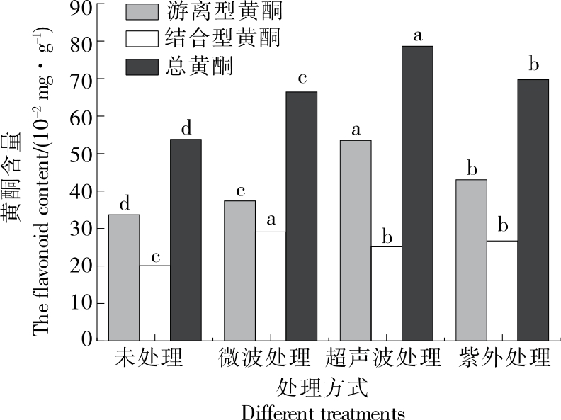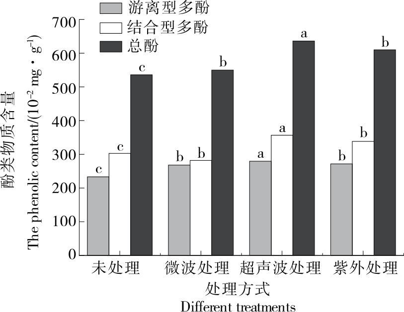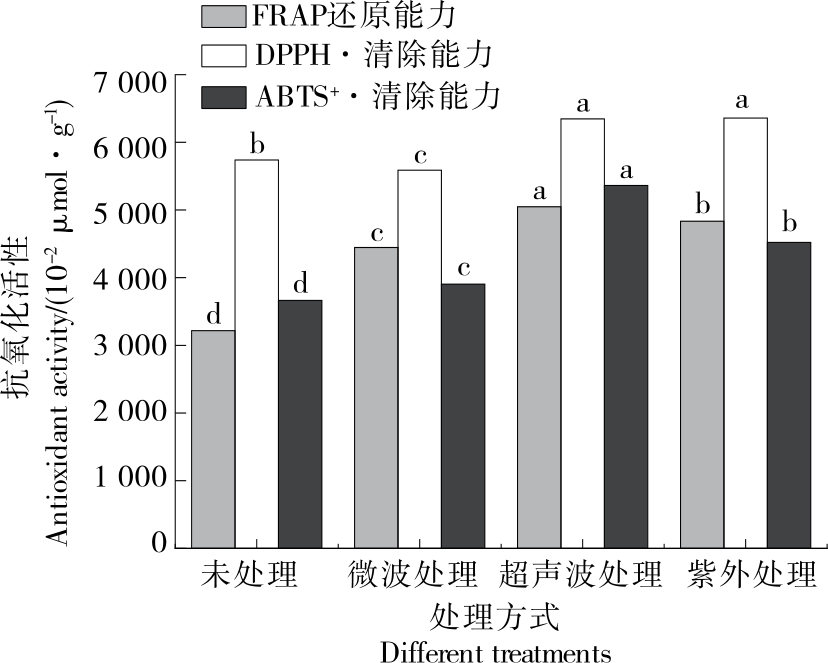 摘要:目的 提高黑青稞多酚利用率及抗氧化活性。方法 以黑青稞为原料,采用超声波(UT)、微波(MT)、紫外(UVT)3种方式处理黑青稞,对比黑青稞的基本营养成分、酚类物质含量、组成及抗氧化活性差异。结果 与未处理相比,经3种方式处理后黑青稞的脂肪含量显著增加(P<0.05),而纤维含量显著降低(P<0.05)。3种方式处理的黑青稞总酚及总黄酮含量均显著提高(P<0.05),分别为未处理组的1.03~1.19倍和1.24~1.46倍,其中UT处理可显著提高青稞多酚含量,总酚和总黄酮含量分别提高了18.72%和46.22%。UVT处理黑青稞主要增加的酚类物质组分为羟基肉桂酸类及黄酮醇类,UT处理主要增加的酚类物质组分为黄酮类及黄烷醇类,MT处理主要增加的酚类物质组分为羟基苯甲酸类。3种处理黑青稞的抗氧化活性指数(APC)由强到弱依次为UT(99.94%)>UVT(93.35%)>MT(82.91%)>CK(74.10%),且酚类化合物与抗氧化活性之间存在较强的相关性。结论 UT处理黑青稞的酚类物质含量及抗氧化活性最高。