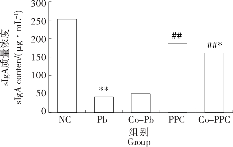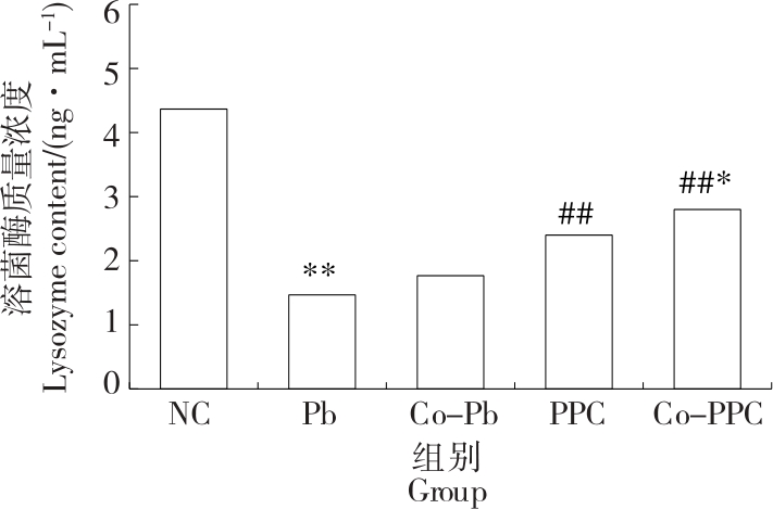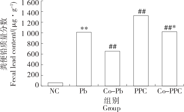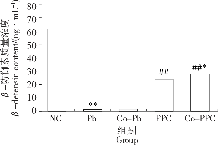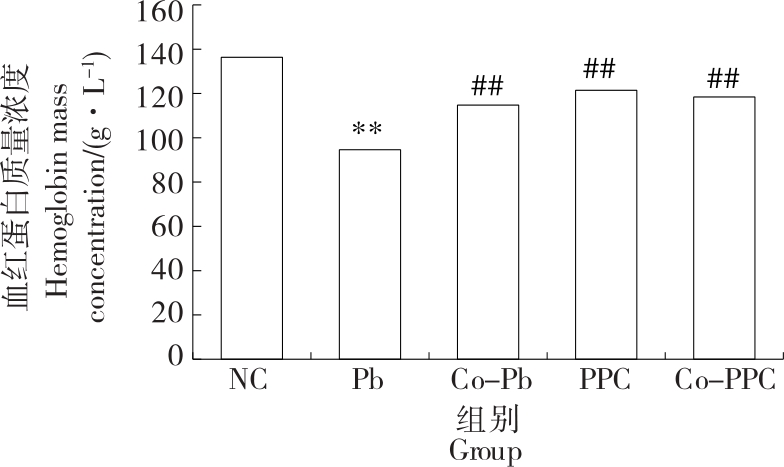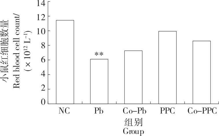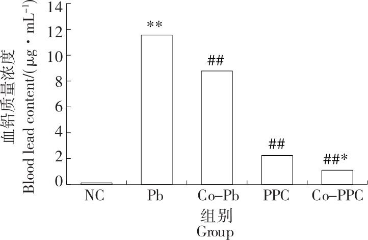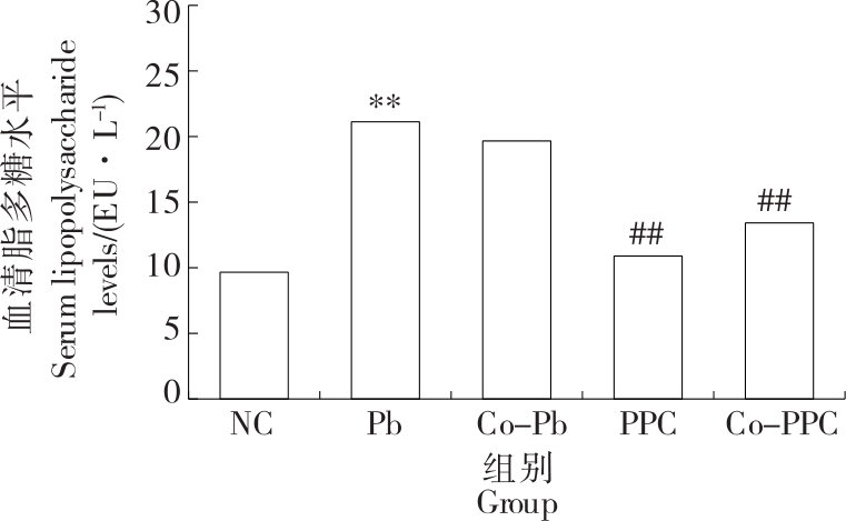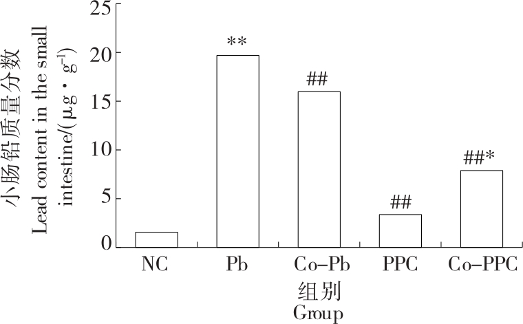 摘要:目的 旨在探讨同笼饲养方式下黑木耳蛋白多糖复合物(PPC)对小鼠排铅的调控作用。方法 选择60只昆明小鼠随机分为:空白对照组(NC)、染铅模型组(Pb)、PPC组、染铅组和PPC同笼饲养组(Co-Pb+Co-PPC组),饲养8周后,以全自动血细胞分析仪测定红细胞和血红蛋白的浓度;ICP-MS测定小鼠全血、小肠、粪便中铅的含量;ELISA试剂盒用来检测血清中脂多糖(LPS)含量及小肠溶菌酶、β-防御素和sIgA的水平。结果 与NC组比,Pb组血铅、小肠铅、粪便铅及LPS含量显著升高(P<0.05);红细胞数量、血红蛋白浓度、溶菌酶、β-防御素、sIgA含量显著下降(P<0.05);与Pb组比,Co-Pb组血铅、小肠铅含量显著下降(P<0.05),血红蛋白浓度和粪便铅含量显著升高(P<0.05);红细胞数量、溶菌酶含量、β-防御素、sIgA含量升高,差异不明显;PPC、Co-PPC组LPS、血铅、小肠铅含量均显著下降(P<0.05),血红蛋白浓度、粪便铅含量、溶菌酶、β-防御素、sIgA含量显著升高(P<0.05),红细胞数量差异不明显。结论 PPC可以促进小鼠排铅和改善血液和小肠状况。