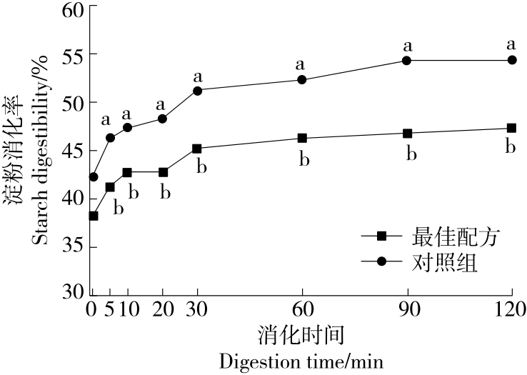 摘要:目的 开发具有营养强化和风味提升功能的新型米发糕,实现传统米发糕的健康化改良。方法 以粳米粉为基质,辅以植物乳杆菌和酿酒酵母菌协同发酵。通过单因素试验结合主成分分析法优化亚麻籽粉(7%)与鹰嘴豆粉(5%)复配比例,系统评估改良配方对产品品质、营养组成、体外消化特性、抗氧化活性及风味特征的影响。结果 改良后米发糕在保持色泽白度的同时,总酚含量提升了3倍,DPPH自由基和ABTS+自由基清除率分别提高了2倍;慢消化淀粉与抗性淀粉显著增加,体外消化估计血糖升糖指数(eGI)降至53.758,达到低升糖指数食品标准。营养指标显示蛋白质含量增加1.105 g/L,胆固醇、淀粉含量显著降低。GC-MS结合OPLS-DA分析表明,配方改良有效降低了发酵酸味,新增异丁醇等特征风味物质。结论 亚麻籽粉—鹰嘴豆粉复配技术可显著提升米发糕的营养价值与抗氧化特性,优化消化代谢性能并改善其风味特征。