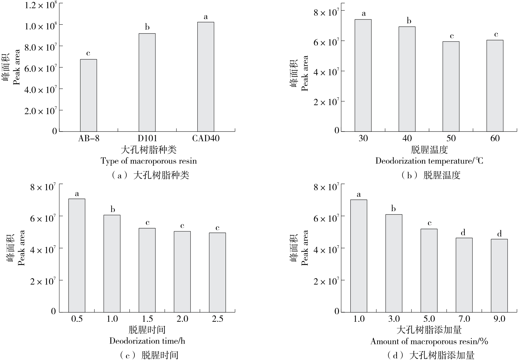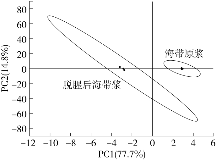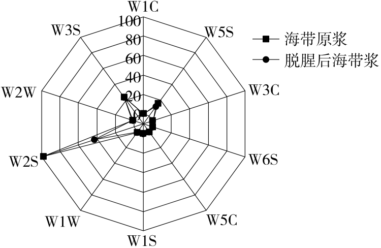 摘要:目的 采用大孔树脂脱除海带浆中的腥味挥发性物质。方法 以顶空固相微萃取/气相色谱—质谱(HS-SPME/GC-MS)分析结果作为指标,探讨大孔树脂种类、脱腥温度和脱腥时间对海带浆脱腥效果的影响;通过电子鼻分析海带浆经大孔树脂脱腥前后的气味差异性。结果 采用AB-大孔树脂对海带浆进行脱腥,大孔树脂添加量为7.3%、脱腥时间为2 h、脱腥温度为51 ℃时,大孔树脂对海带浆的脱腥效果最佳,海带浆中醇类、醛类和酮类挥发性物质的脱除率分别为44.98%,47.10%,30.31%,其中腥味物质的去除率为51.6%。电子鼻检测结果显示海带浆进行大孔树脂脱腥前后的风味有明显差异。结论 AB-8大孔树脂能有效脱除海带浆中的腥味物质并改善海带浆的风味。
