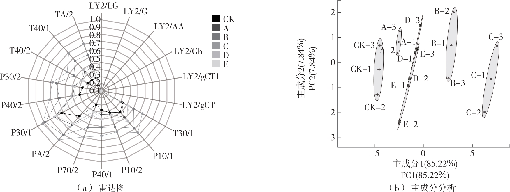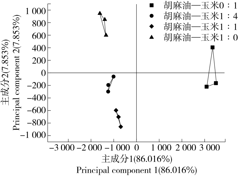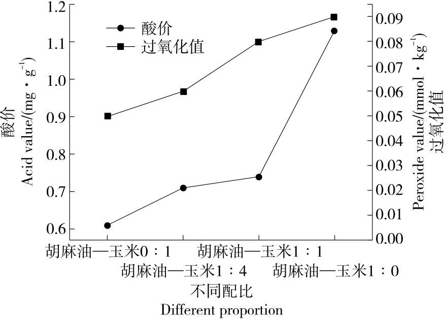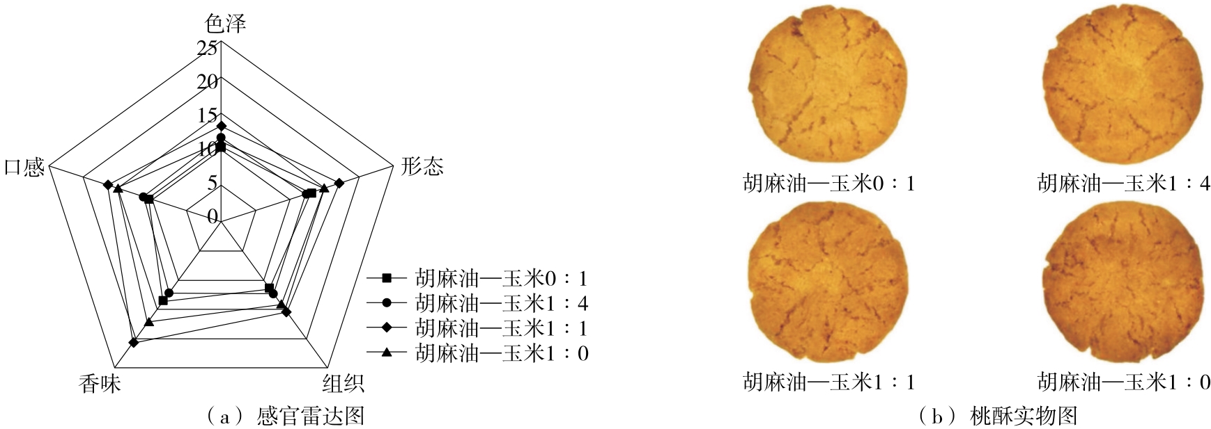 摘要:目的 探究胡麻油—玉米油复配比例对桃酥品质的影响。方法 通过梯度试验分析桃酥的感官特性和理化特性,采用感官评价、质构仪、电子鼻及气相色谱—质谱联用等方法,结合水分、酸价和过氧化值测定,综合评价不同配比下桃酥的品质。结果 当胡麻油—玉米油配比为1∶1时,桃酥的感官评分最高为82.8,其色泽金黄(L*、b*值突出),香气浓郁,质构均衡,水分均一性优良,半结合水比例最高,可有效强化胡麻油特征风味。氧化稳定性分析表明,当胡麻油—玉米油配比>1∶1时,桃酥的酸价和过氧化值增速显著。结论 胡麻油—玉米油的最适配比为1∶1,可在保留桃酥传统风味的同时提升其营养价值。