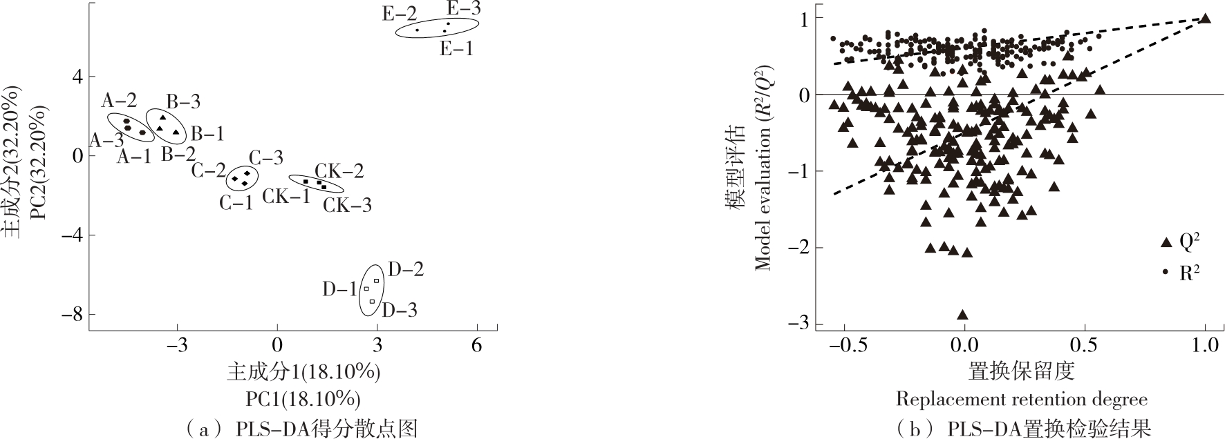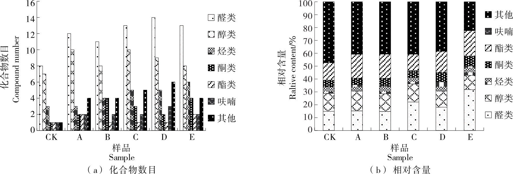 摘要:目的 探究辣椒炒制时间对红油辣椒挥发性风味物质的影响。方法 采用感官评价、电子鼻、气相色谱—质谱(GC-MS)测定不同炒制时间的辣椒(0,30,45,60,75,90 s)制备的红油辣椒感官特性、色差、挥发性化合物的差异,并结合相对气味活度值(ROAV)、偏最小二乘法(PLS-DA)分析6种红油辣椒的关键风味化合物。结果 不同炒制时间的辣椒制备的红油辣椒其整体风味具有明显差异;经过GC-MS共鉴定出63种挥发性化合物;通过ROAV分析,红油辣椒整体香气主要由油脂香、可可香、洋葱香构成;通过PLS-DA共筛选出24种差异挥发性化合物,醇类、醛类是主要的差异挥发性化合物。结论 炒制时间对红油辣椒的色差、感官特性与挥发性风味物质影响较大,炒制60 s的辣椒制备的红油辣椒风味整体较佳,可直接用于后续的生产加工。