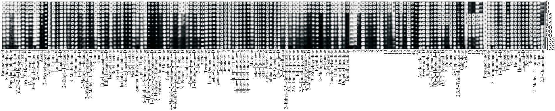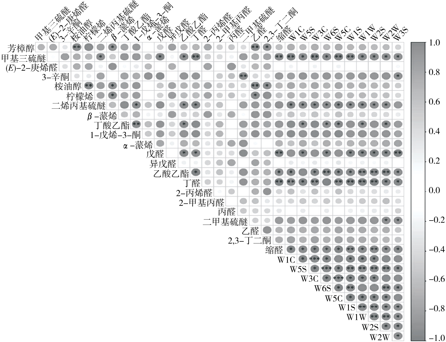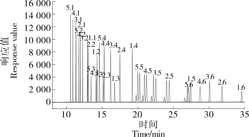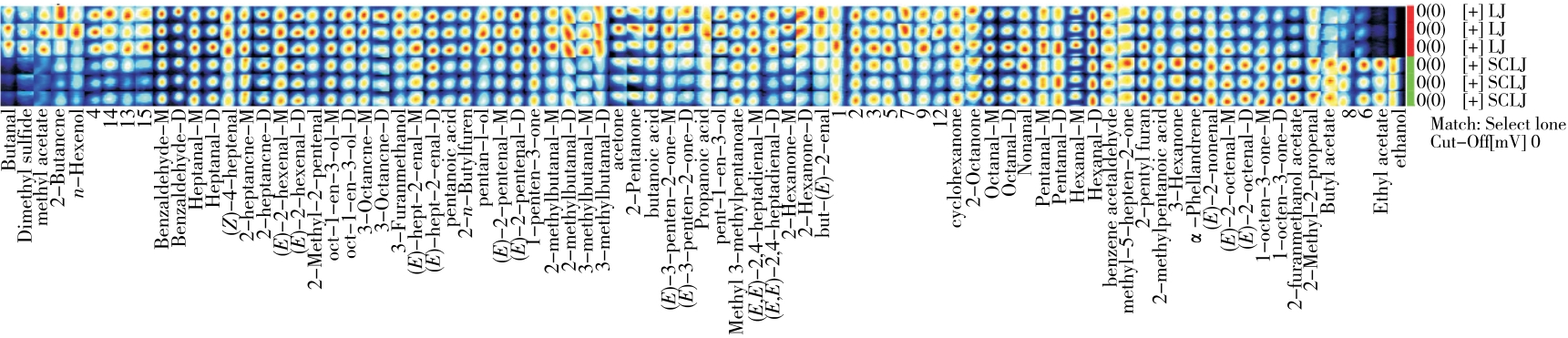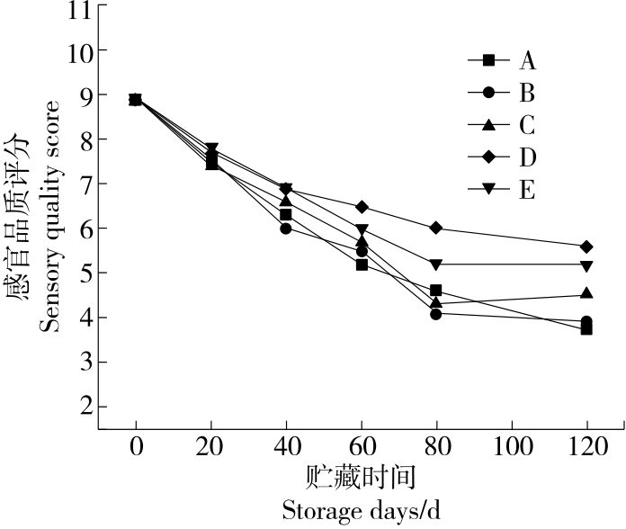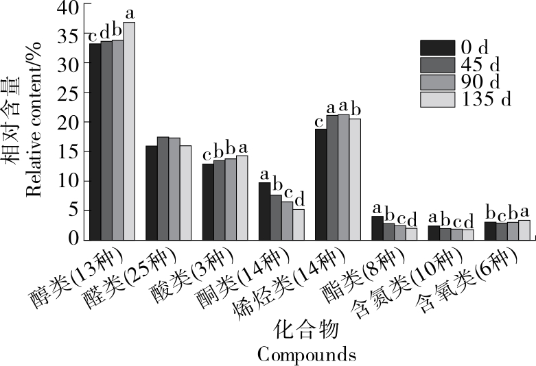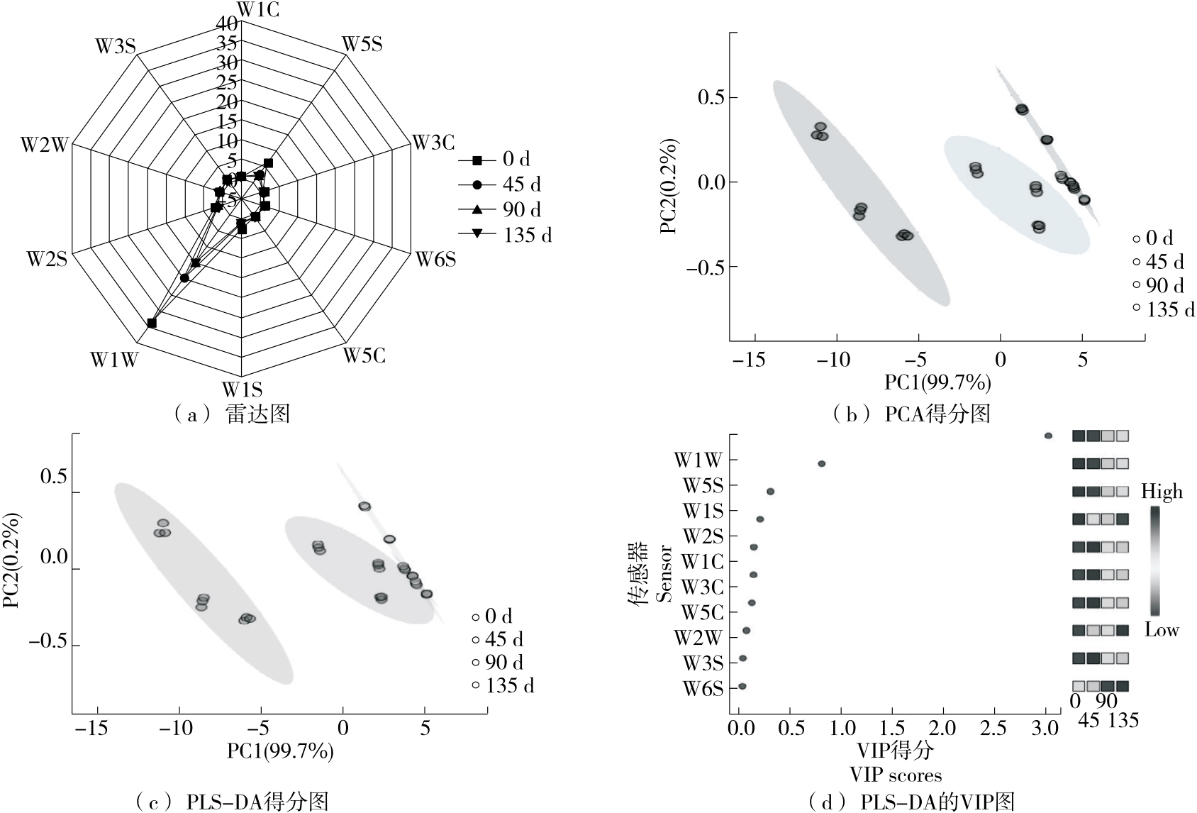 摘要:目的 探究辣椒油贮藏期间风味物质变化规律,为辣椒油货架期预测及品质调控提供理论依据。方法 采用气相色谱—离子迁移谱(GC-IMS)、感官、电子鼻技术对贮藏0,45,90,135 d的辣椒油的挥发性风味成分进行分析和检测。结果 辣椒油中共有93种挥发性物质,主要包括醛类、酮类、烯烃类、醇类物质及含氮类化合物。利用相对气味活性值(ROAV)筛选出关键香气化合物,在辣椒油贮藏0,45,90,135 d时分别筛选出18,21,21,20种关键挥发性风味物质,主要包括醇类、醛类、酮类、烯烃类、酯类及含硫类化合物。感官结果显示,不同贮藏时间的辣椒油色泽和整体可接受度差异不显著,香味和滋味差异显著(P<0.05)。电子鼻结果表明,贮藏90,135 d的样品无显著差异,辣椒油气味在90 d后趋于稳定。结论 贮藏时间显著影响辣椒油风味物质组成及感官特性,90 d后气味成分趋于稳定,此临界点为货架期判定提供重要依据。