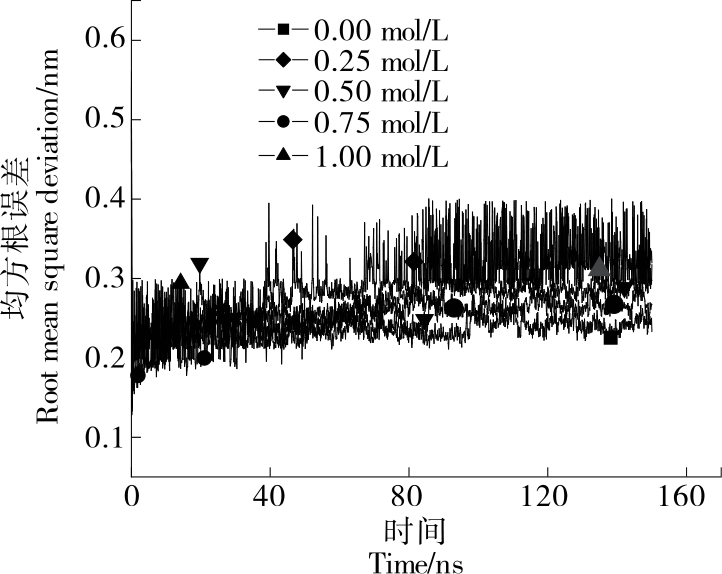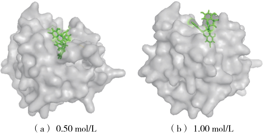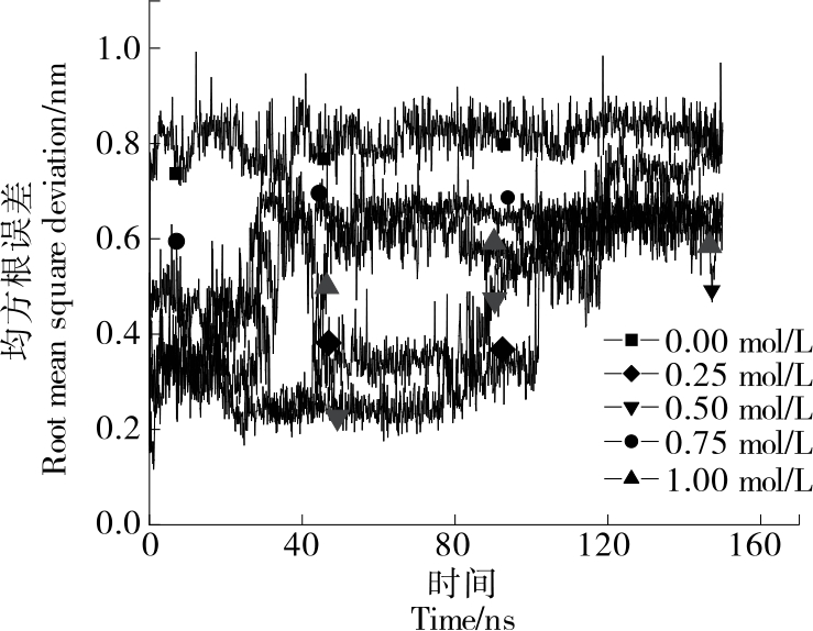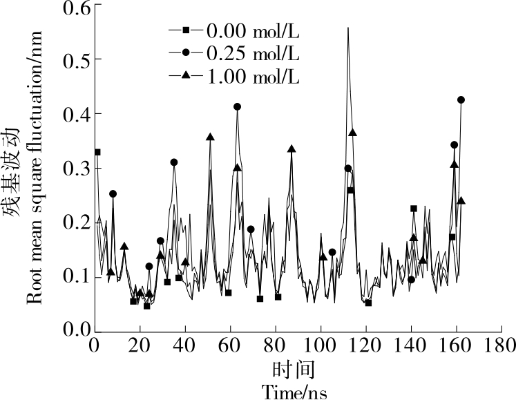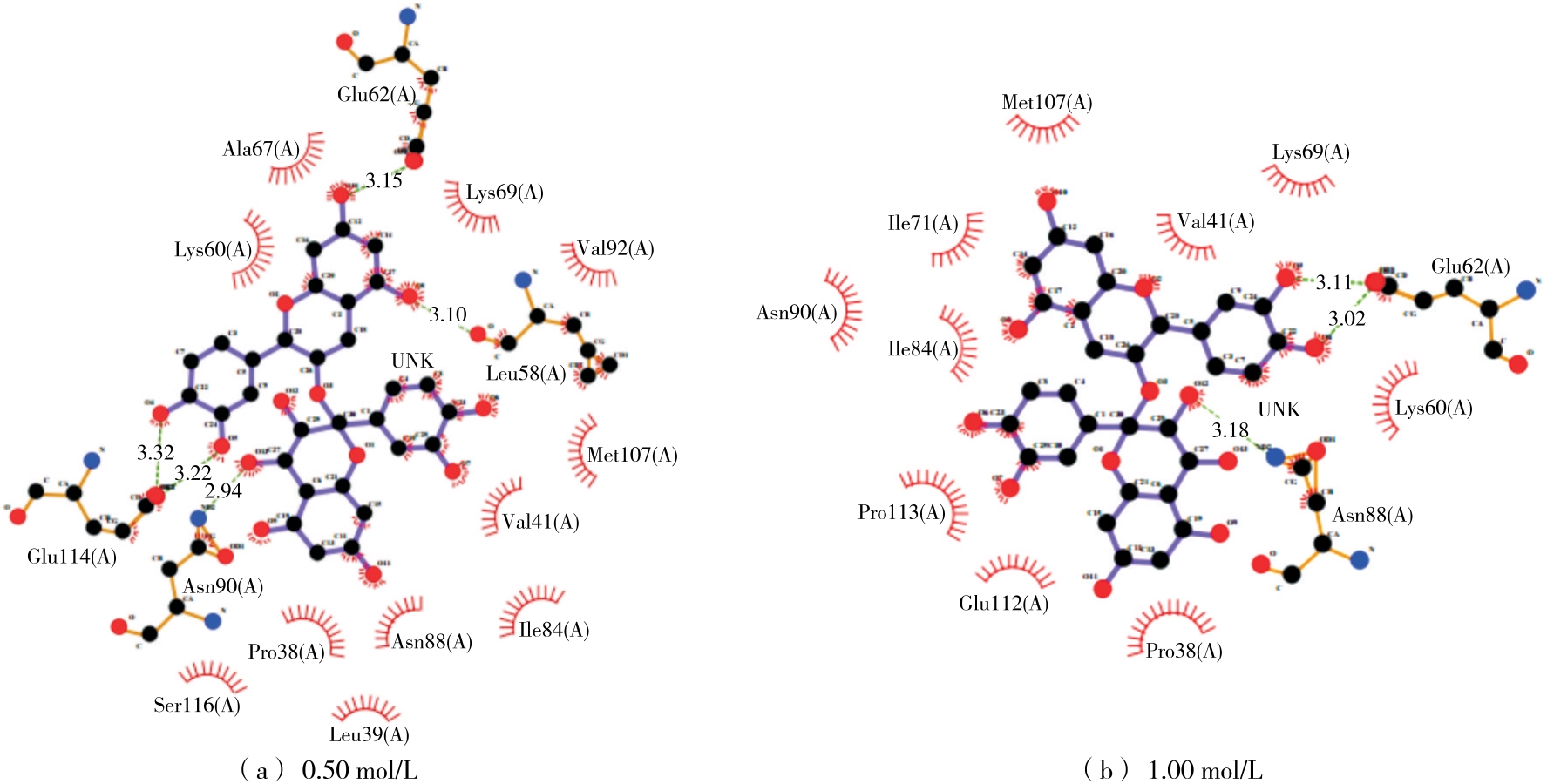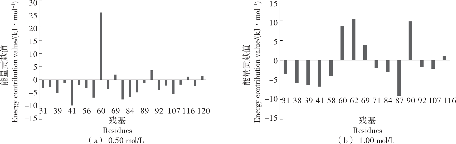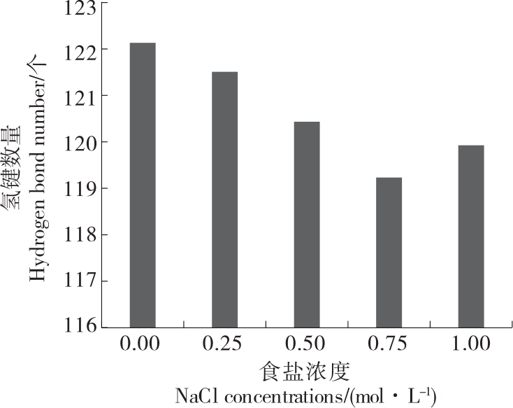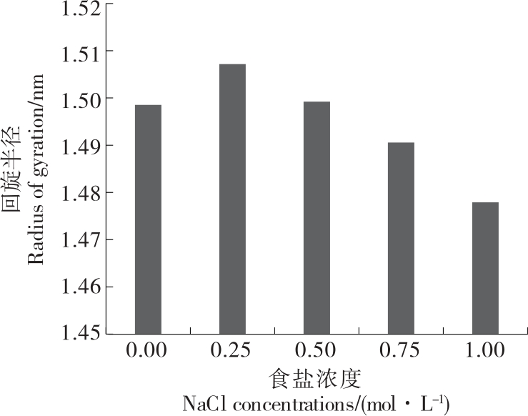 摘要:目的 探究食盐浓度对蛋白与小分子物质间结合的影响。方法 分别以β-乳球蛋白和花青素作为目标蛋白和小分子,采用分子动力学模拟研究在5种食盐浓度下(0,0.25,0.50,0.75,1.00 mol/L)两者的结合规律和蛋白结构变化。结果 花青素主要结合在β-乳球蛋白疏水腔处。在150 ns的分子动力学模拟中,各食盐浓度下蛋白结构均较稳定,其与小分子的结合也比较平稳;但随NaCl浓度的增加,蛋白间氢键、疏水表面积和α-螺旋均有所降低,同时β-折叠在0.75 mol/L的食盐浓度下有所增加。两者的结合自由能先随食盐浓度的增加而增加,在0.50 mol/L达到最大值后逐渐下降,1.00 mol/L时甚至远低于对照组,主要是由于在1.00 mol/L的食盐浓度下,范德华力、氢键作用和疏水作用力同时减弱引起的,小分子在蛋白的结合位置也从疏水腔内部向表面靠近。结论 食品体系中食盐的添加量会显著影响蛋白与植物小分子的结合,进而可能影响到蛋白的性质和小分子物质的生物活性。