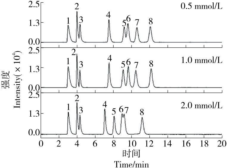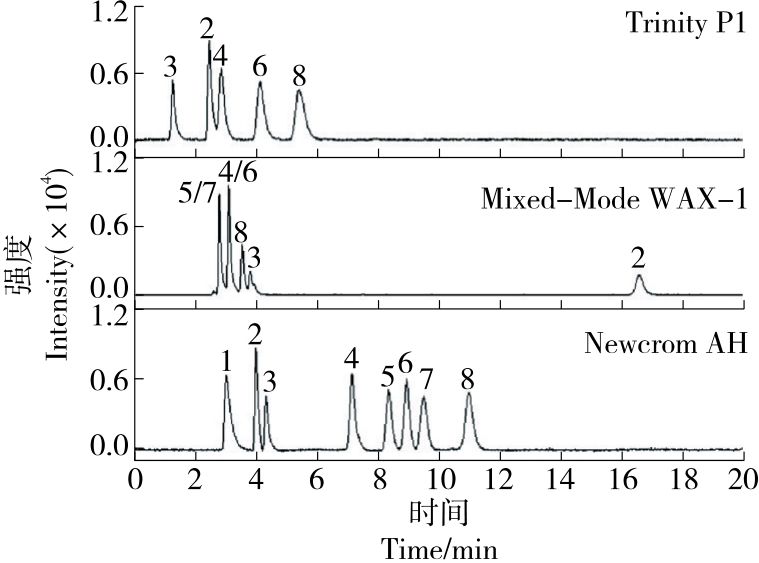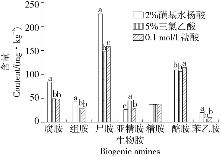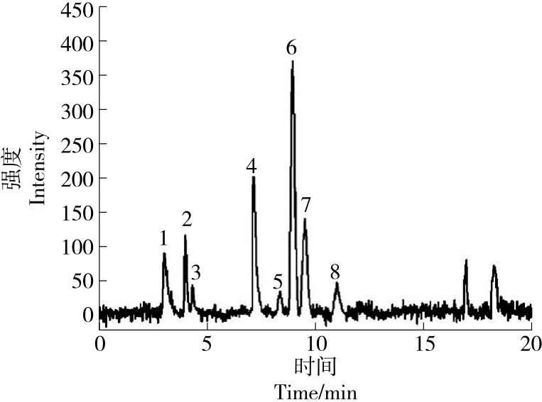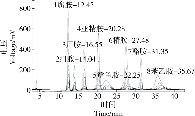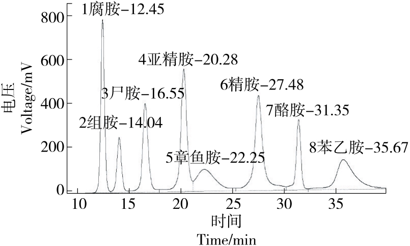 摘要:目的 解决传统色谱法在测定生物胺时所面临的繁琐手动柱前衍生步骤以及衍生物稳定性差的问题,以提升检测的效率和准确性。方法 利用氨基酸分析仪测定动物性水产品中8种生物胺(腐胺、组胺、尸胺、亚精胺、章鱼胺、精胺、酪胺、苯乙胺)含量。动物性水产品试样经磺基水杨酸溶液提取,高速冷冻离心,钾盐缓冲液洗脱,钾离子型磺酸基强酸性阳离子交换色谱柱分离,130 ℃下茚三酮在线衍生,570 nm波长检测,8种生物胺采用外标法定量。结果 8种生物胺线性范围为1.0~50.0 mg/L,相关系数R2>0.994 7,检出限为2.5~5.0 mg/kg、定量限为8.3~16.7 mg/kg,3种基质加标回收率为62.2%~119.2%,衍生条件和设备稳定性良好(峰面积RSD为0.43%~3.89%,保留时间RSD为0.050%~0.334%),有证质控样品考察结果为满意。结论 该方法具有良好的稳定性、灵敏度、回收率和准确度,快速简便,适用于动物性水产品中8种生物胺含量的检测。