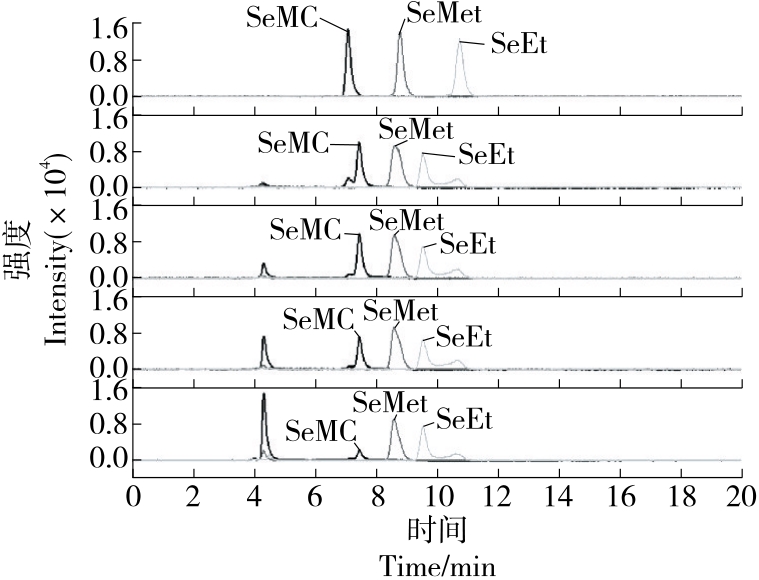 摘要:目的 针对富硒食用油中硒形态检测的现有方法局限性,如硒形态相互转化、酶解时间长和可检测硒形态种类较少等问题,提出一种优化策略。方法 采用快速溶剂萃取法辅助蛋白酶K进行酶解,并建立高效液相色谱—电感耦合等离子体串联质谱法(HPLC-ICP-MS)。结果 40 ℃下,当蛋白酶K用量为35 mg、静态萃取时间为5 min时,硒形态提取率最高可达(83.65±2.36)%。8种硒形态目标物在20 min内可被有效分离,在2~100 μg/L范围内线性良好(R2≥0.999 3),检出限为0.20~0.60 μg/kg,定量限为0.60~1.80 μg/kg,加标回收率为82.3%~112.3%,相对标准偏差≤5.60%。结论 该方法提升了硒形态分析的效率和准确性。