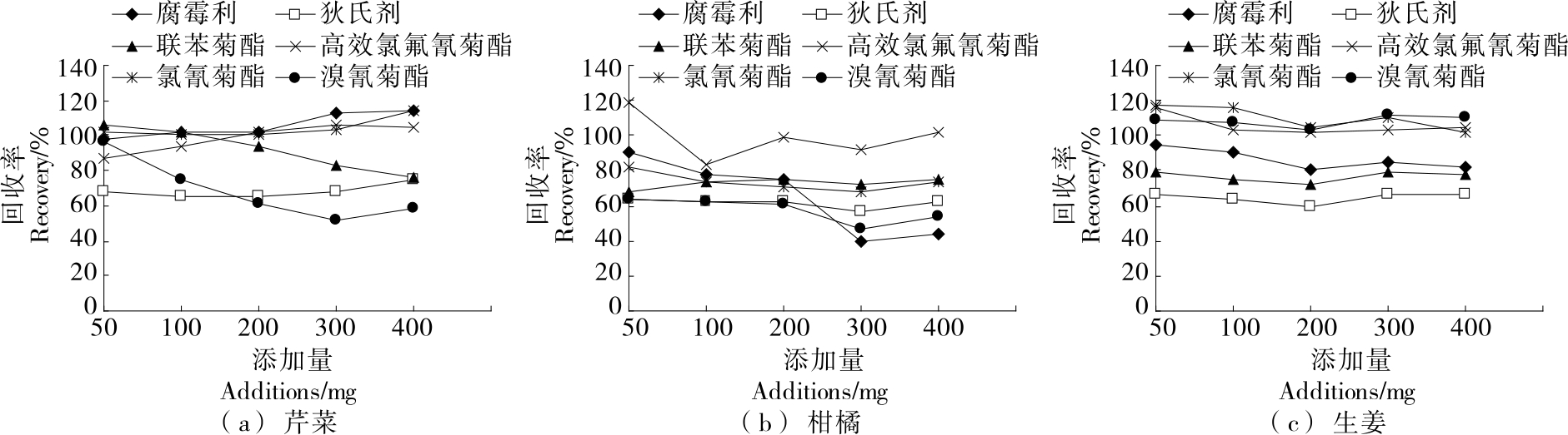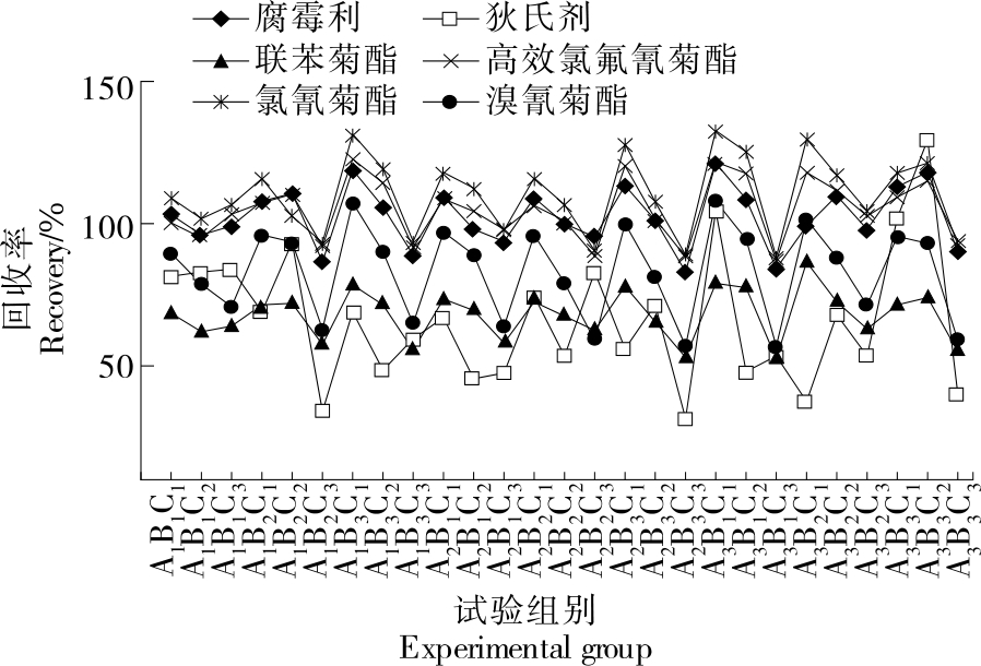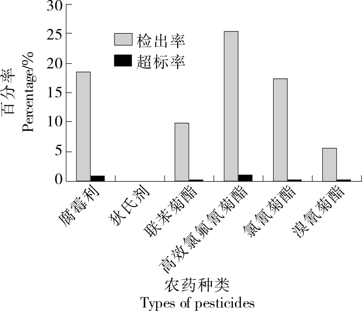 摘要:目的 了解渝东北地区果蔬中6种农药的残留现状及其对当地居民存在的健康风险。方法 利用气相色谱仪并结合食品安全指数分析法(index of food safety,IFS)对6种农药进行检测和安全性评价。结果 6种农药中狄氏剂未被检出,其余5种农药均被检出。5种农药在7类果蔬中平均残留量分别为腐霉利0.265 mg/kg、联苯菊酯0.037 mg/kg、高效氯氟氰菊酯0.073 mg/kg、氯氰菊酯0.060 mg/kg和溴氰菊酯0.025 mg/kg。其中高效氯氟氰菊酯在所有样品中检出率最高(25.34%),其次是腐霉利(18.46%),溴氰菊酯检出率最低(5.52%);高效氯氟氰菊酯超标率最高(1.00%),其次是腐霉利(0.90%),超标率最低的是溴氰菊酯(0.09%)。安全性评价研究显示,5种检出农药的单种农药平均安全指数和多种农药平均安全指数均小于1。结论 渝东北市售果蔬样品对人体无显著风险。