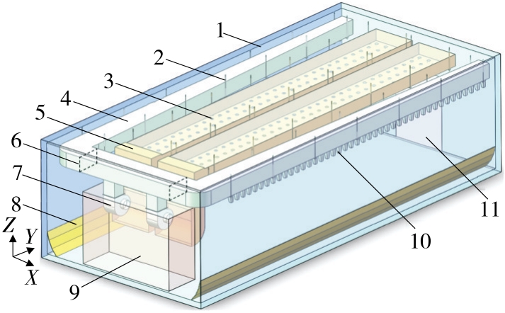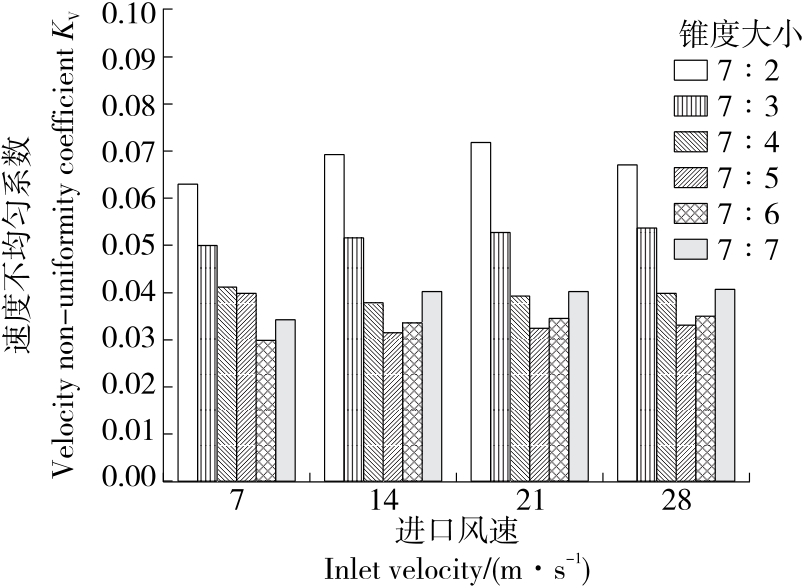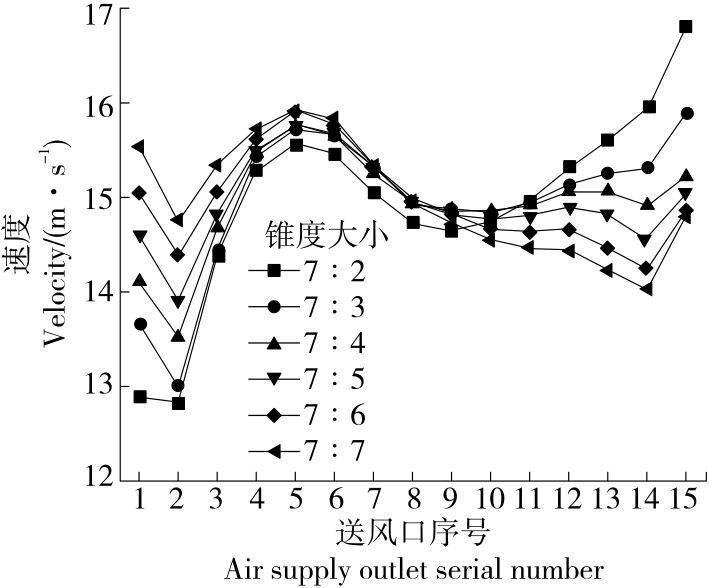 摘要:目的 提高冷风发酵房内气流的均匀性。方法 利用Fluent软件进行数值模拟,以平均速度和速度不均匀系数为评价指标,在供风量不变的条件下,探究进风管锥度对各送风口风量的影响规律;研究不同供风方式下发酵房横截面内气流速度的分布特点,并构建循环供风方式,分析一个周期内各供风方式的最佳时间占比。结果 随着进风管锥度的增大,始端送风口风量逐渐减小而末端逐渐增大,当锥度为7∶5时,进风管送风均匀性最好;相比于双侧供风,单侧供风平均速度大,有利于水分蒸发,但流场均匀性不好,降低了物料品质;在循环供风方式中,当双侧、左侧、右侧供风在1个周期内的工作时间占比分别为64%,18%,18%时,流场速度均匀性最好,相比于单一的双侧供风提高了16.4%,平均速度提高了13.2%。结论 通过对进风管锥度以及供风方式的改进,提高了冷风发酵房内气流的均匀性。