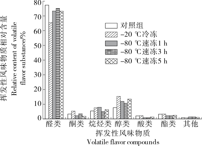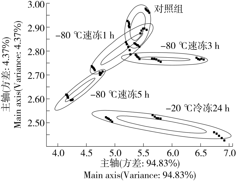 摘要:目的 保留预制红烧牛肉感官品质及营养物质。方法 以熟制新鲜红烧牛肉为对照组,采用电子鼻、固相微萃取气相色谱质谱联用仪(SPME-GC-MS)和低场核磁共振探究冷冻条件(-20 ℃冷冻24 h,-80 ℃速冻1,3,5 h)对预制红烧牛肉水分及风味的影响。结果 冷冻温度越低,水分和风味物质损失越少。对照组,-20 ℃冷冻24 h组,-80 ℃速冻1,3,5 h组中分别检出51,45,50,49,47种挥发性风味物质。-80 ℃速冻1 h组在水分含量和挥发性风味物质种类上与对照组最为接近。电子鼻主成分分析(PCA)显示,-80 ℃速冻1 h组的风味与对照组的接近。结论 建议生产企业选择-80 ℃速冻1 h为预制红烧牛肉的冷冻条件,以保持产品品质。
