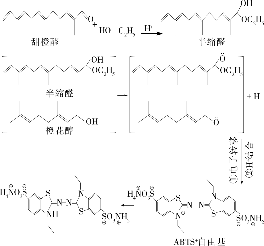 摘要:目的 分析古红橘新鲜橘皮精油的挥发性成分,评价其总体自由基清除活性,在不分离单体的情况下快速筛选其中自由基清除活性较强的成分。方法 以古红橘新鲜橘皮为原料,分别采用共水蒸馏法和水蒸气蒸馏提取橘皮精油,分析不同方法提取精油的挥发性成分,筛选特征挥发性差异成分,并采用GC-MS和化学方法筛选自由基清除活性成分。结果 2种提取方法所得精油的挥发性成分的种类、相对含量、特征挥发性成分及总体自由基清除活性差异极显著(P<0.001),共水蒸馏为最优的古红橘皮精油提取方法;各挥发性成分的自由基清除活性存在较大差异,柠檬醛(86.54%)、甜橙醛(81.20%)、α-法尼烯(70.29%)等表现出很强的DPPH自由基清除活性,而橙花醇(95.02%)、甜橙醛(83.09%)表现出极强的ABTS+自由基清除活性。结论 古红橘新鲜橘皮提取的精油的挥发性成分和自由基清除活性受到提取方法的影响,各挥发性成分的相对含量与其自由基清除活性之间没有直接的相关性。