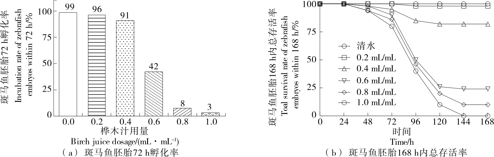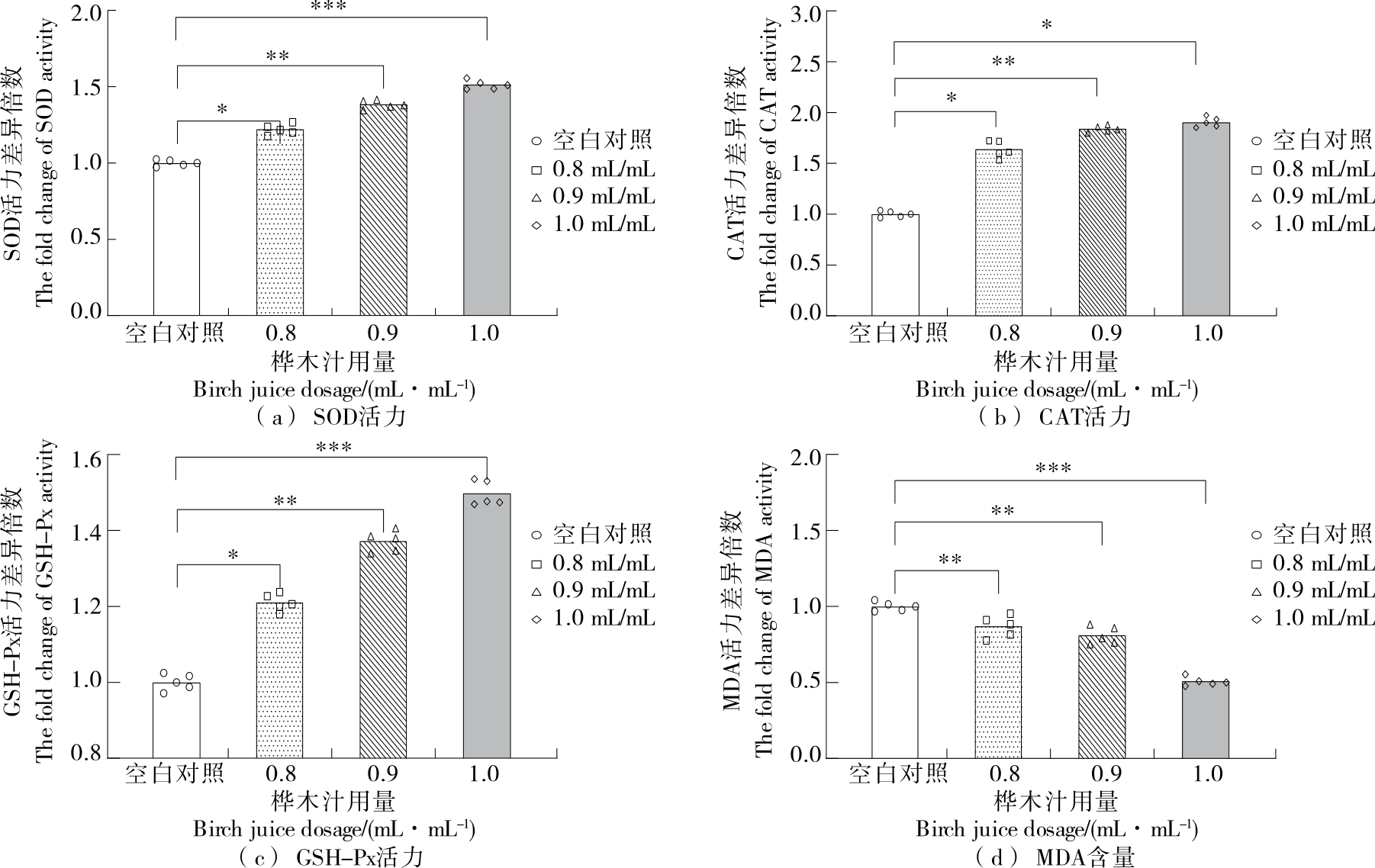 摘要:目的 研究长白山天然桦木汁的抗氧化活性。方法 通过DPPH自由基清除率、ABTS阳离子自由基清除率、羟自由基清除率、铁离子还原能力(FRAP)4种化学法测定其抗氧化活性水平,并利用模式生物—斑马鱼胚胎检测其动态酶学指标。结果 桦木汁的抗氧化效果随汁液浓度的增加呈正相关,氧化活性因子显著。当桦木汁用量为1.0 mL/mL时,其抗氧化效果最佳,且对DPPH自由基清除率、ABTS阳离子自由基清除率、羟自由基清除率、铁离子还原能力分别为34.56%,18.27%,48.77%,90.07 μmol/L,斑马鱼胚胎SOD、CAT、GSH-Px活性以及MDA含量相较于空白对照组均有显著提升。结论 天然桦木汁具有良好的抗氧化作用。