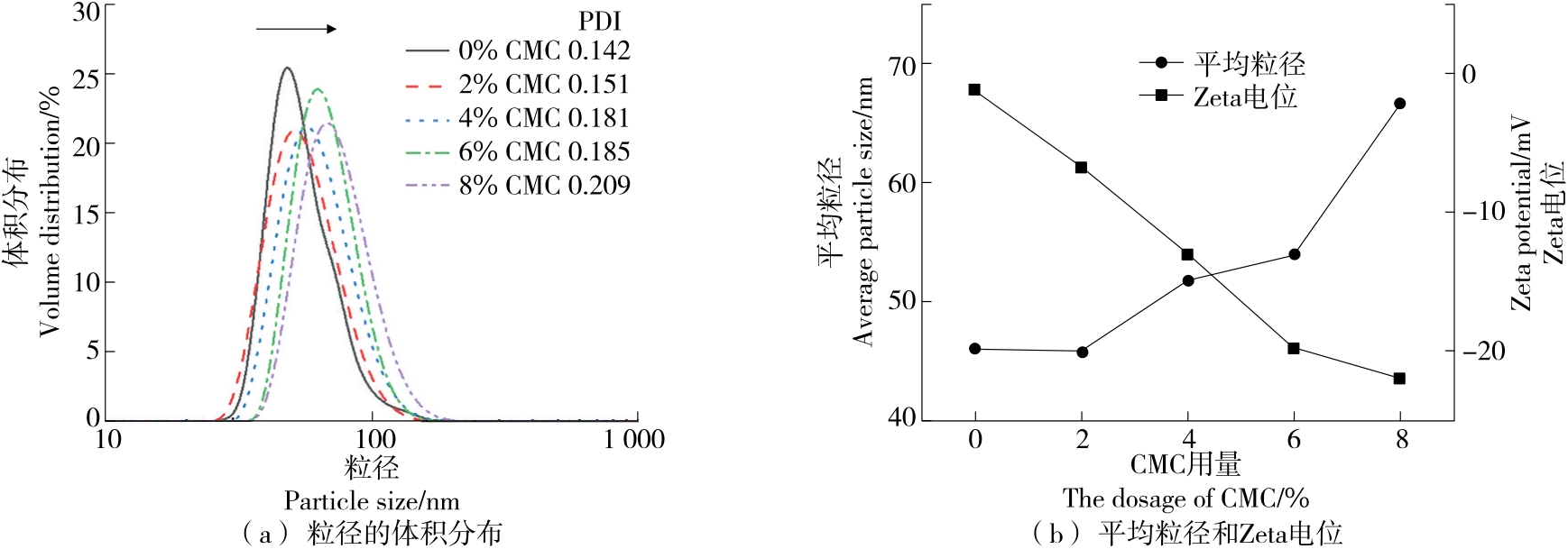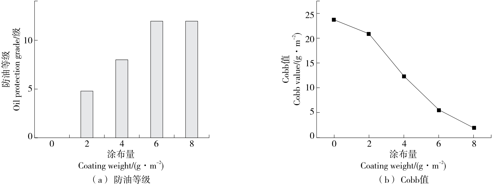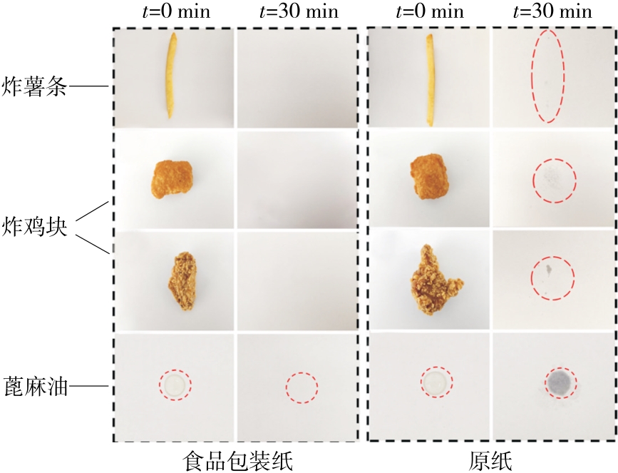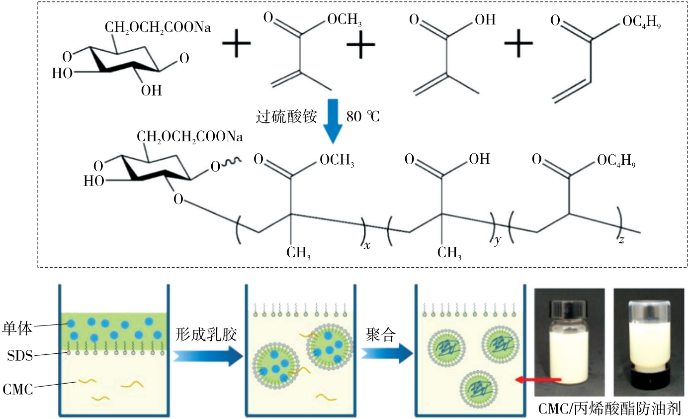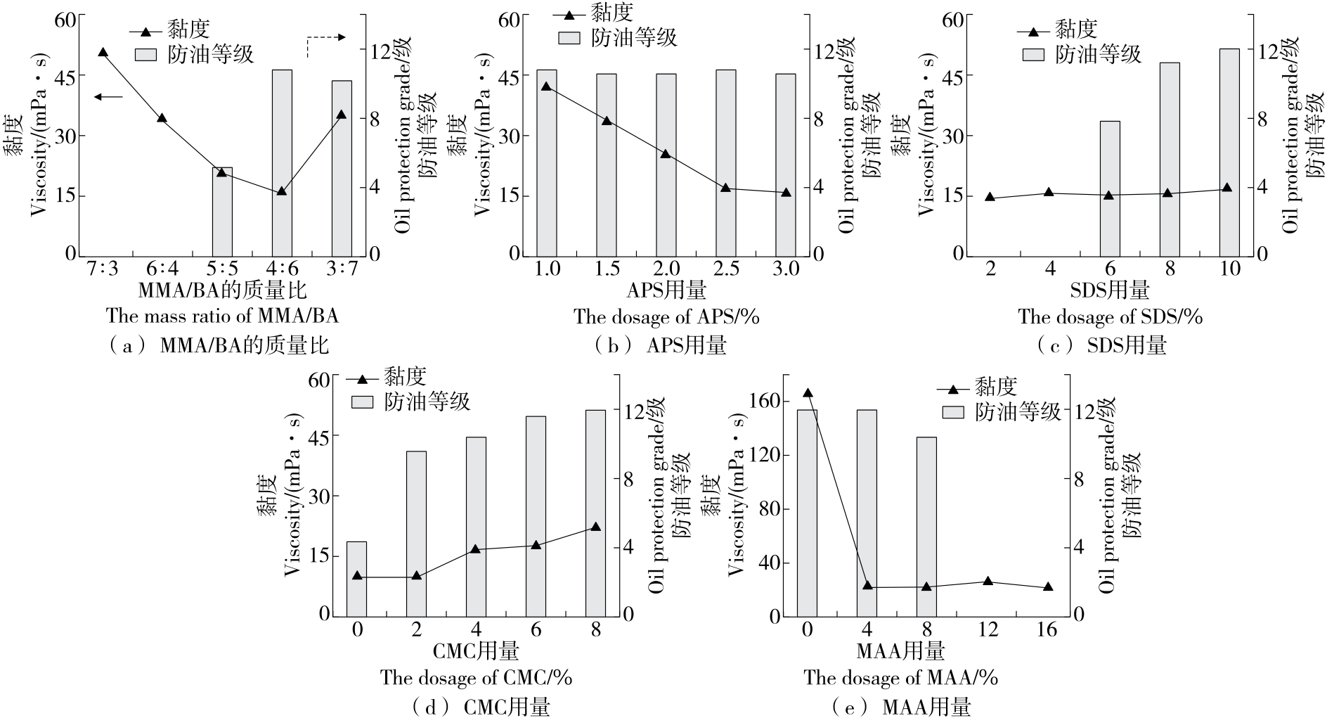 摘要:目的 制备一种新型羧甲基纤维素(CMC)/丙烯酸酯无氟防油剂,将其应用于食品包装中。方法 以CMC、甲基丙烯酸甲酯(MMA)、丙烯酸丁酯(BA)和甲基丙烯酸(MAA)为原料,通过单因素试验优化防油剂的制备工艺,采用傅里叶红外光谱(FTIR)、纳米粒度及Zeta电位分析仪、扫描电镜(SEM)分析防油剂的化学结构、粒径、电荷和成膜性能。采用动态油接触角和防油等级来评价食品包装纸的防油性能。结果 在最优工艺(mMMA∶mBA =4∶6、APS用量为2.5%、SDS用量为10.0%、CMC用量为8.0%、MAA用量为4.0%)下,防油剂平均粒径为66.64 nm、Zeta电位为-21.91 mV,具有良好的成膜性能。当涂布量为6.0 g/m2时,制备的食品包装纸的防油等级可达最高(12.0级),食品包装纸具有良好的可回收性能,纤维回收率可达94.7%。结论 CMC/丙烯酸酯防油剂是一种防油性能良好的无氟防油剂,在食品包装纸中有广阔的应用前景。