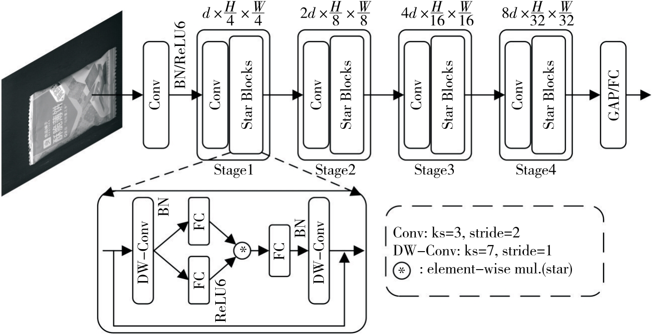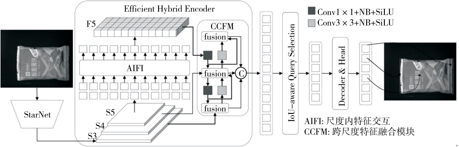 摘要:目的 针对现有食品包装缺陷实时检测模型参数量庞大和计算复杂、在终端设备上部署困难等问题,提出一种基于改进RT-DETR的轻量化模型SGHS-DETR。方法 采用超轻量化网络StarNet作为特征提取主干以降低模型参数,引入基于梯度路径规划的高效聚合模块GELAN进行特征融合并保留语义和细节特征;采用基于小波分解的HWD轻量级下采样模块减少特征信息损失,并替换损失函数为ShapeIoU进一步提升模型的检测精度。结果 SGHS-DETR模型在饼干包装数据集上的平均检测精度达到92.6%,较基准模型参数量和计算复杂度分别降低了65.5%和72.1%,同时检测速度提升了74.4%。结论 SGHS-DETR模型能够快速有效地检测出饼干包装外观缺陷。
