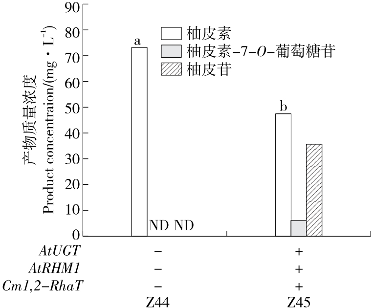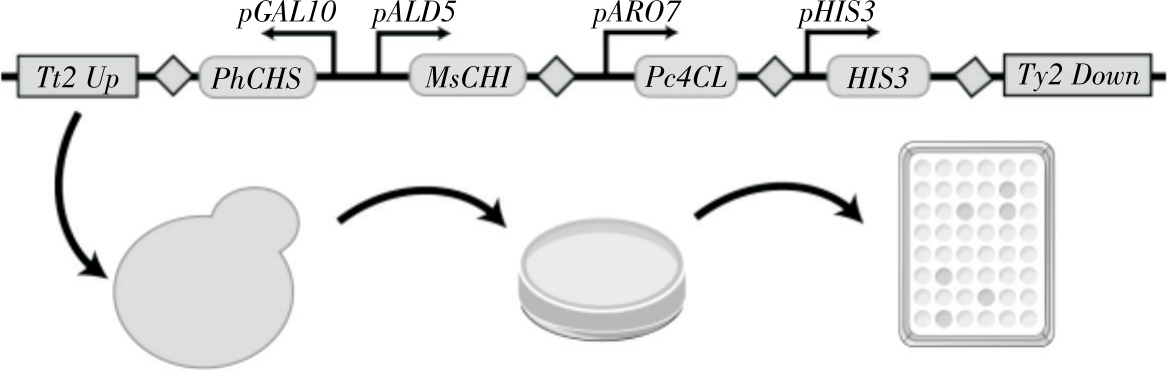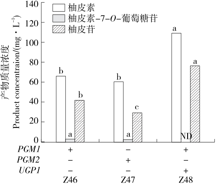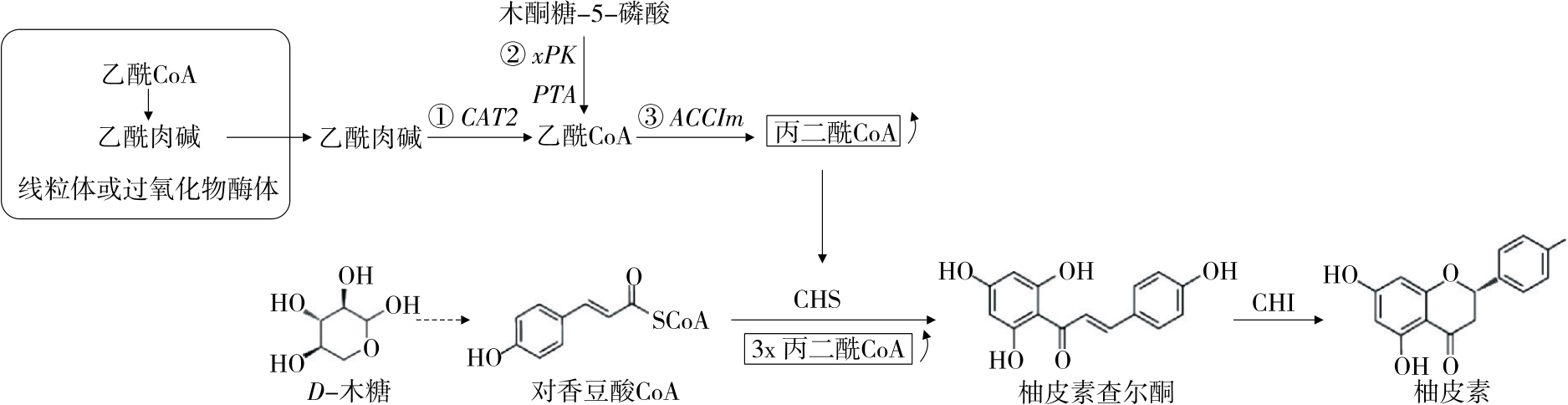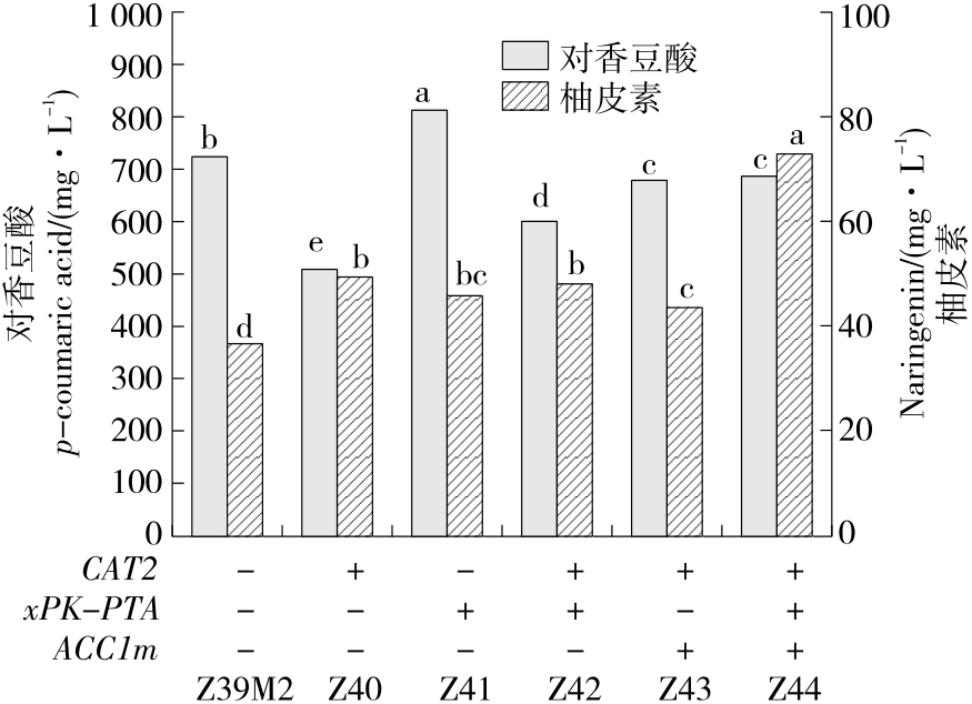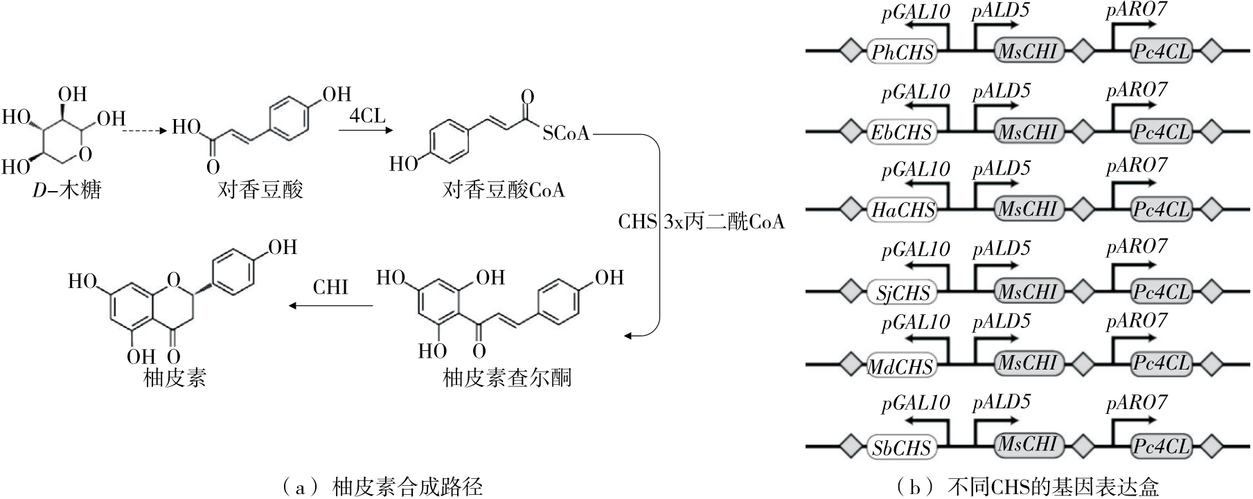 摘要:目的 探索柑橘活性成分柚皮苷的生物合成方法。方法 通过酶筛选、多拷贝整合以及前体供给策略构建合成柚皮素的酿酒酵母工程菌株。在此基础上通过引入柚皮苷合成途径、优化UDP-葡萄糖供应并最终实现从D-木糖合成柚皮苷。结果 通过筛选柚皮素途径关键酶确认最优黄酮合成酶为PhCHS。进一步将柚皮素合成途径整合至多拷贝位点,构建的菌株Z39M2能够合成36.53 mg/L柚皮素;过表达CAT2、xPK-PTA途径和ACC1m优化丙二酰辅酶A供应构建菌株Z44,其柚皮素产量提高至72.96 mg/L;通过引入柚皮苷合成途径成功合成了35.60 mg/L柚皮苷,进一步过表达PGM1和UGP1将柚皮苷产量提升至76.67 mg/L。结论 通过代谢工程策略构建了一株能够从D-木糖合成柚皮苷的酿酒酵母工程菌株。