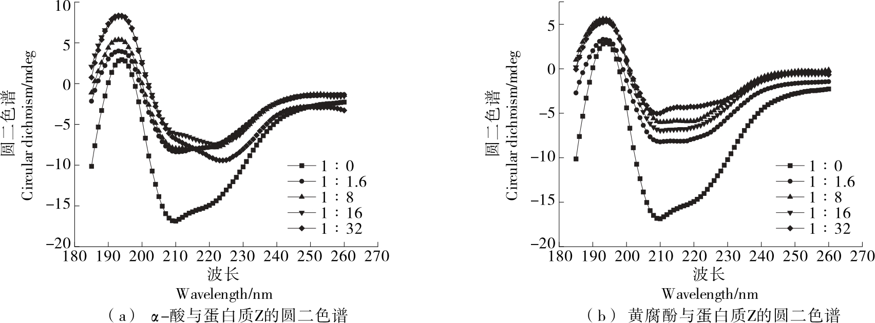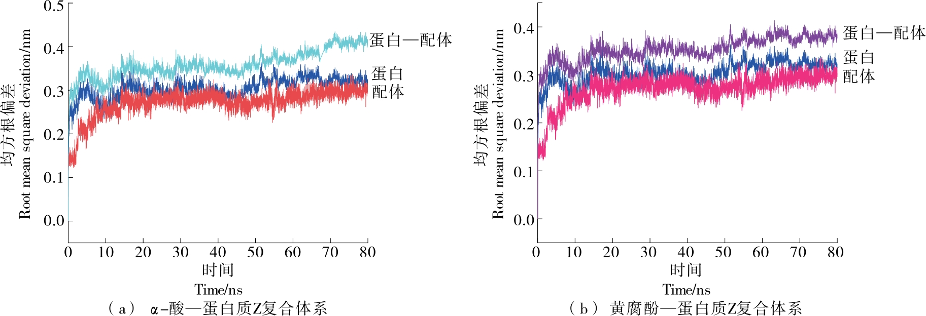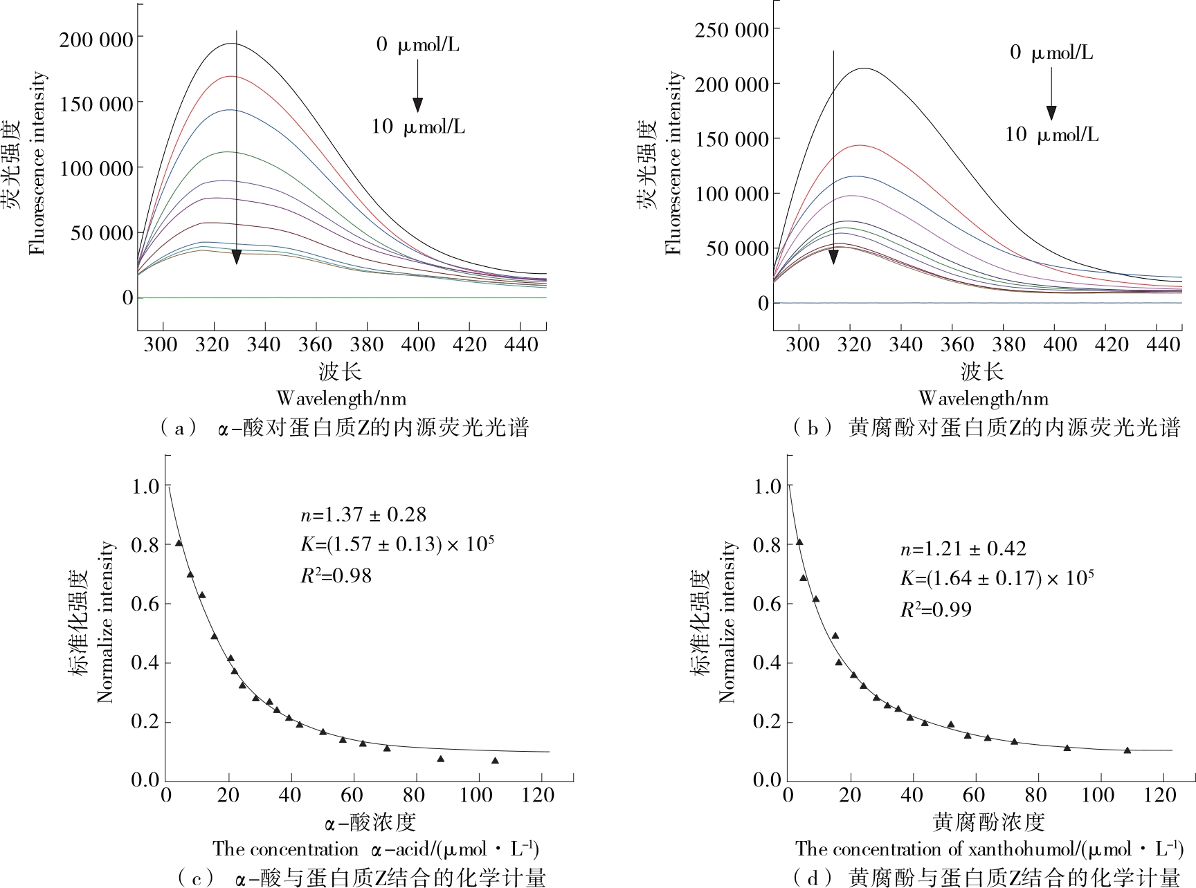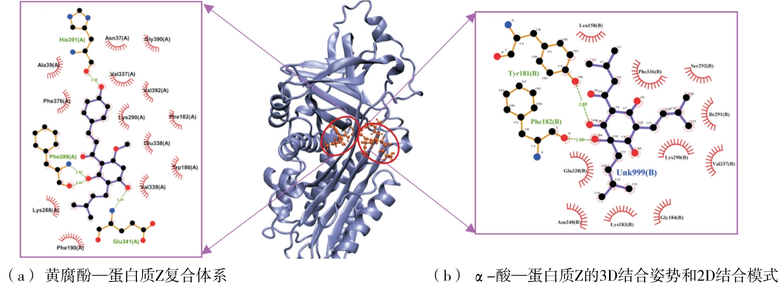 摘要:目的 探究两种结构不同的酒花小分子(α-酸和黄腐酚)与大麦蛋白质Z之间的相互作用机理及两者的构效关系。方法 利用溶剂浸提和阴离子交换柱分别制备了纯度较高的α-酸和蛋白质Z;采用多重光谱表征了α-酸/黄腐酚与蛋白质Z之间的相互作用及蛋白质的构象变化;通过分子动力学模拟对α-酸/黄腐酚与蛋白质Z的交互模式和分子结合机制进一步探究。结果 α-酸和黄腐酚均可猝灭蛋白质Z的内源性荧光,且α-酸表现为红移,黄腐酚表现为蓝移,两种分子的结合化学计量均接近1∶1;分子动力学结果显示,两种酒花小分子与蛋白质Z之间的作用力以氢键和疏水相互作用为主。结论 黄腐酚对蛋白质Z的结合亲和力强于α-酸。