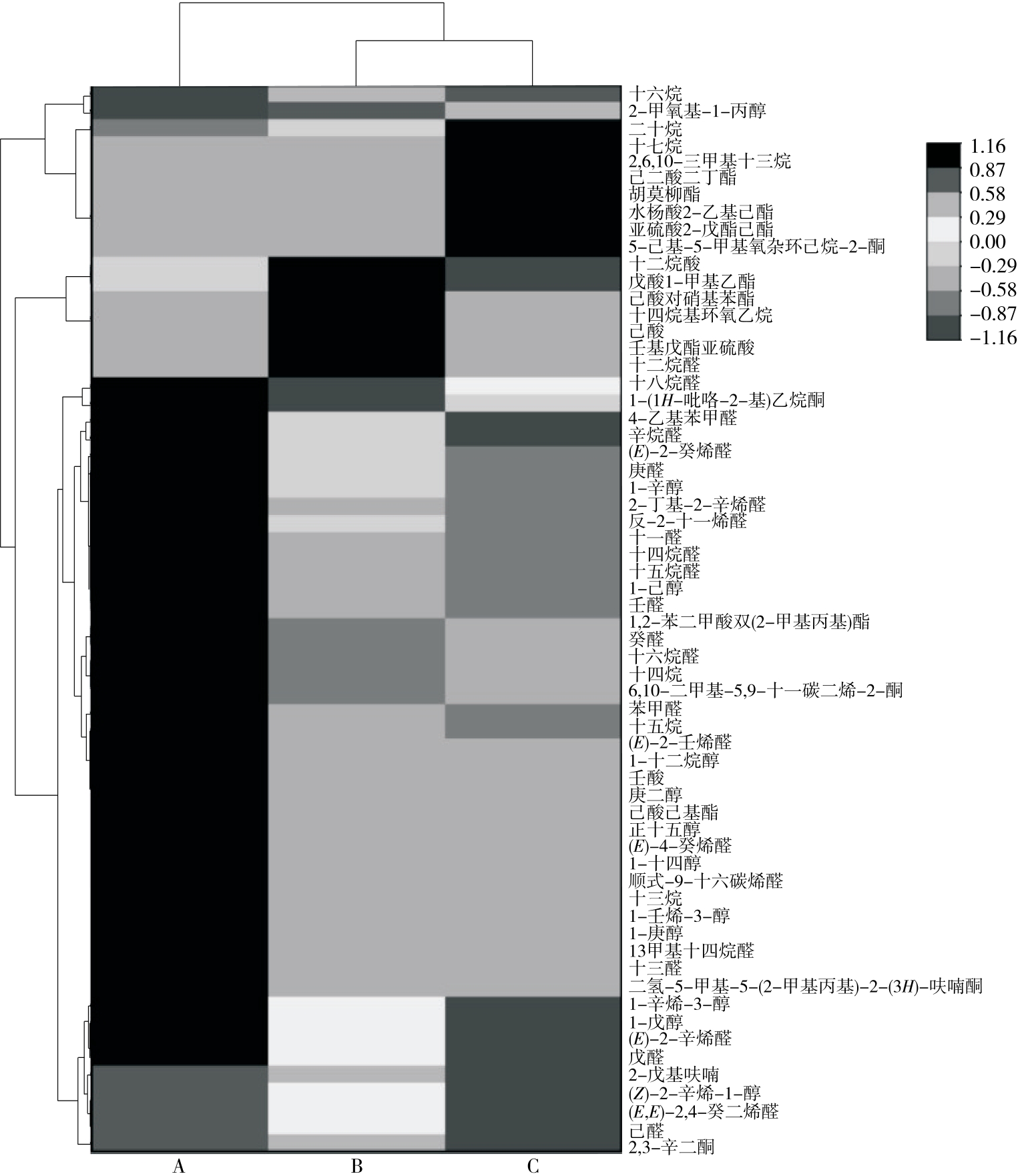 摘要:目的 研究烤制方式对牛肉挥发性风味物质的影响。方法 筛选烤箱烤制、微波烤制、电烤盘烤制3种烤制方式下感官评分最佳的烤制时间,再结合固相微萃取(solid phase microextraction,SPME)、气相色谱—质谱(gas chromatography-mass spectrometry,GC-MS)联用技术对3种烤制方式下牛肉的挥发性风味物质进行分离鉴定。结果 3种烤制方式下牛肉的感官评分均呈先上升后下降趋势,烤箱和电烤盘烤制均在烤制时间为10 min时感官评分最高,微波烤制则在烤制时间为3 min时感官评分最高。3种烤制方式的最优烤制时间下分别鉴定出47,37,31种挥发性化合物,且主要以醛类、醇类、酮类和烷烃类为主。不同烤制方式下的化合物种类和含量存在明显差异,烤箱烤制牛肉的主要香气成分为辛烷醛、(E)-2-癸烯醛和1-辛醇,微波烤制牛肉的主要香气成分为己酸对硝基苯酯、己酸和十二烷酸,电烤盘烤制牛肉的主要香气成分为二十烷、己二酸二丁酯和胡莫柳酯。结论 采用烤箱200 ℃烤制10 min时,检出的风味化合物种类最多,牛肉的风味呈现效果最佳。