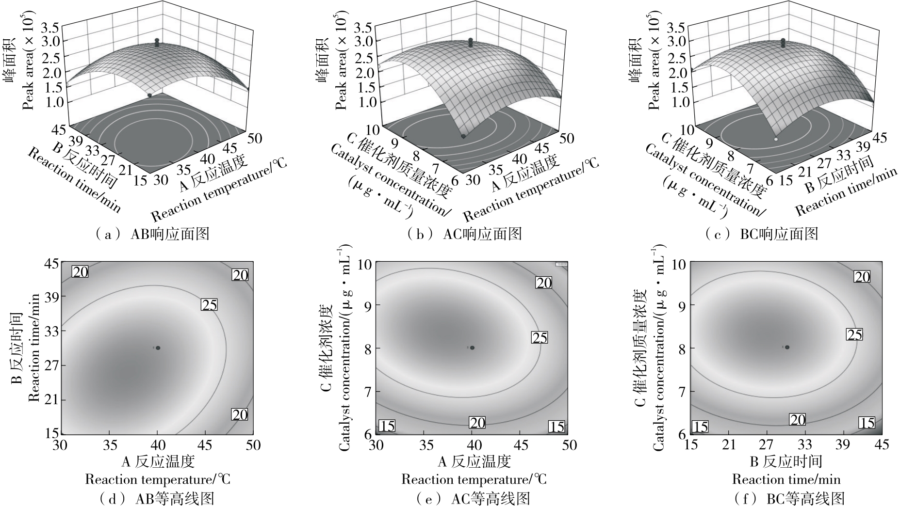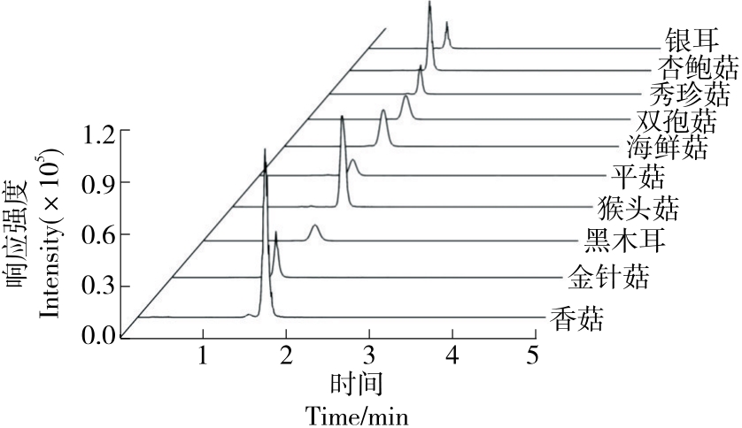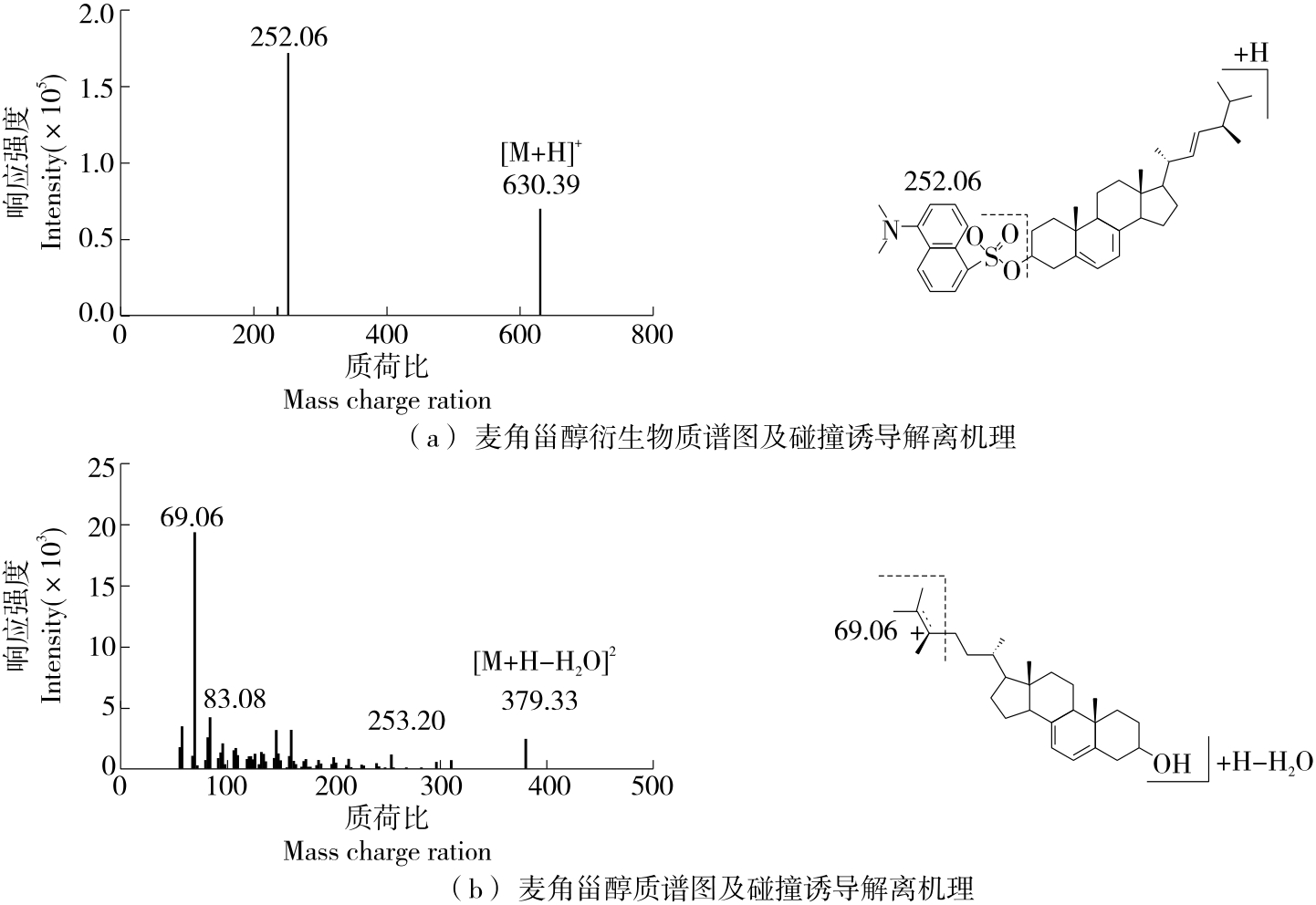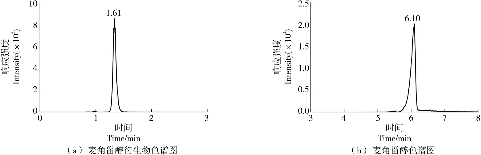 摘要:目的 提高麦角甾醇在电喷雾电离源的响应,并探究麦角甾醇的丹磺酰化衍生方法。方法 以丹磺酰氯为衍生试剂,4-二甲氨基吡啶(DMAP)为催化剂,采用响应面试验优化衍生化条件。采用C18色谱柱分离,0.15%甲酸—甲醇溶液等度洗脱,离子源为ESI源,多反应监测模式检测,并同时测定10种食用菌中麦角甾醇含量。结果 最佳的衍生条件为反应温度36 ℃,反应时间25 min,DMAP质量浓度8 μg/mL。麦角甾醇衍生后的线性范围为25~2 000 ng/mL,检出限为13.4 ng/mL,定量限为149 ng/mL,灵敏度较衍生前提高了51.94倍。10种食用菌中,香菇中的麦角甾醇含量最高,为(4.21±0.083) mg/g。结论 试验方法操作简单,具有较高的灵敏度和准确性。