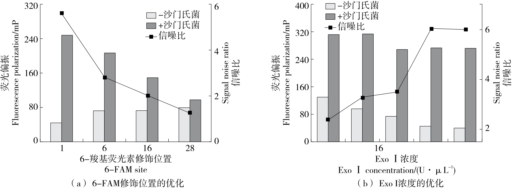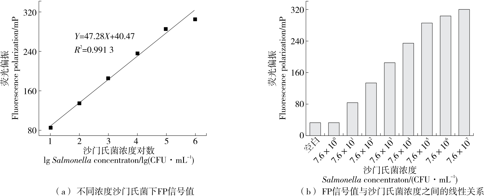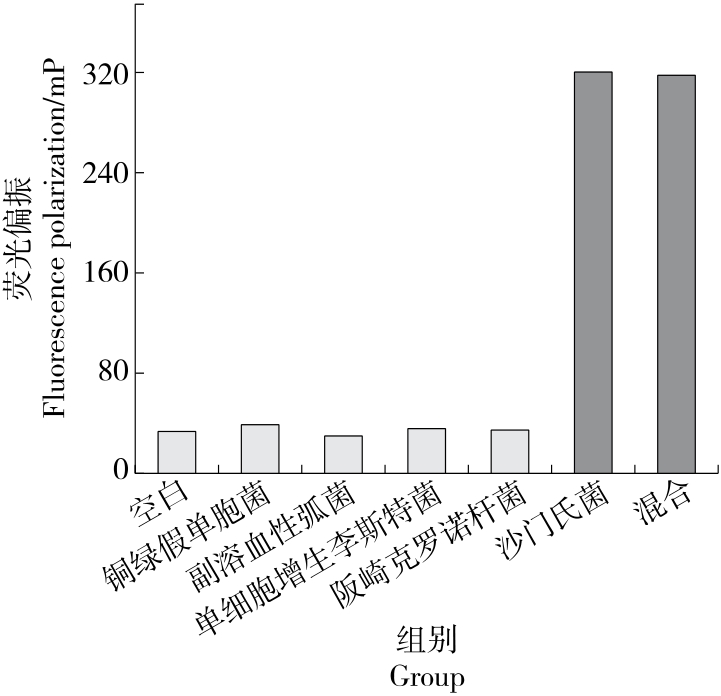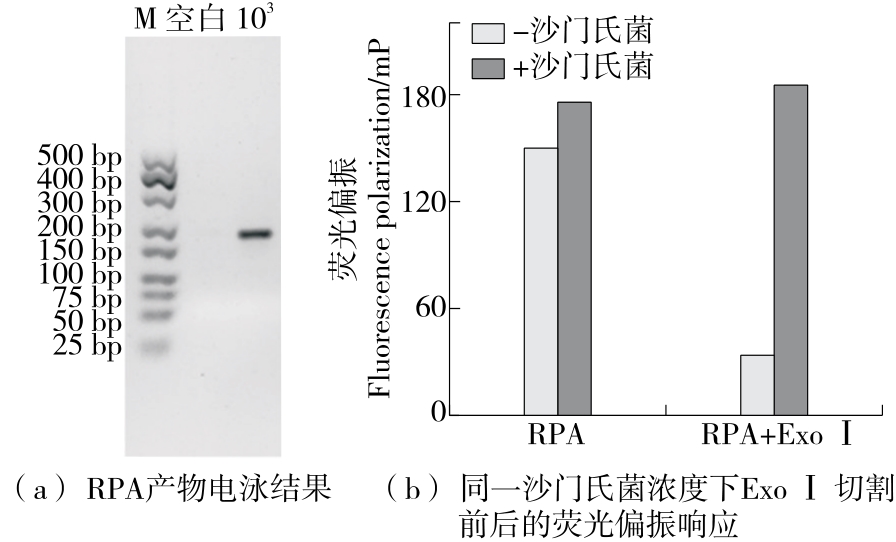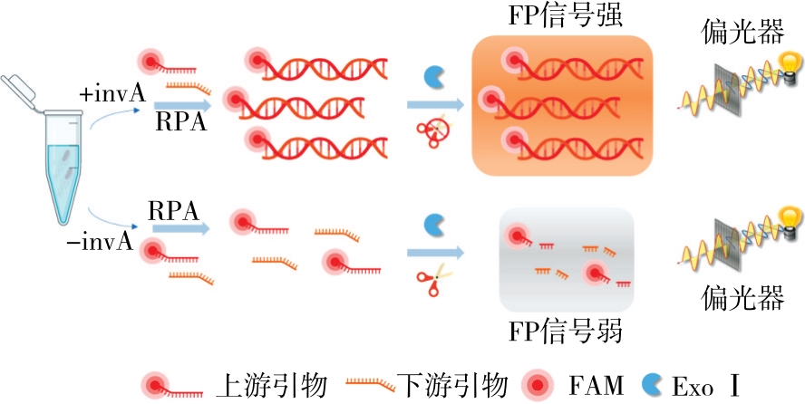 摘要:目的 提出一种新型荧光偏振(FP)检测策略,通过整合重组酶聚合酶扩增(RPA)技术,实现对沙门氏菌(Salmonella)的高灵敏度检测。方法 该检测机制依赖于靶标DNA与特异性引物的同源序列识别:当沙门氏菌靶标存在时,引物与靶DNA结合并触发链置换反应,进而启动DNA扩增过程。为提高检测灵敏度,系统采用两项关键设计:在引物5'端修饰6-羧基荧光素(6-FAM)作为荧光报告基团;引入核酸外切酶Ⅰ(Exo Ⅰ)选择性水解未结合的引物。结果 在RPA扩增过程中,由于扩增产物的相对分子质量显著增加,6-FAM标记的DNA复合物的旋转自由度受到限制,导致荧光偏振信号显著增强。经条件优化后,该方法对沙门氏菌的检测限可达11 CFU/mL,且表现出优异的特异性。结论 该方法可高效检测沙门氏菌,其模块化设计原理还可拓展应用于其他食源性病原体的快速诊断。
