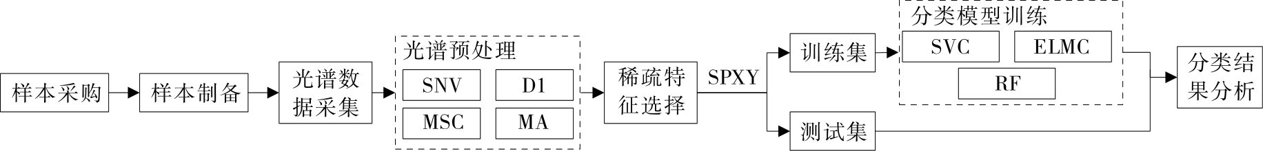 摘要:目的 利用高光谱技术结合稀疏高光谱特征选择实现牛肉糜中掺入豌豆蛋白、鸭肉糜、鸡肉糜、猪肉糜的高准确率检测。方法 提取牛肉糜样本原始光谱数据,采用标准正态变量变换(SNV)、多元散射校正(MSC)、一阶微分(D1)、移动平均(MA)预处理方法对光谱数据进行处理。设计一种基于稀疏表示的高光谱特征选择算法,该算法构建稀疏降维框架,并采用群智能优化对光谱特征选择目标函数进行优化求解,在保持数据多样性的同时最大程度地降低光谱数据维度。分别建立基于稀疏高光谱特征选择的极限学习机分类(ELMC)、随机森林(RF)和支持向量机分类(SVC)的掺假分类检测模型,并分析多高光谱数据融合对检测结果的影响。结果 相比于全波段,基于稀疏特征选择的3种检测模型的分类准确率分别提高了2.33%,1.86%,2.01%,且优于基于连续投影(SPA)特征提取、自适应重加权采样(CARS)特征提取建立的检测模型。采用SNV、MSC预处理组合光谱数据的检测分类准确率最高,相比单一光谱数据分类准确率分别提高了0.79%,0.64%,0.65%。结论 所提方法实现了对牛肉糜掺假的有效检测。