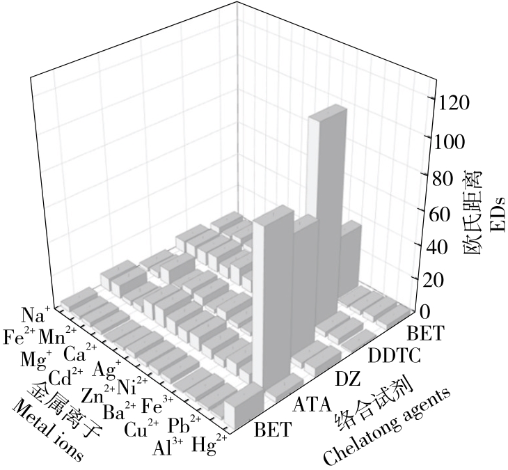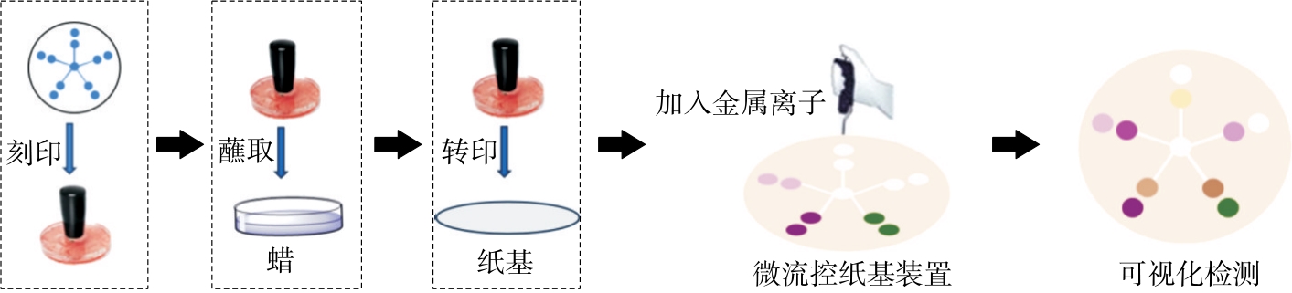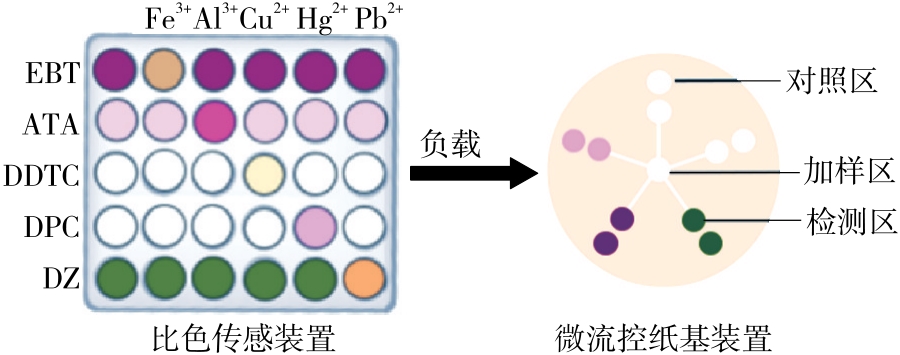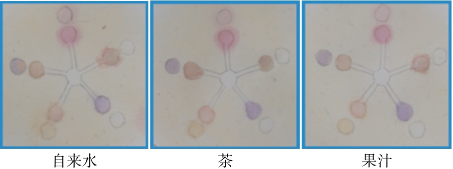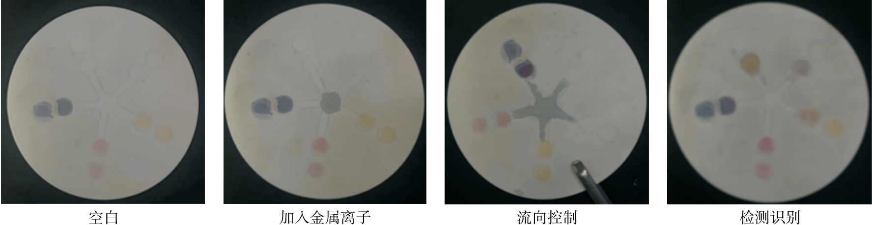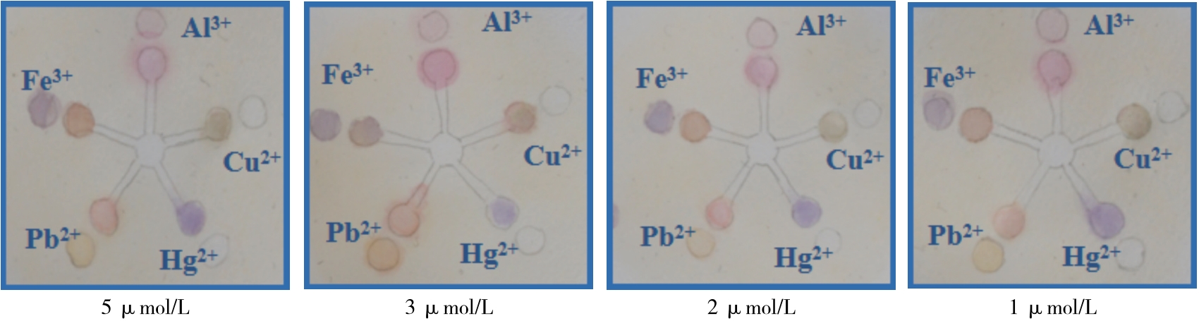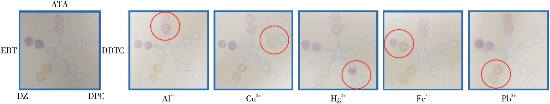 摘要:目的 设计一种微流控纸基装置,探究其对汞、铅、铝、铁、铜离子的定性检测能力及对实际样品的检测能力。方法 通过组合玫红三羧酸铵(ATA)、双硫腙(DZ)、二苯偶氮碳酰肼(DPC)、二乙基二硫代氨基甲酸钠(DDTC)和铬黑T(EBT)5种络合试剂与掩蔽剂构建微流控纸基装置,并结合反应前后的欧氏距离(ED)对反应进行追踪。结果 目标金属离子与纸基装置快速(10 s)响应可产生明显色变。在其他常见金属离子的干扰下,该装置仍表现出较好的选择性。该纸基具有在实际样品(自来水、茶、果汁)中检测的能力。结论 该方法制备简单、便携、响应快速,可实现对汞、铅、铝、铁、铜离子的定性检测。