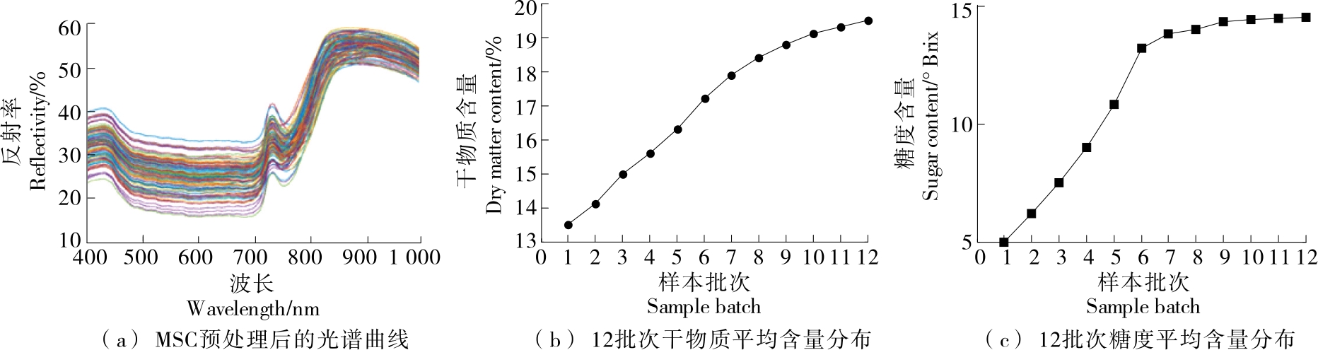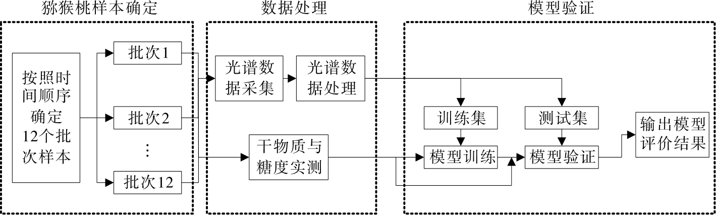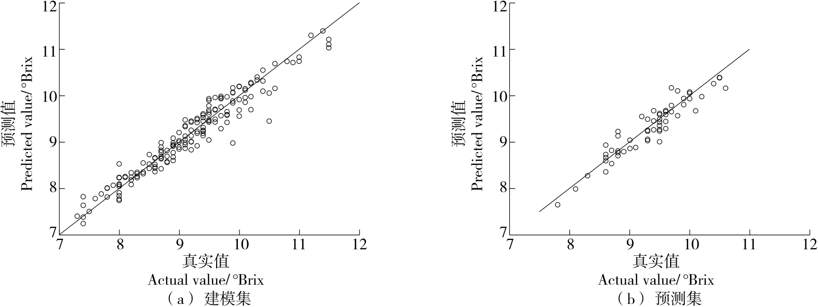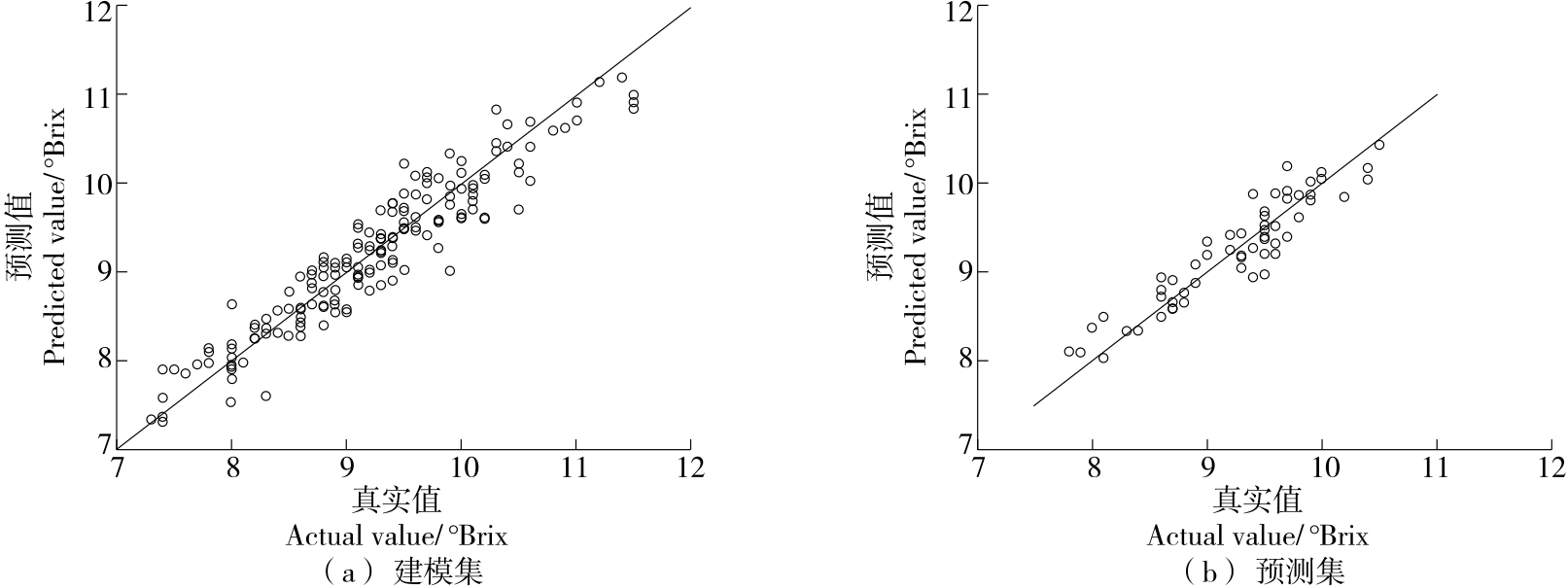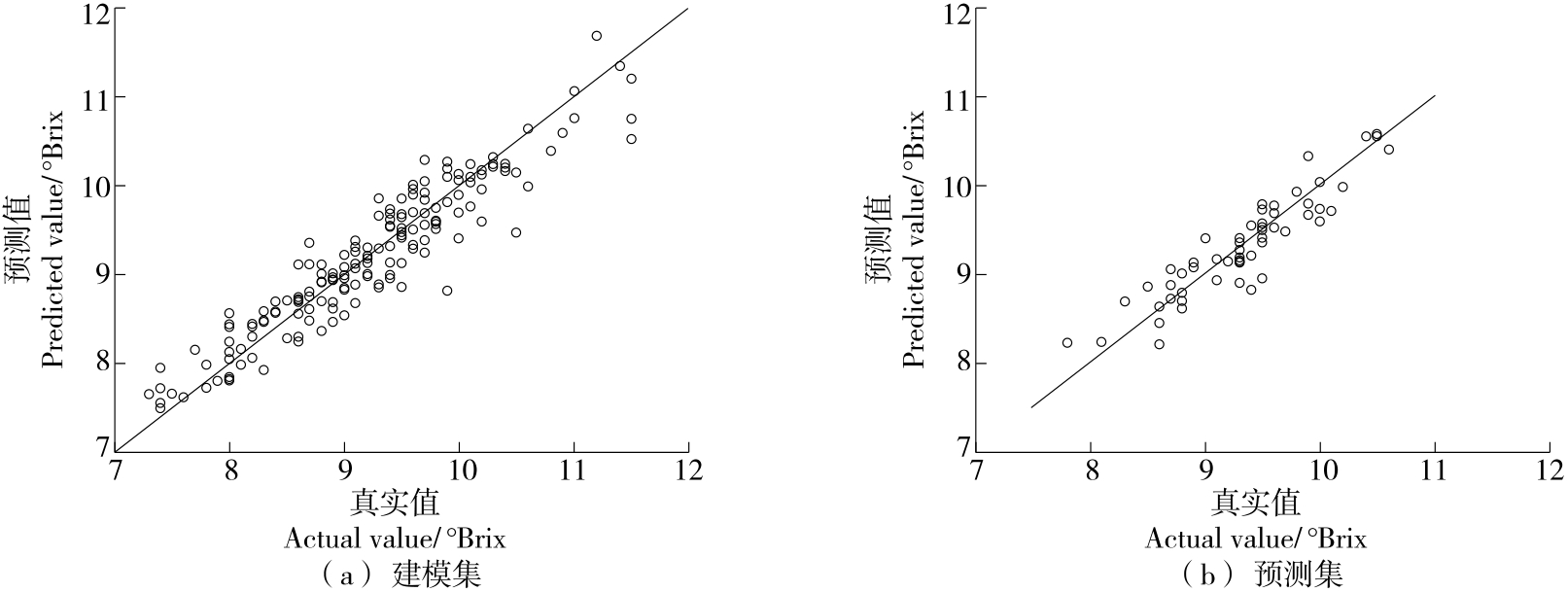摘要:目的 降低柑橘糖度检测分析过程的复杂度、提高检测糖度准确度及减小检测过程的破坏性。方法 设计一种基于可见近红外反射光谱的柑橘糖度在线检测装置。以云南金牛柑橘为研究对象,采用光谱—理化值共生距离(SPXY)划分分类方法建立建模集和验证集,分别对比分析了多元散射校正(MSC)、标准正态变换(SNV)和卷积平滑(SG)等方法预处理后的偏最小二乘回归(PLS)建模检测效果,确定最佳预处理方法。并对比研究了连续投影算法(SPA)、竞争性自适应重加权算法(CARS)和随机蛙跳算法(RF)对预处理后的光谱数据进行特征波段提取,筛选出合适的特征波长点,建立PLS预测模型。结果 采用SG+MSC+CARS处理筛选出的95个特征波长点建立的PLS模型预测效果最好,其Rc和Rp分别为0.913和0.881、RMSEC和RMSEP分别为0.274和0.207、RPD为2.114。结论 该方法有效降低了柑橘糖度检测过程的复杂性,提高了检测准确度并减小了检测破坏性。