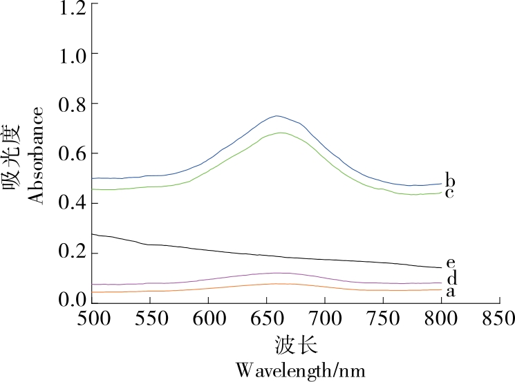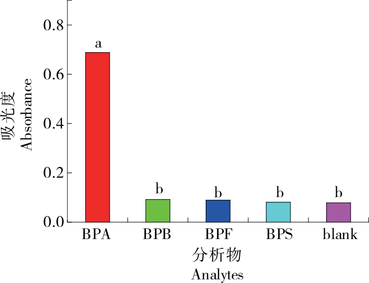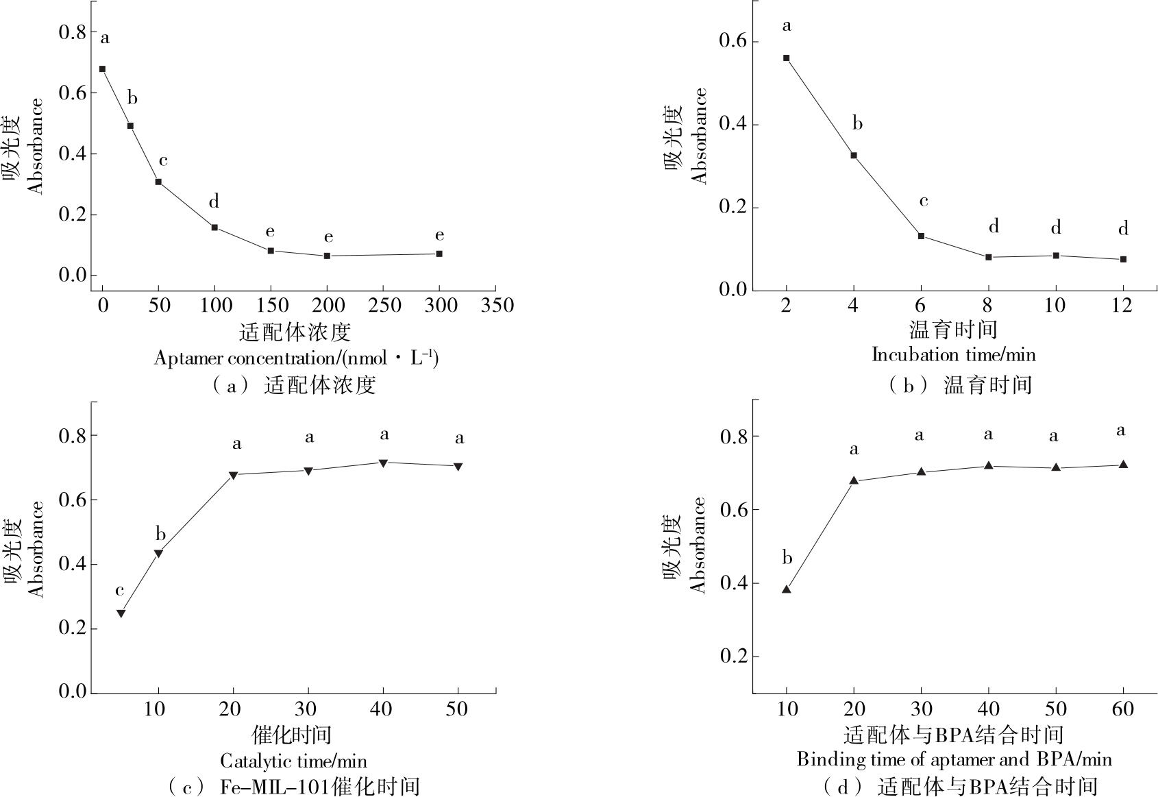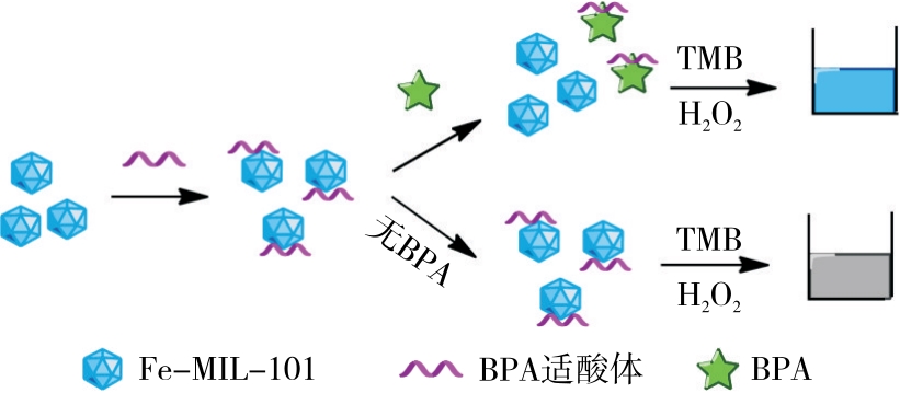 摘要:目的 以双酚A核酸适配体为识别分子,金属有机框架(Fe-MIL-101)纳米模拟酶为信号探针,建立了一种无标记、可视化快速检测双酚A(BPA)的新方法。方法 将BPA适配体添加到Fe-MIL-101溶液中,适配体通过静电相互作用吸附到Fe-MIL-101表面,进而抑制其模拟酶活性,当测试样品中含有BPA时,适配体特异性结合BPA,适配体从Fe-MIL-101表面脱落,Fe-MIL-101催化无色过氧化物酶底物产生比色输出信号,通过比色信号的变化实现对BPA的定性和定量分析。结果 在优化条件下,BPA在缓冲液中线性检测范围为1~80 ng/mL,裸眼可视化检出限为0.5 ng/mL。将该方法应用于牛奶和奶粉中BPA检测,加标回收率为83.6%~95.2%,RSD值为2.96%~7.45%。结论 该方法具有简便、快速、准确性高等特点,具有良好的应用前景。