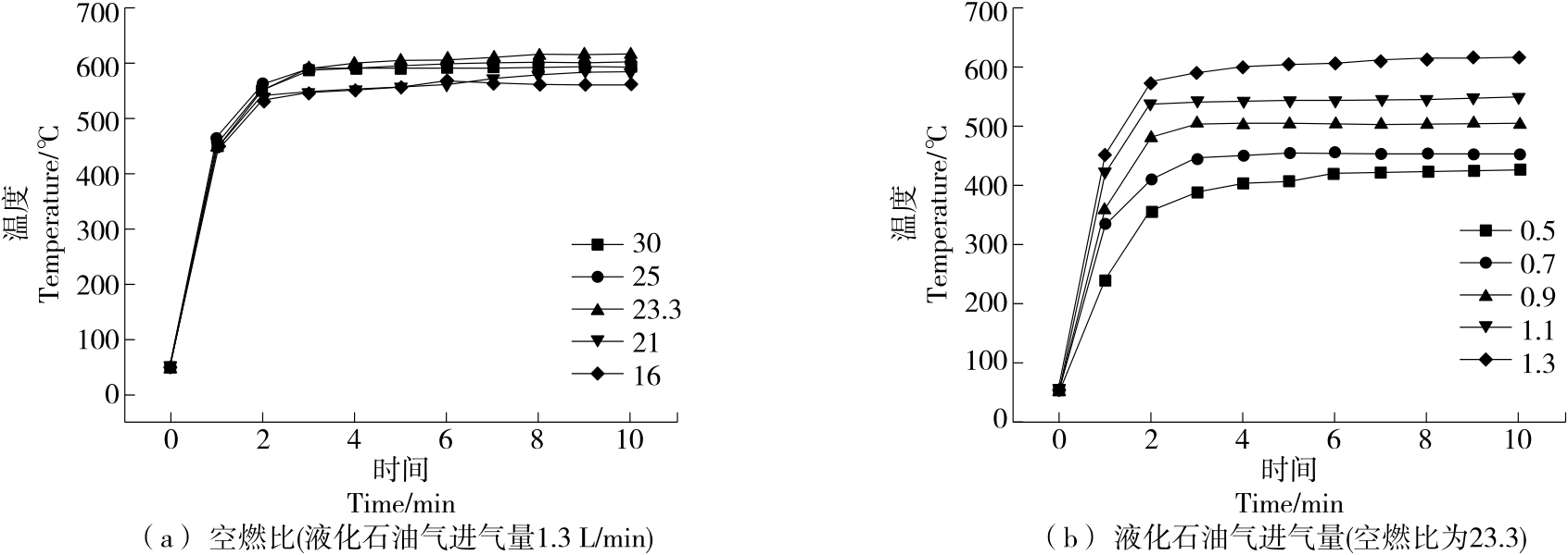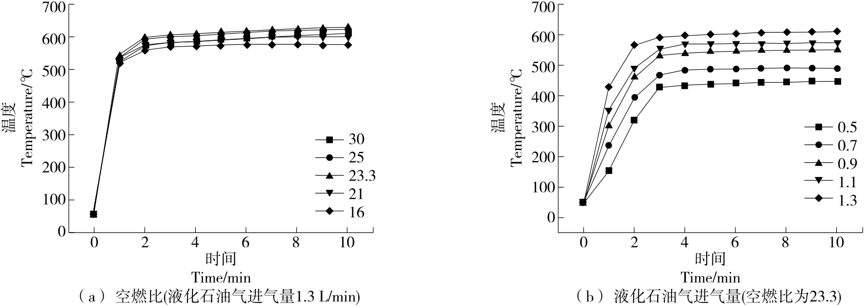 摘要:目的 改进催化式红外发射器的加热温度分布不均、燃烧效率低于预期等问题。方法 提出了改进空气和燃气的混合方式和优化混合比例(空燃比)的研究方案。通过热电偶测量不同工作条件下发射器表面的温度,以表面平均温度、最高温度、温度标准差以及升温曲线为指标,进行优化试验。结果 与腔内混合相比,腔外预混可以提高发射器表面平均温度约50 ℃,提高最高温度约16 ℃,降低表面温度标准差约17%,在空燃比较小的情况下,可以略微缩短升温所需时间。以液化石油气为1.3 SLPM、空燃比为23.3为例,在腔内混合的情况下平均温度为527.3 ℃、最高温度为615.2 ℃;在腔外预混的情况下平均温度为559.1 ℃、最高温度为647.4 ℃。结论 腔内混合和腔外预混两种方式中,最佳的空气与液化石油气的混合方式为腔外预混,最佳空燃比为23.3。