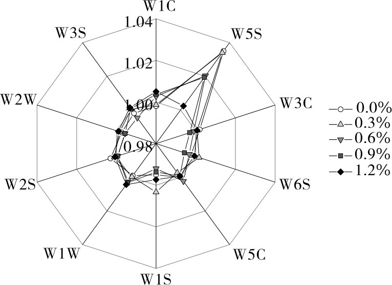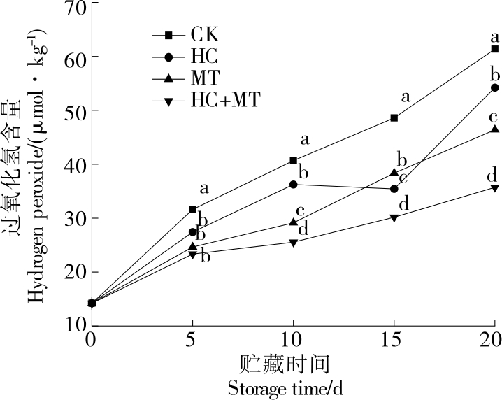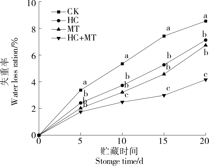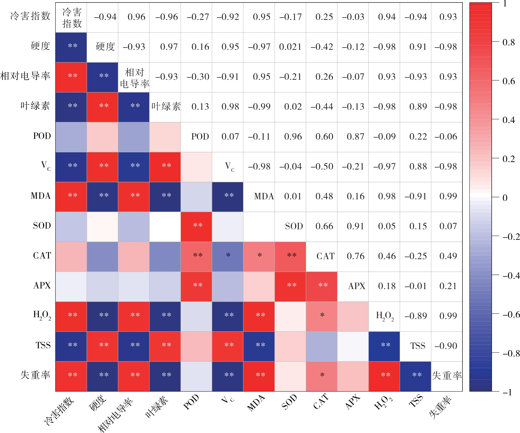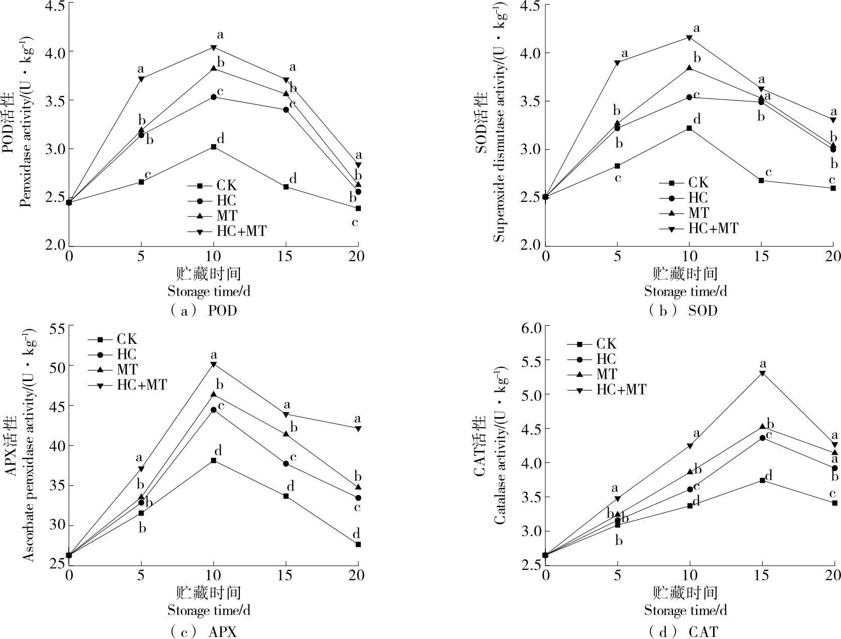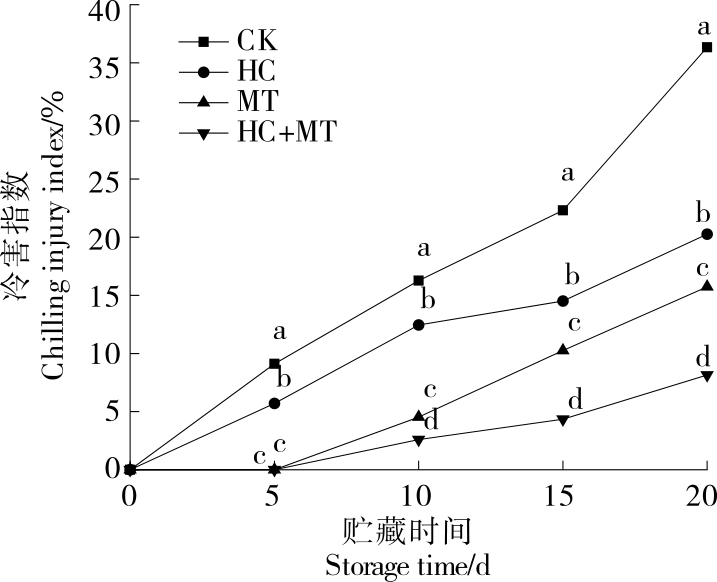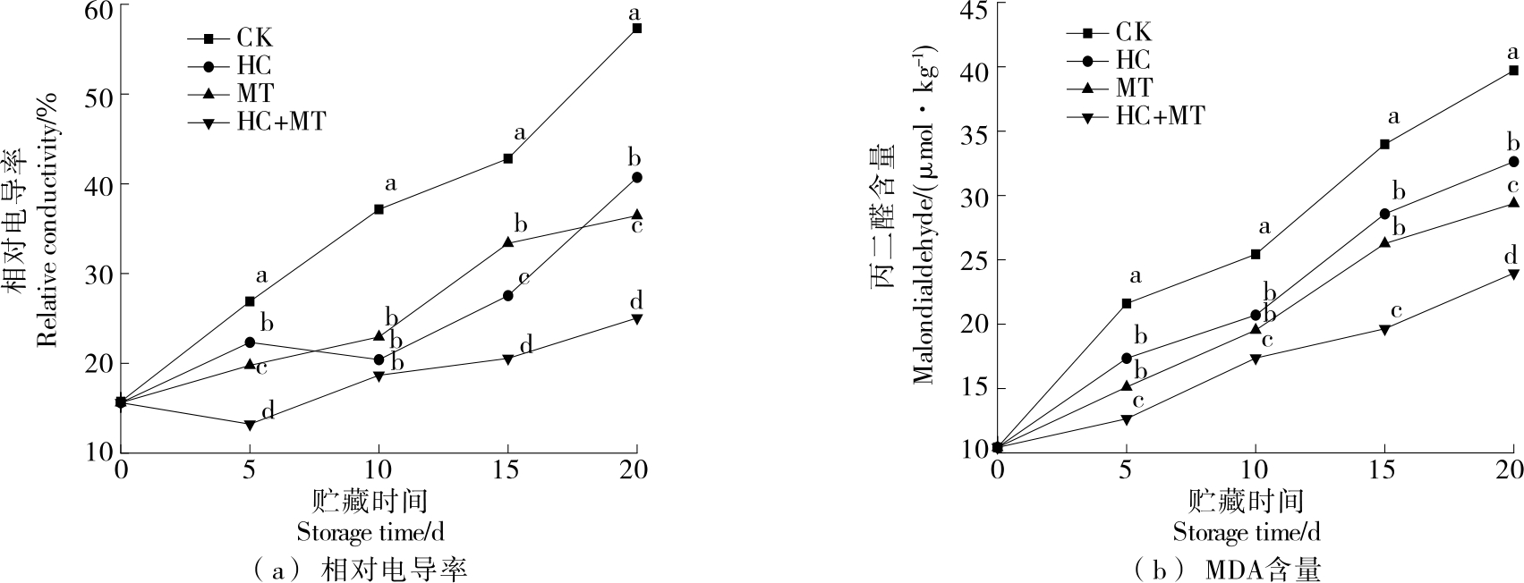 摘要:目的 减少青椒采后低温贮藏过程中冷害的发生。方法 以青椒为试验材料,对热激(HC)和褪黑素(MT)复合处理的青椒样品在(4±1) ℃和85%~90% RH贮藏过程中的冷害指数、相对电导率、丙二醛、H2O2含量、抗氧化酶活性和品质指标及相关性进行研究。结果 HC复合 MT处理使冷害出现时间推迟了5 d,失重率降低了52.4%,H2O2含量降低了71.75%,有效抑制了青椒相对电导率的增加和MDA的积累,POD、SOD、APX和CAT抗氧化酶活性分别提高了0.45,0.71,14.50,0.86 U/kg。同时,复合处理也较好地保持了青椒的硬度、TSS、叶绿素和维生素C含量且各指标之间均存在相关性。结论 HC复合MT处理能有效降低青椒冷害现象的发生。