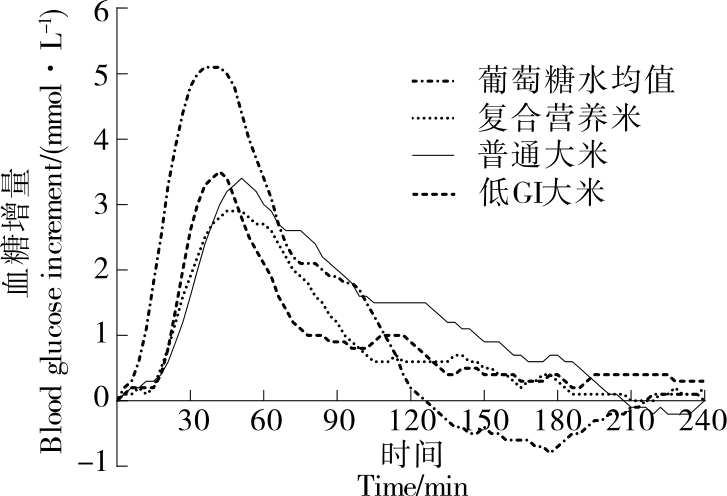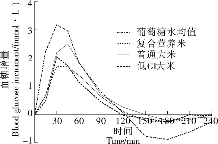 摘要:目的 探究动态血糖监测系统(continuous glucose monitoring system,CGMS)对进食糖缓释主食餐后血糖波动的影响及特点。方法 共纳入8名健康成年受试者,进行为期15 d的连续血糖监测(continuous glucose monitoring,CGM)并采集餐后静脉血样以观察血糖波动情况。试验期间,受试者在第2天和第14天早晨空腹分别摄入葡萄糖水(对照食物),第5、8、11天早晨空腹分别摄入糖缓释主食、普通大米和低GI高抗性淀粉大米,持续监测餐后4 h动态血糖变化及测定静脉血血糖值。监测指标包括葡萄糖目标范围内时间(time in range within 4 h postprandial,TIR4h)、血糖恢复至空腹水平时长(time to return to fasting blood glucose levels within 4 h postprandial,Tb4h)、血糖生成指数(4-h postprandial glycemic index,GI4h)及食物血糖负荷(4-h postprandial glycemic load,GL4h)。结果 在5次食物测试中,葡萄糖水平均TIR4h为85.6%,而糖缓释主食的餐后TIR4h达到了100%,显著高于葡萄糖水(P<0.05)且优于其他2种食物。葡萄糖水的平均Tb4h值为112 min,糖缓释主食为167 min,显著高于葡萄糖水(P<0.05)。动态血糖监测3种受试食物GL4h结果分别为55,60,47,普通大米与糖缓释主食GL4h值高于低GI高抗性淀粉大米,静脉血血糖监测3种受试食物GL4h结果分别为52,64,40,普通大米与糖缓释主食GL4h值显著高于低GI高抗性淀粉大米(P<0.05)。基于以上结果,糖缓释主食的TIR4h值为100%,显著高于葡萄糖水且优于其他2种食物,Tb4h值为167 min显著高于葡萄糖水,GL4h值显著高于低GI抗性淀粉大米。结论 糖缓释主食能够显著降低人体餐后血糖波动幅度,同时保证足够的能量供应。