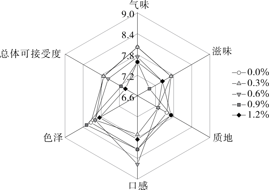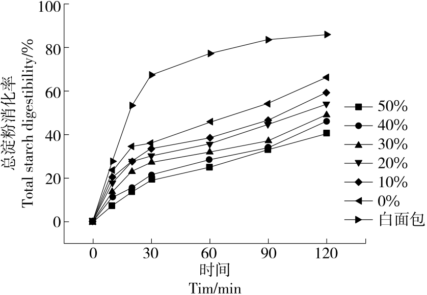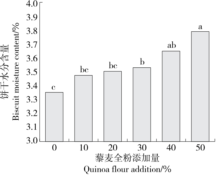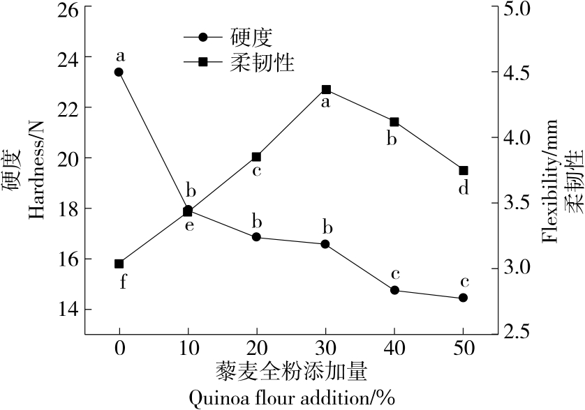 摘要:目的 探究藜麦全粉添加量对饼干品质和体外消化特性的影响。方法 在小麦粉中添加不同比例(0%,10%,20%,30%,40%,50%)的藜麦全粉,考察藜麦全粉添加量对饼干品质和体外消化特性的影响。结果 与未添加组相比,随着藜麦全粉添加量的增加,藜麦饼干的水分含量逐渐升高,硬度逐渐下降,柔韧性先增大后减小,当藜麦全粉添加量为30%时,饼干的柔韧性最大;随着藜麦全粉添加量的逐渐增加,饼干的风味发生显著性变化(P<0.05),感官评分和总淀粉水解率逐渐降低。当藜麦全粉添加量>20%时,饼干的血糖生成指数(GI)值低于55,为低GI食品。结论 添加藜麦全粉可降低饼干的体外消化率和血糖生成指数。