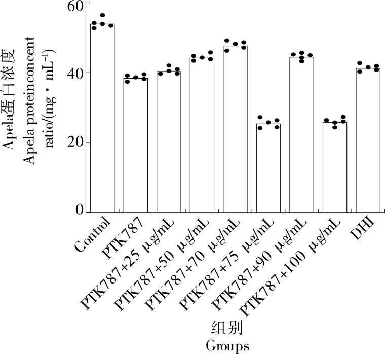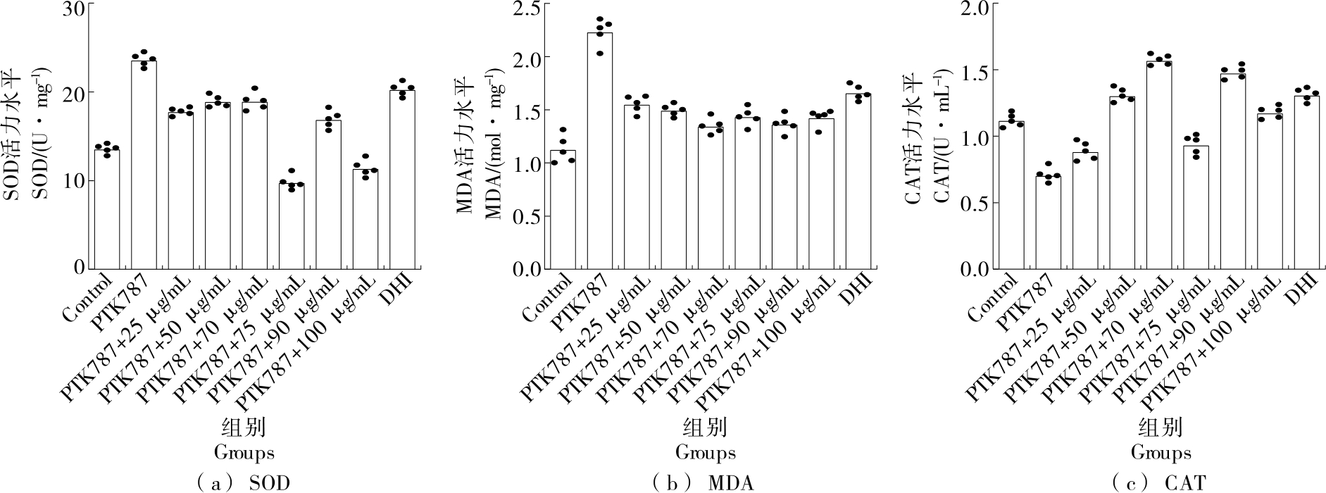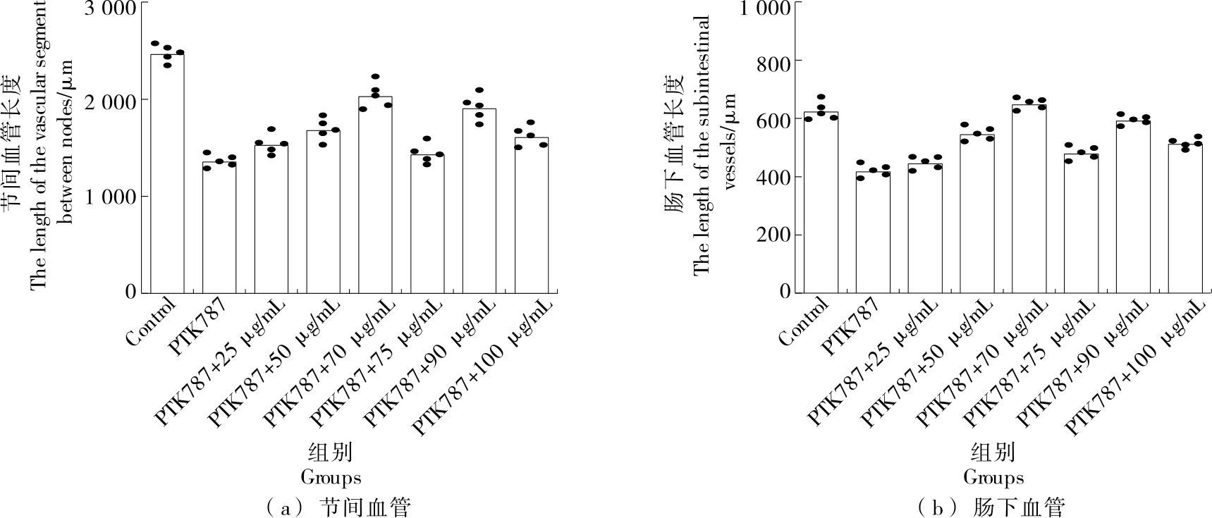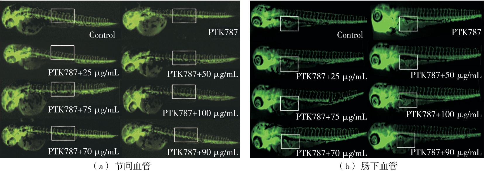 摘要:目的 探究文冠果油(XSO)对斑马鱼血管再生的促进作用及其作用机制。方法 利用PTK787诱导斑马鱼血管缺陷模型,设置不同质量浓度XSO(0,25,50,75,100 μg/mL)干预,通过荧光显微成像分析节间血管(ISV)和肠下血管(SIV)再生情况,检测氧化应激指标(SOD、MDA、CAT)及Apela蛋白表达水平,并以丹红注射液为阳性对照。结果 75 μg/mL XSO组促血管再生效果最佳:ISV长度恢复至正常组的87.6%(2 234.5 μm vs. 2 550.1 μm),SIV长度达正常组的105%(662.8 μm vs. 627.9 μm),均优于阳性对照组(ISV:93.7%;SIV:98.2%)。氧化应激指标显著改善:SOD活性(19.03 U/mg)为正常组的1.41倍,MDA含量(1.305 nmol/mg)降至模型组的56.6%(阳性组1.658 nmol/mg);CAT活性(1.623 4 U/mL)为正常组的1.53倍(阳性组1.32倍)。Apela蛋白表达达49.327 ng/mL,为模型组的1.26倍(阳性组1.18倍)。结论 XSO通过调控氧化应激和上调Apela蛋白表达促进血管再生,其效果优于丹红注射液且无过度血管生成风险。