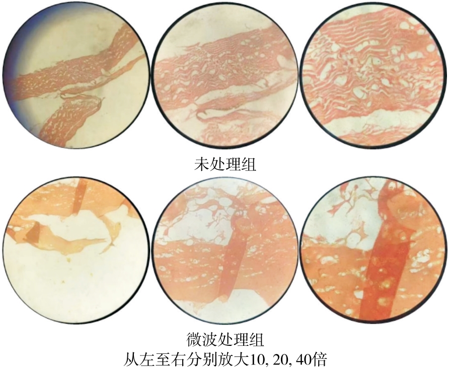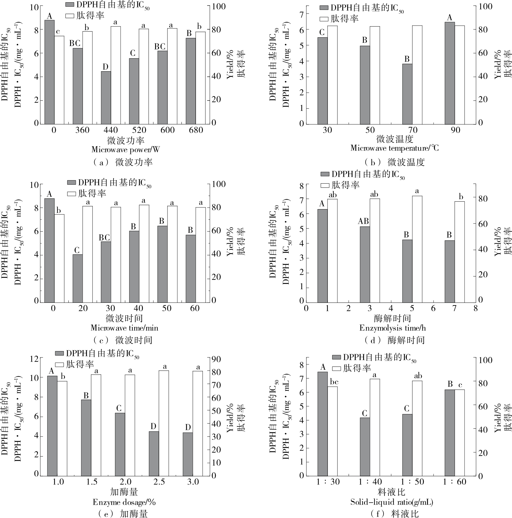 摘要:目的 通过微波辅助酶解法制备罗非鱼皮抗氧化肽并进行结构分析。方法 通过单因素和响应面试验优化微波预处理辅助碱性蛋白酶水解法制备抗氧化肽工艺条件,并分析微波处理对鱼皮结构、抗氧化肽的相对分子质量及氨基酸组成与抗氧化活性的影响。结果 微波辅助酶解制备抗氧化肽的最优工艺条件为微波功率441.50 W、微波温度61.00 ℃、微波时间20 min、酶解时间6.21 h、加酶量2.20%、料液比1∶40 (g/mL),此时罗非鱼皮抗氧化粗肽得率和抗氧化活性相比对照组分别提高了8.23%和54.89%。经微波预处理的罗非鱼皮的硬度、胶黏性和咀嚼性相比对照组均显著降低,且罗非鱼皮胶原纤维更加分散和疏松。结论 微波预处理后可得到相对分子质量<1 000,具有高含量的组氨酸、苯丙氨酸、酪氨酸和半胱氨酸,且抗氧化活性较高的肽。